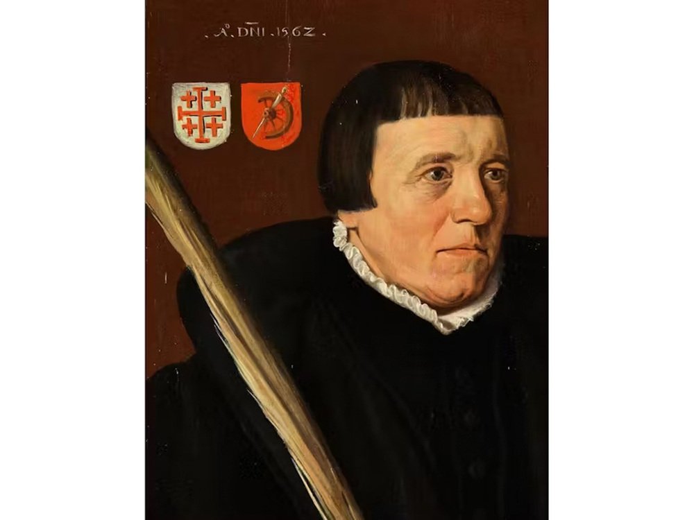Against an indeterminate background, the hip portrait of a middle-aged man turned to the right, wearing a dark coat and a low white lace collar, holding a scroll in one hand. In the other hand, the sitter carries a palm branch, which members of the brotherhoods used to carry as an attribute during the Palm Sunday procession. The palm branch as an attribute is known in particular from areas where there were also brotherhoods - in group portraits of the Jerusalem Brotherhood, which are also structured like processions, all the figures depicted carry a palm branch. In addition, the person depicted here is honoured as a member of the Jerusalem Brotherhood. The Jerusalem Cross is depicted twice in this painting. Once in the form of a chain pendant and once in the form of a coat of arms shield at the top left as a red Jerusalem Cross on a silver shield. Such a pendant in the form of a Jerusalem Cross in gold was awarded after being knighted at the Holy Sepulchre. Pilgrims who were not knighted probably had the Jerusalem Cross sewn onto their clothing, so that they are also easily recognisable in the group portraits of the Jerusalem Brotherhood. To the right of the coat of arms is another red-ground coat of arms with a half wheel and dagger. This indicates a pilgrimage to St Catherine's Monastery on Mount Sinai. Only half a wheel is depicted, which indicates that the pilgrim probably did not go to Sinai. In fact, over time it was also possible to be knighted as St Catherine elsewhere (Cyprus, Bethlehem), as Sinai was difficult to access. At the top left is the date, which refers to the year of the painter's death ‘A°.DNI.1562’. At the top right is the inscription indicating the age of the sitter ‘AETATIS.MEAE 54’.