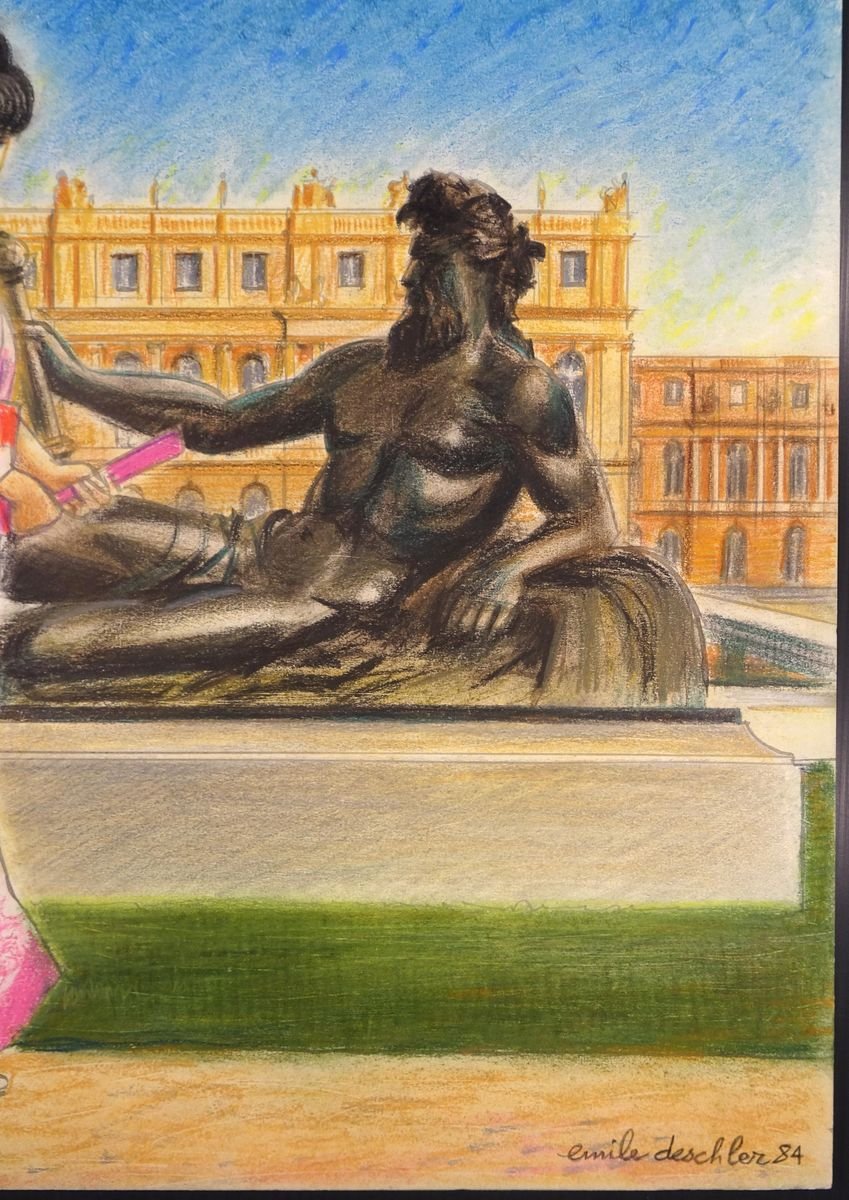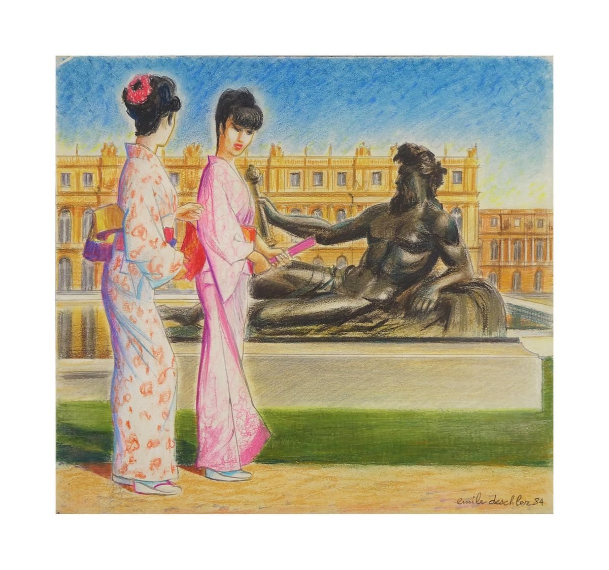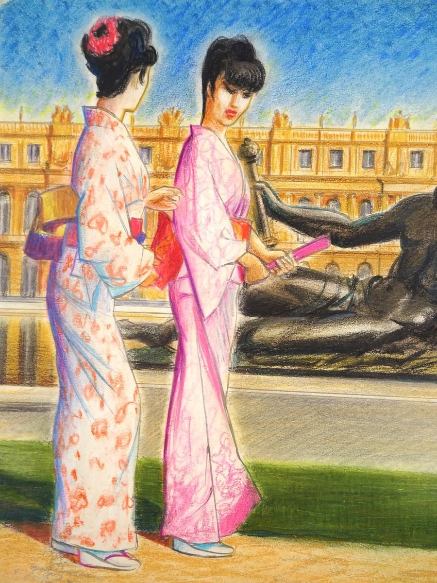 Kimonos at Versailles - Original Pastel Drawing by Emile Deschler - 1984 1984