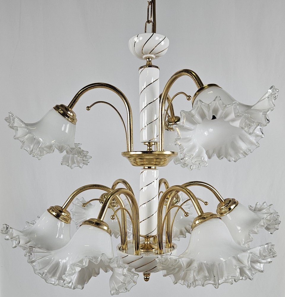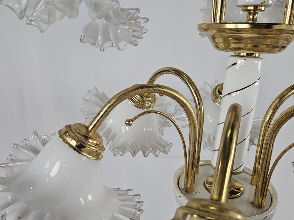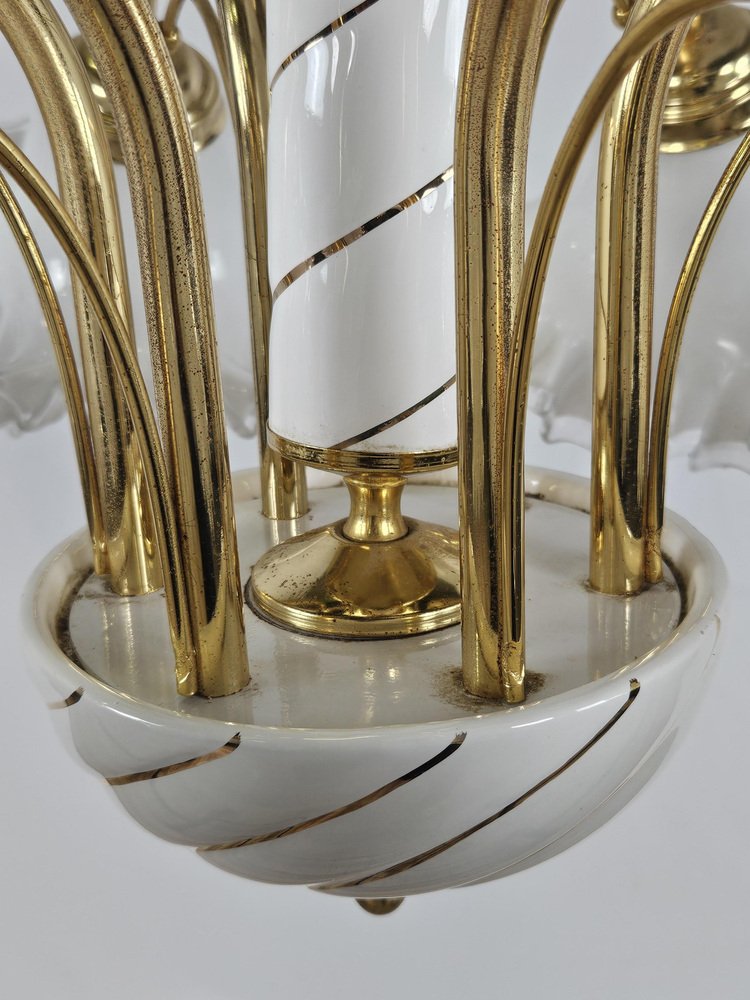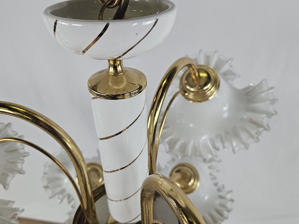 Large Ceramic Chandelier in Brass and Murano Glass, Italy, 1970s