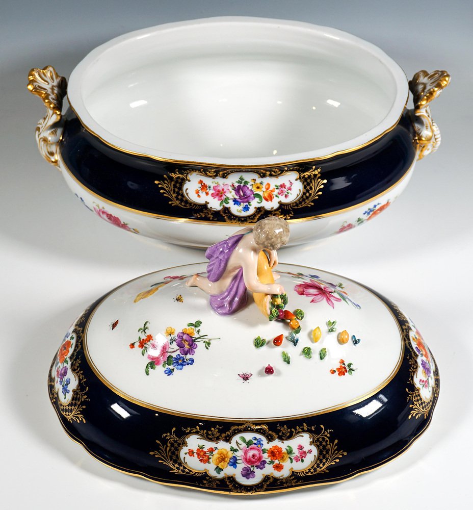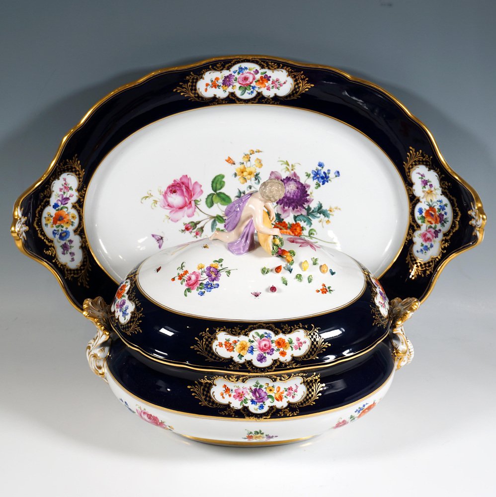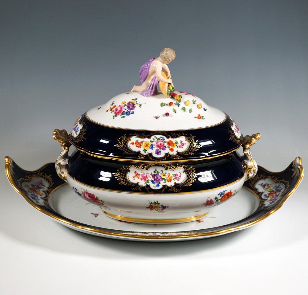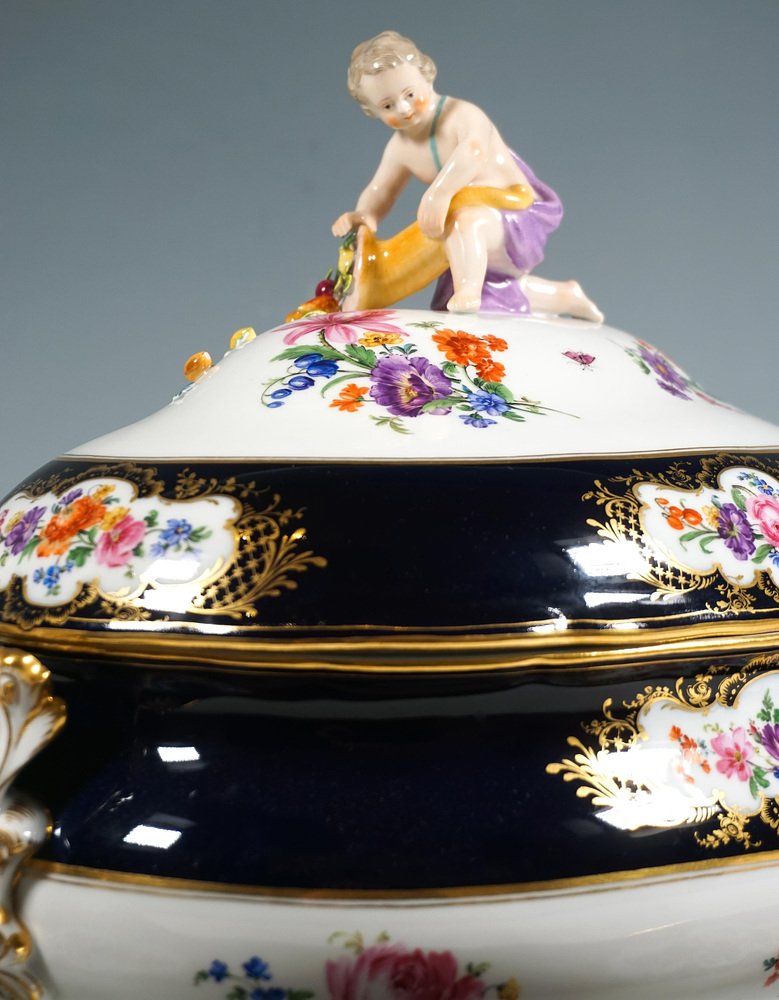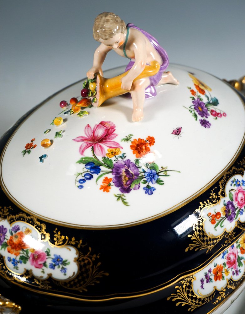 Large Gilt Tureen with Putto and Cobalt Flowers on Presentoir from Meissen, 1850, Set of 2