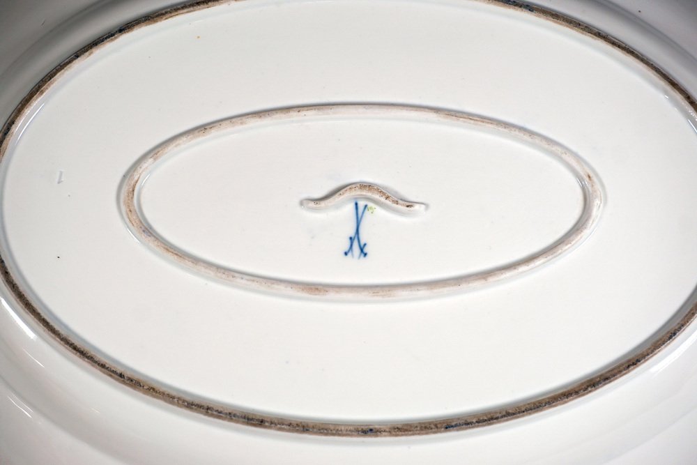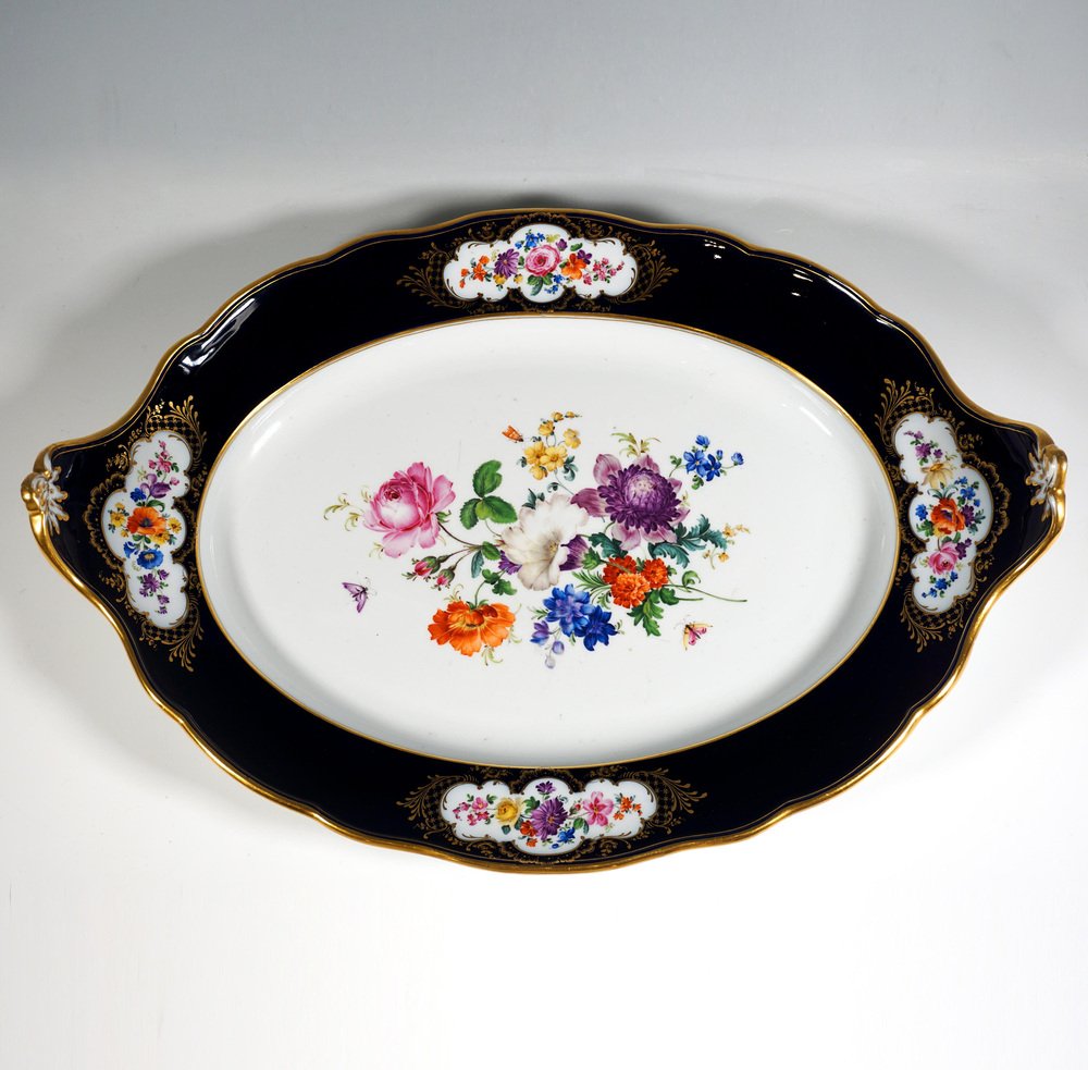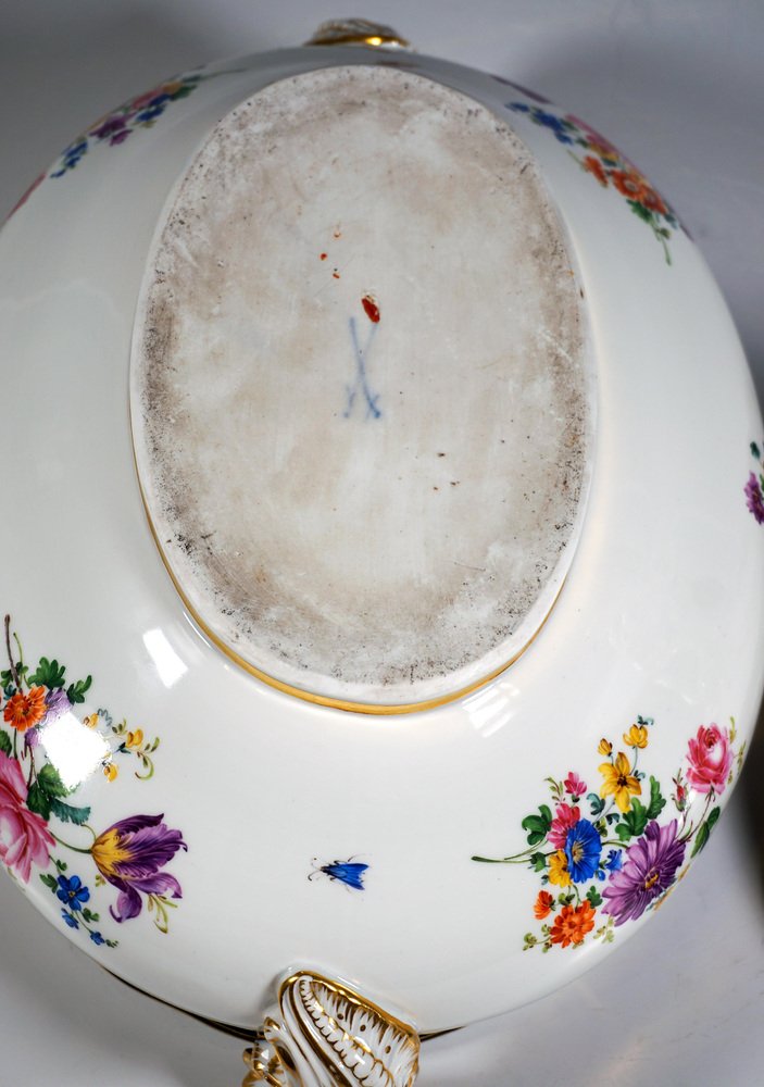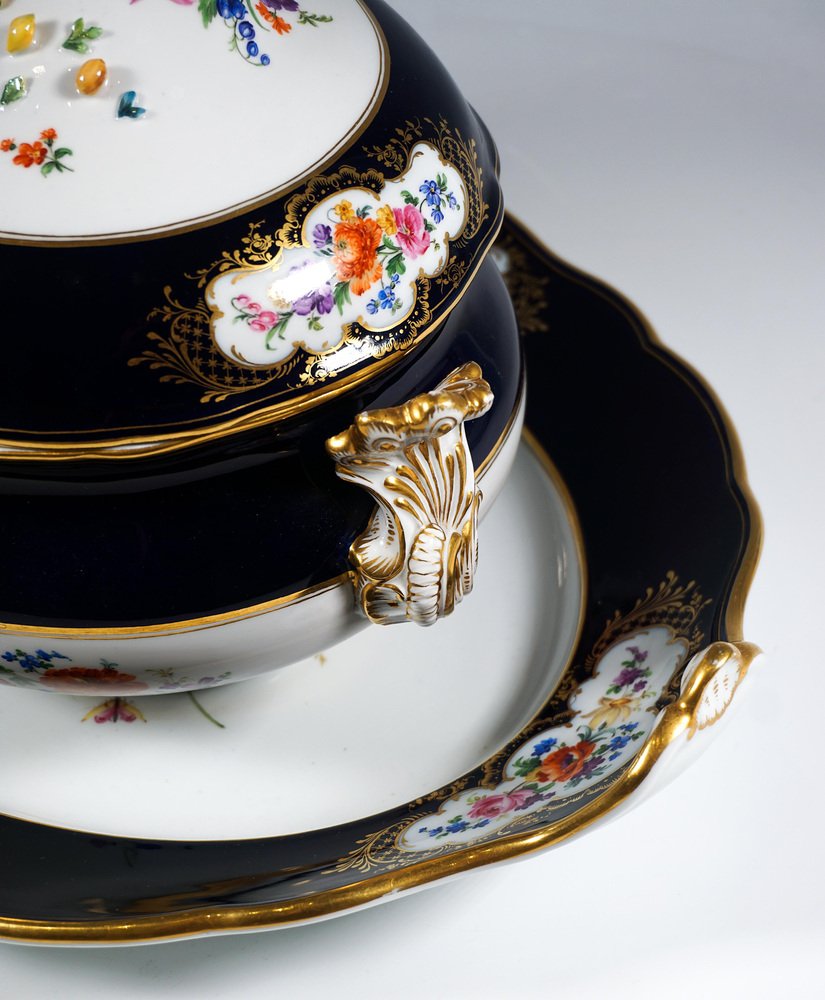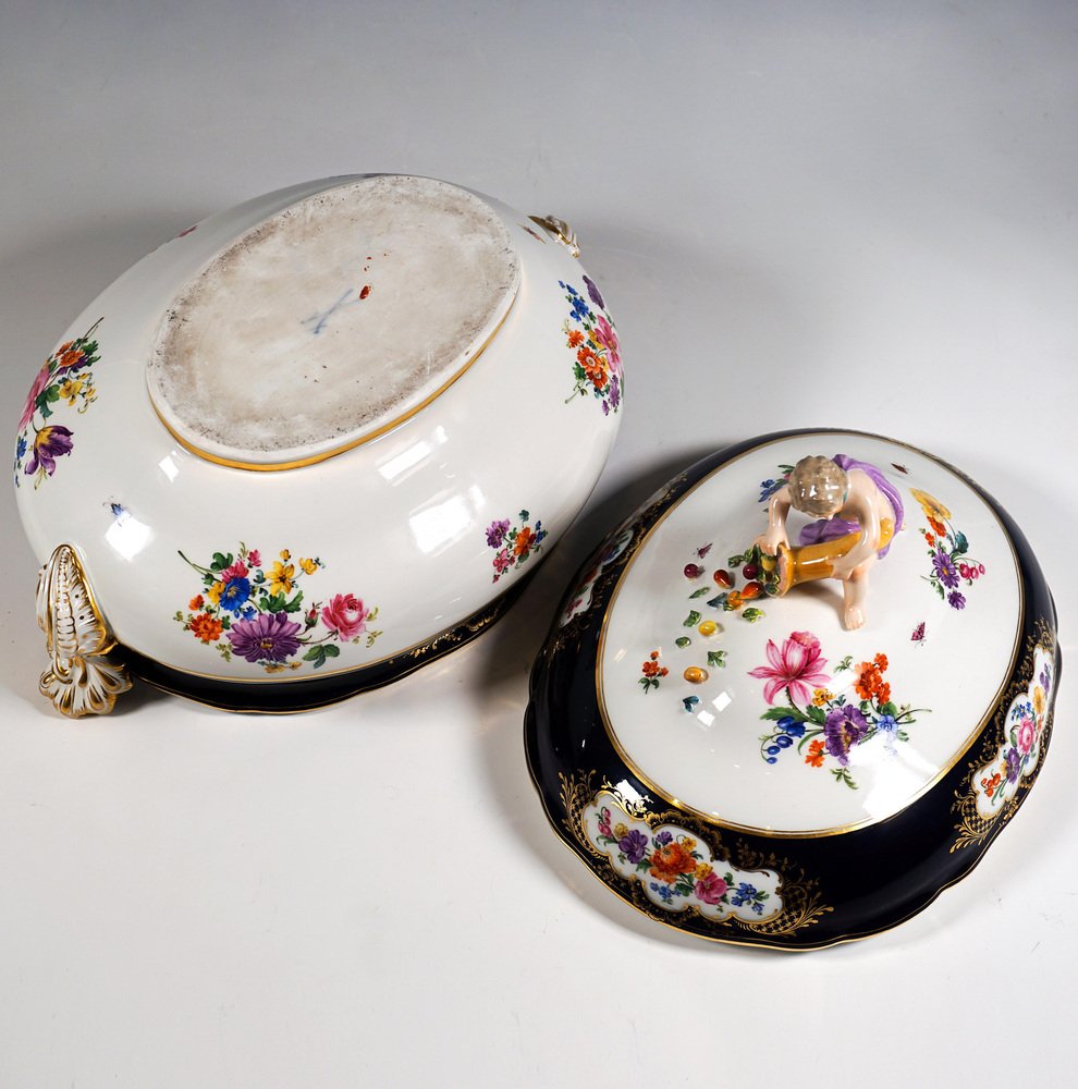 Large Gilt Tureen with Putto and Cobalt Flowers on Presentoir from Meissen, 1850, Set of 2