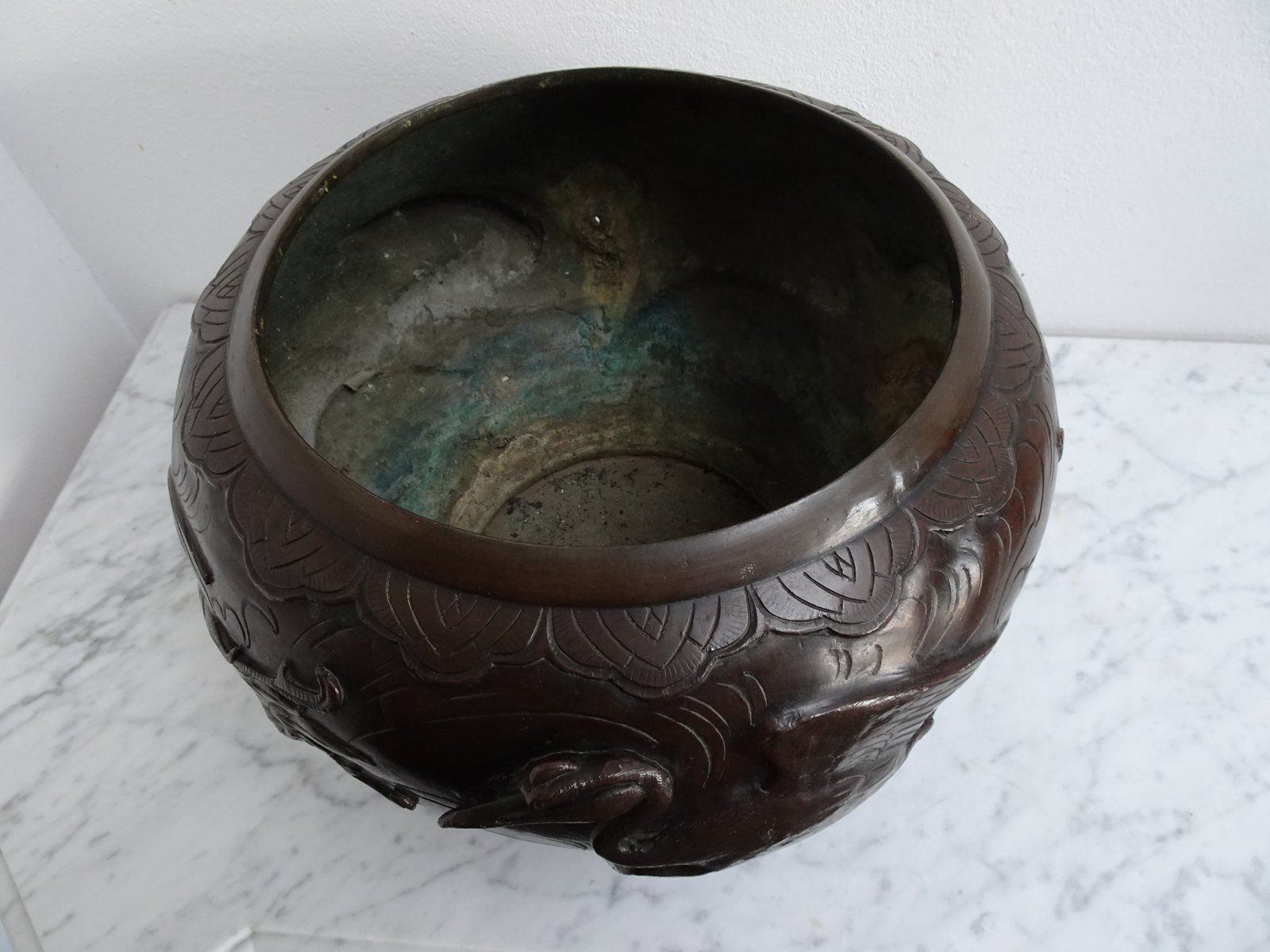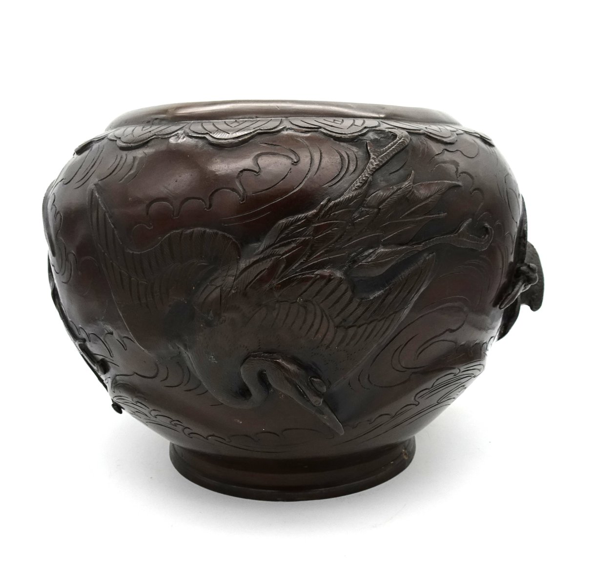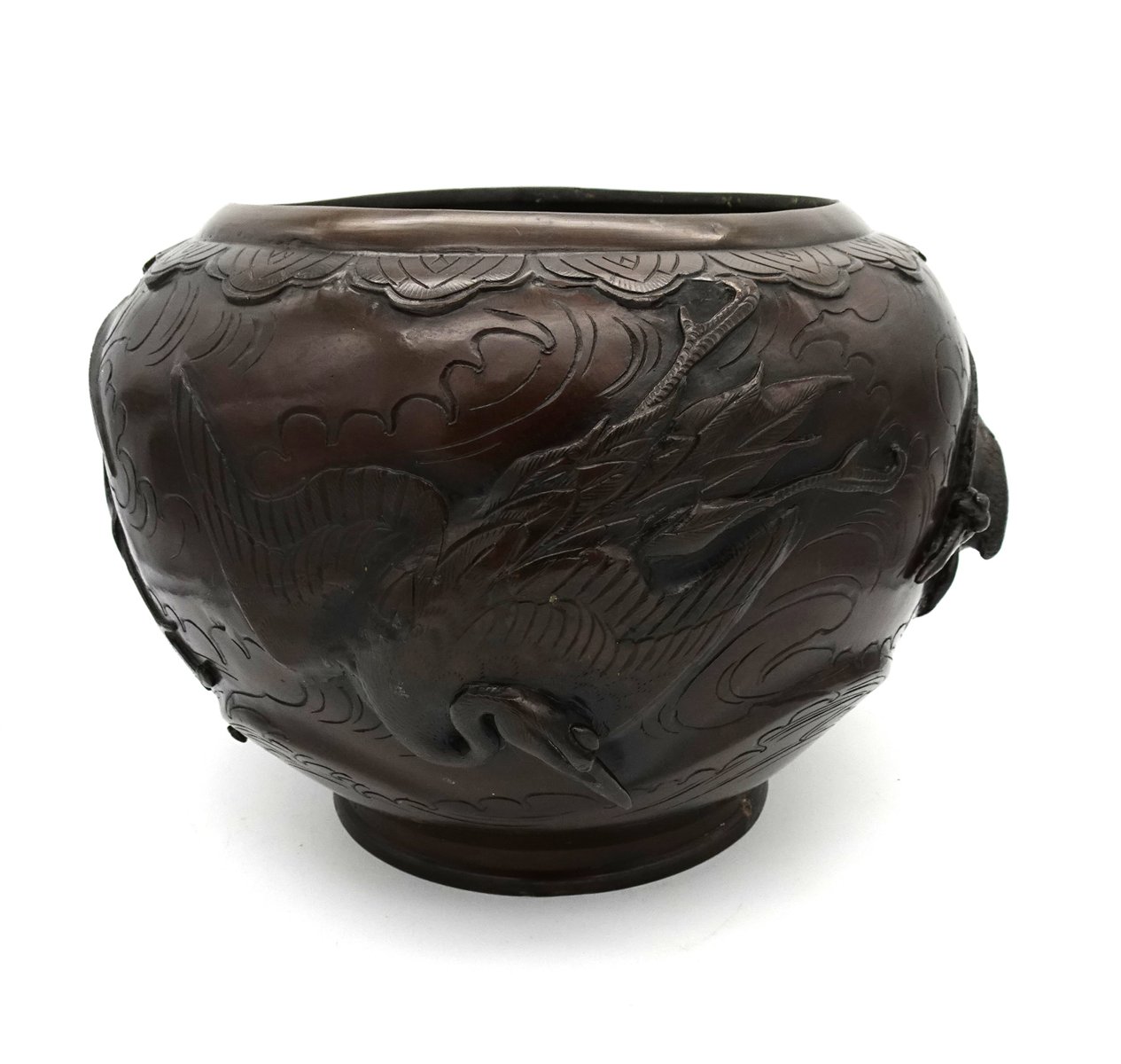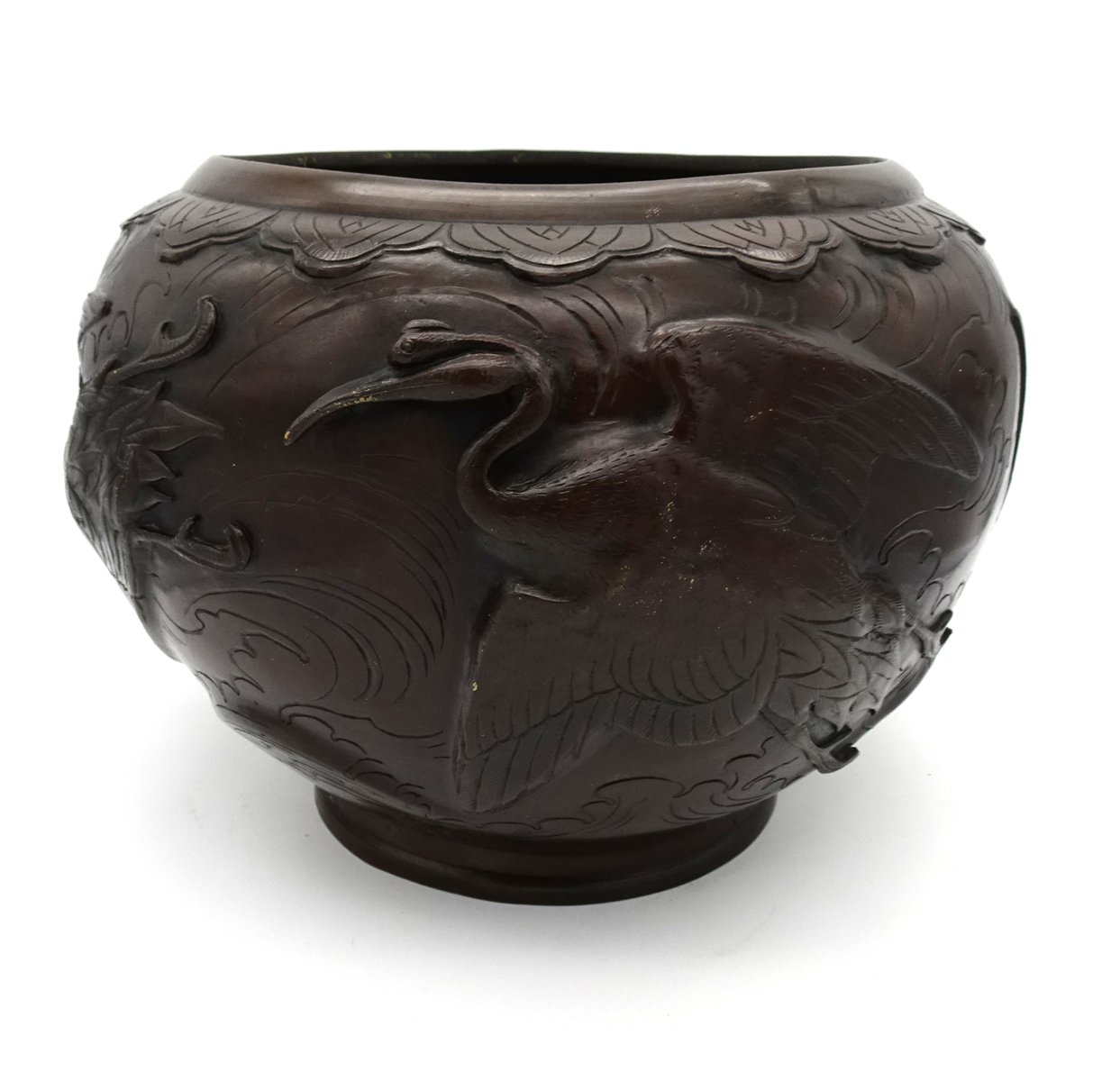 Large Japanese Meiji Bronze Planter with High Relief Cranes, 1890s