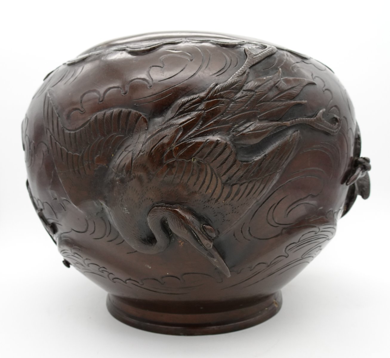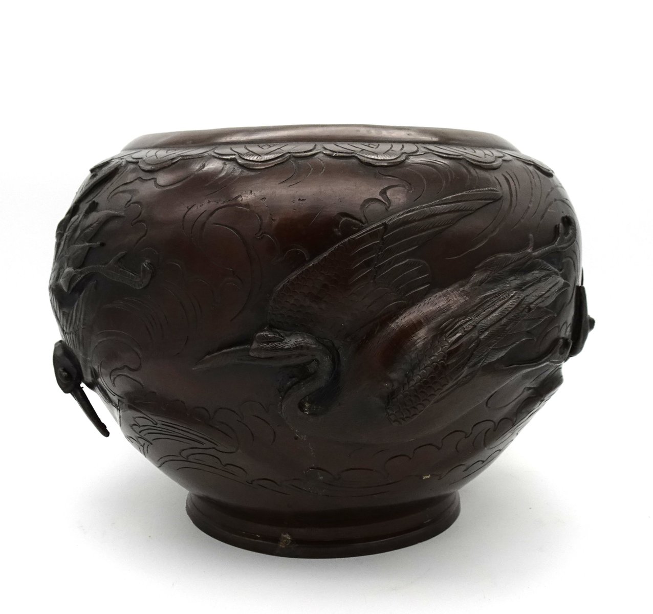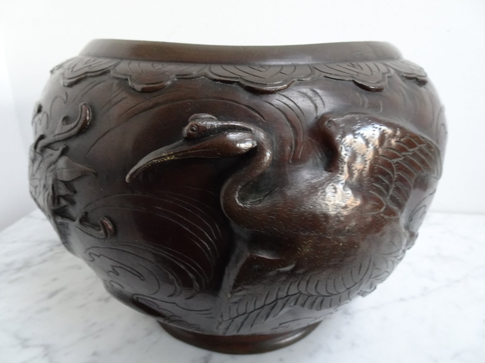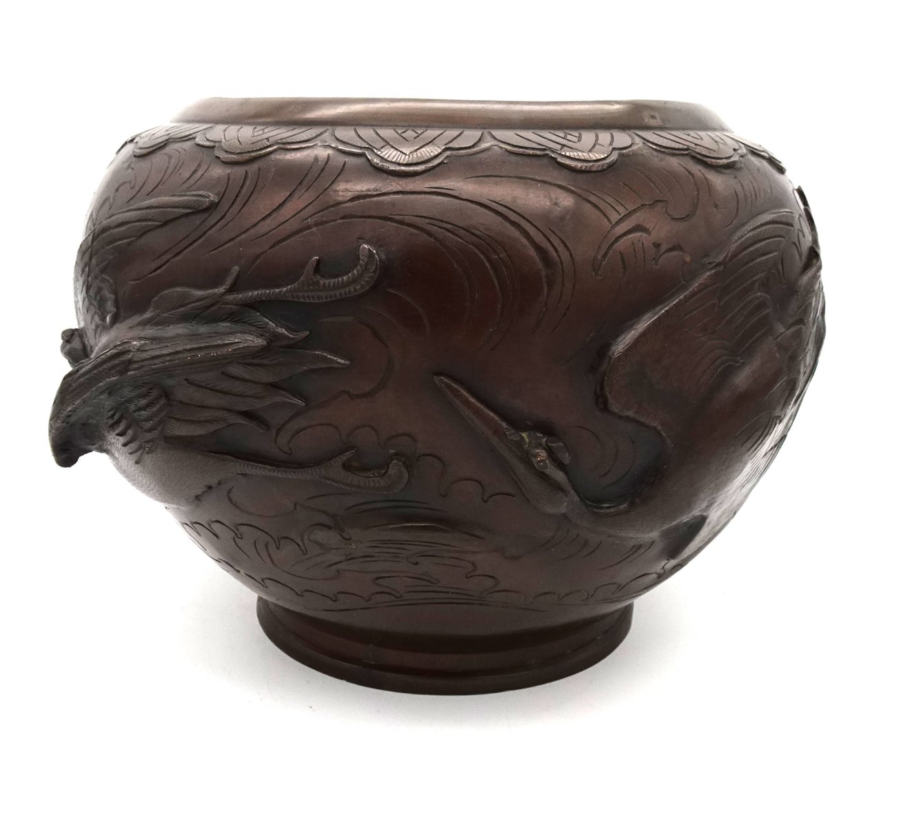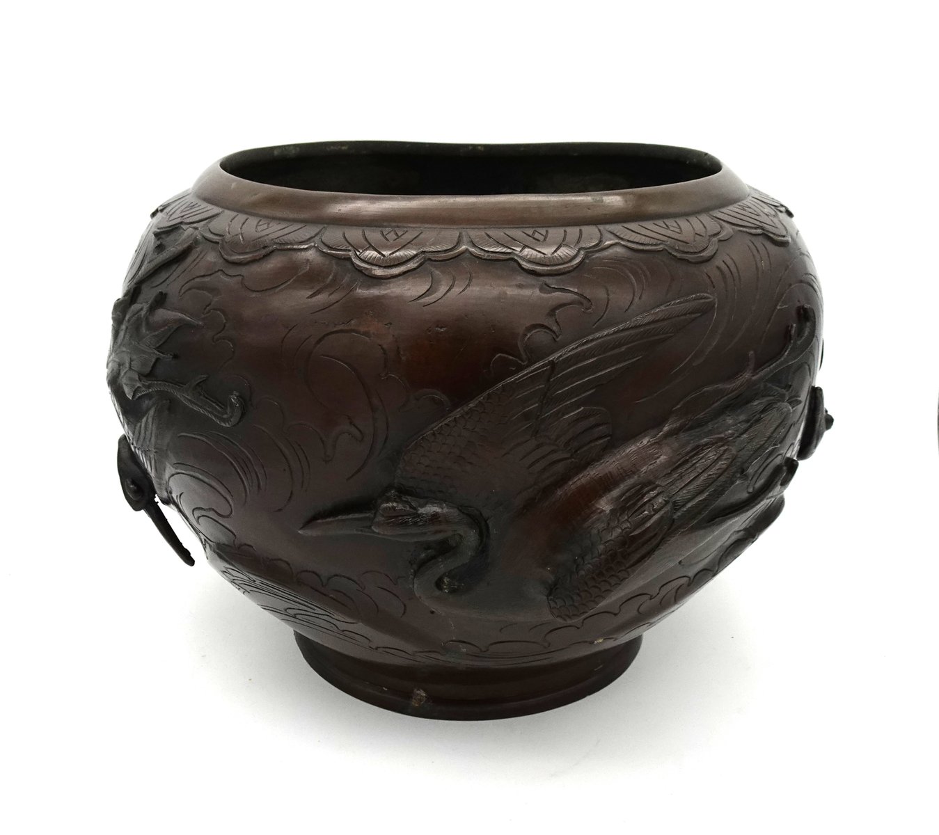 Large Japanese Meiji Bronze Planter with High Relief Cranes, 1890s