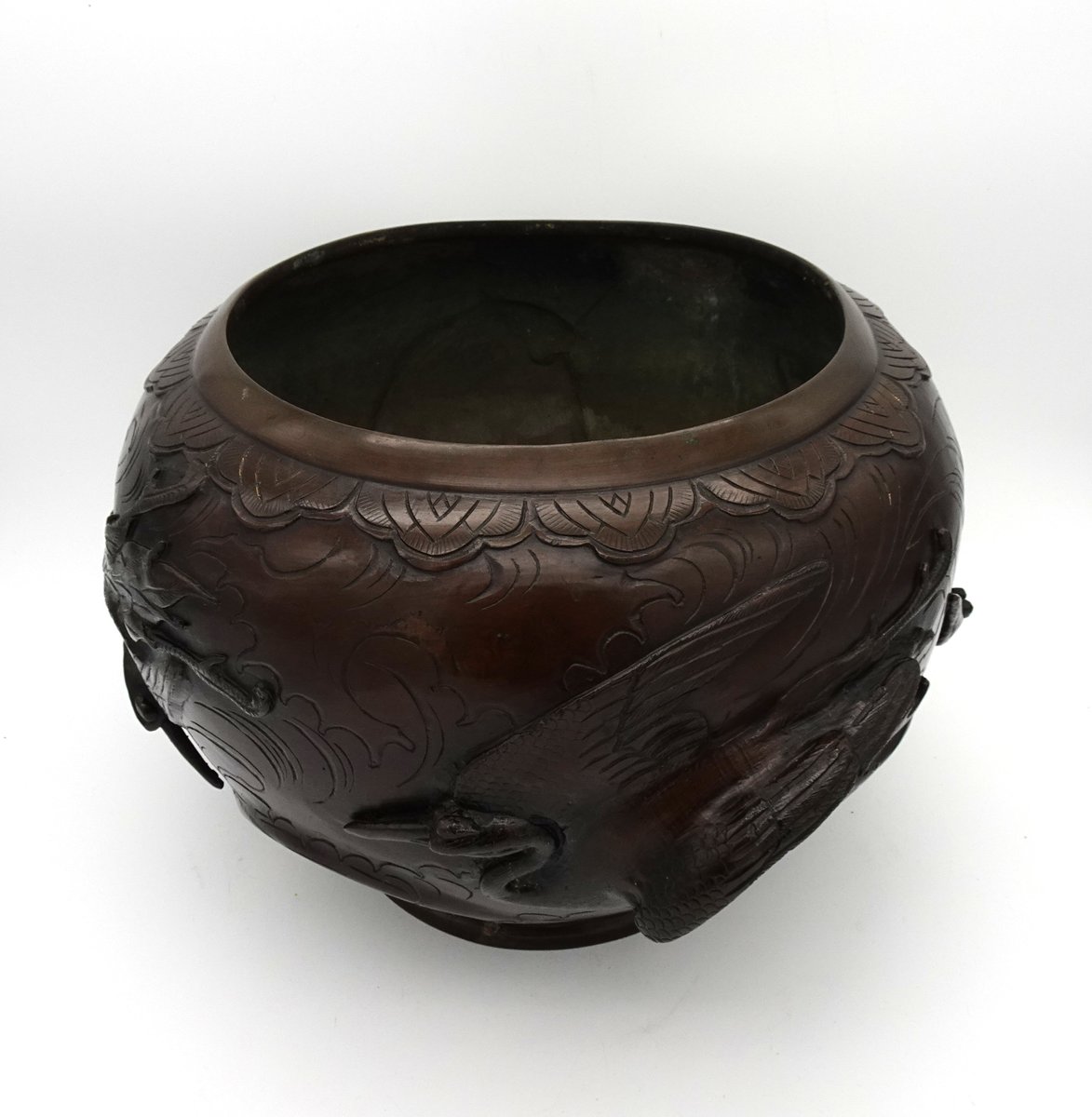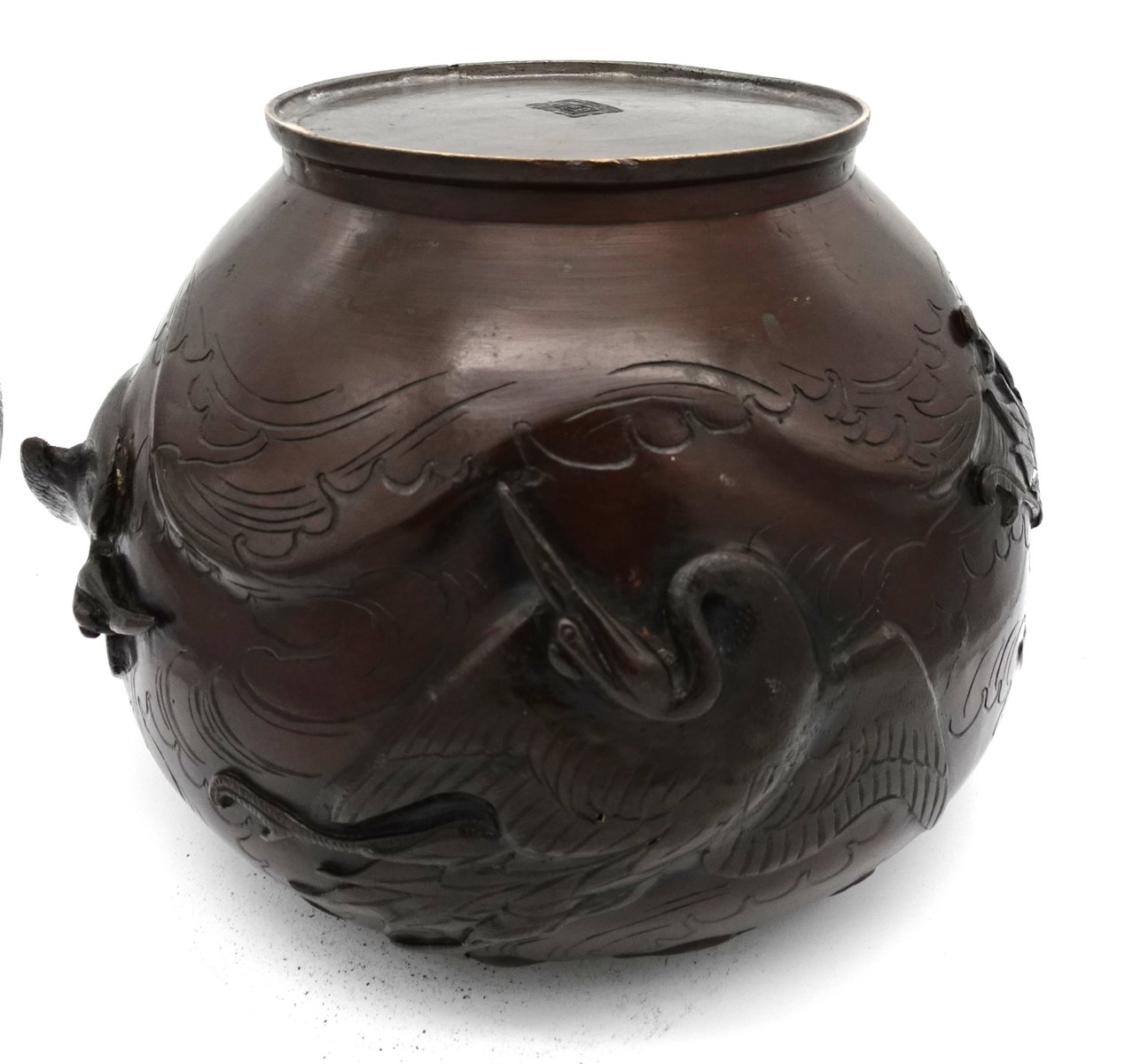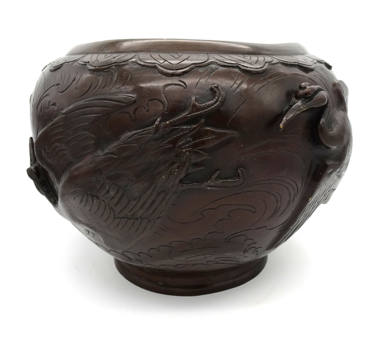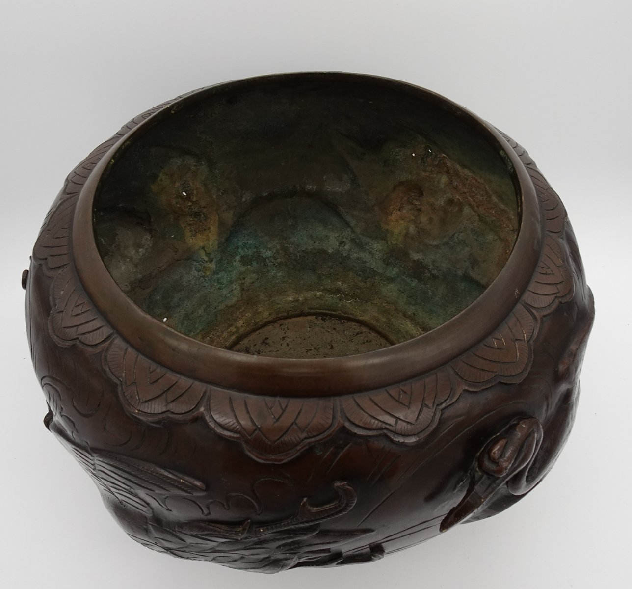Large Japanese Meiji Bronze Planter with High Relief Cranes, 1890s