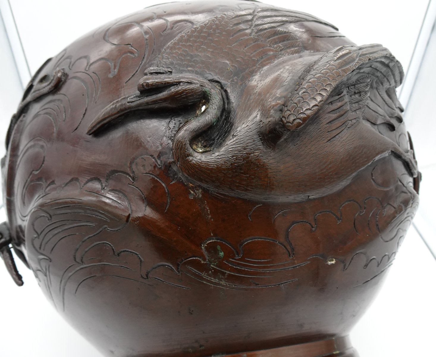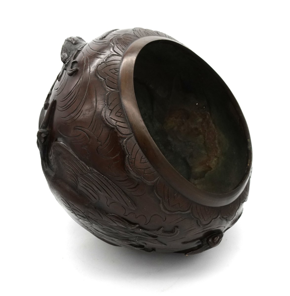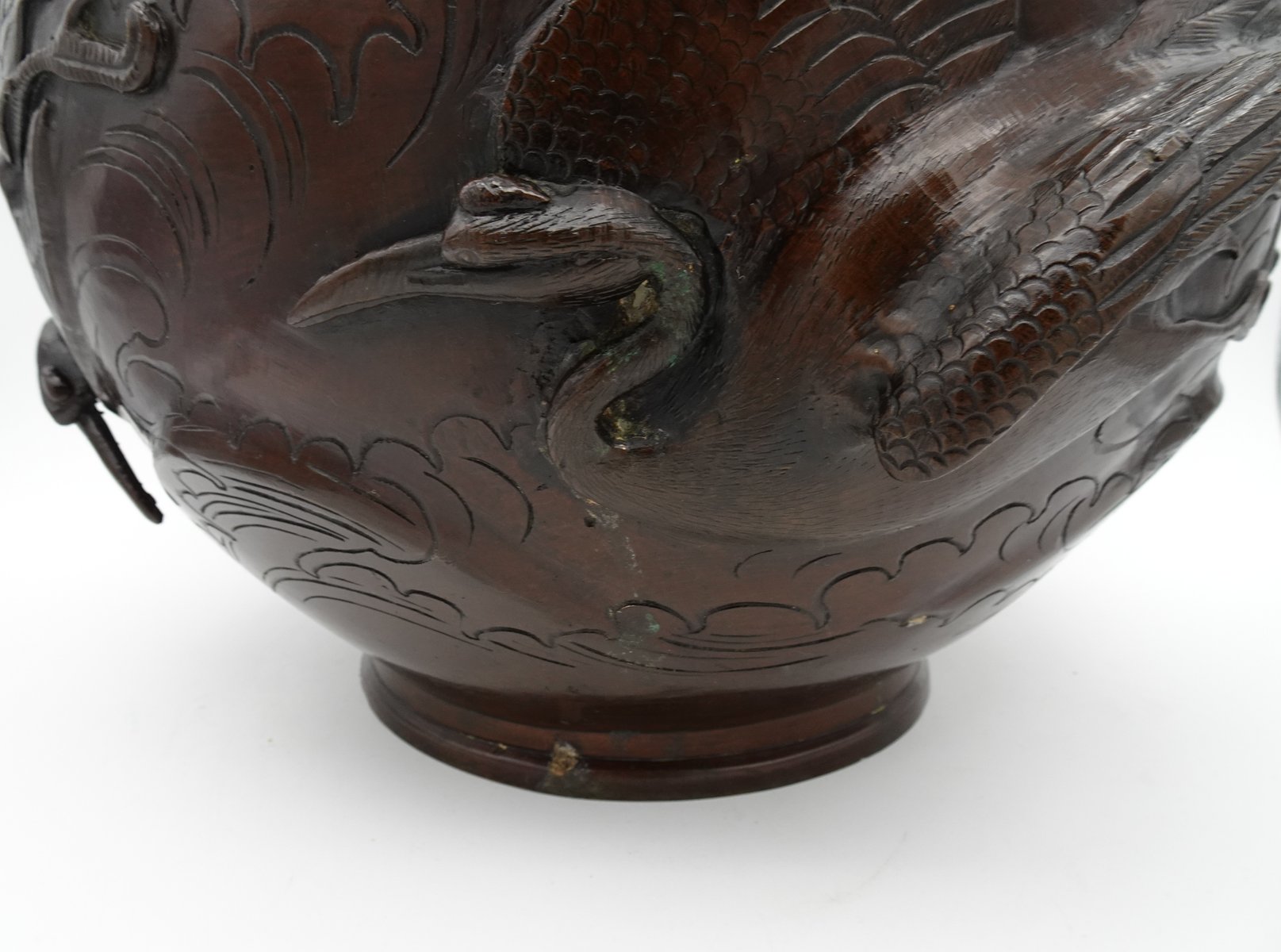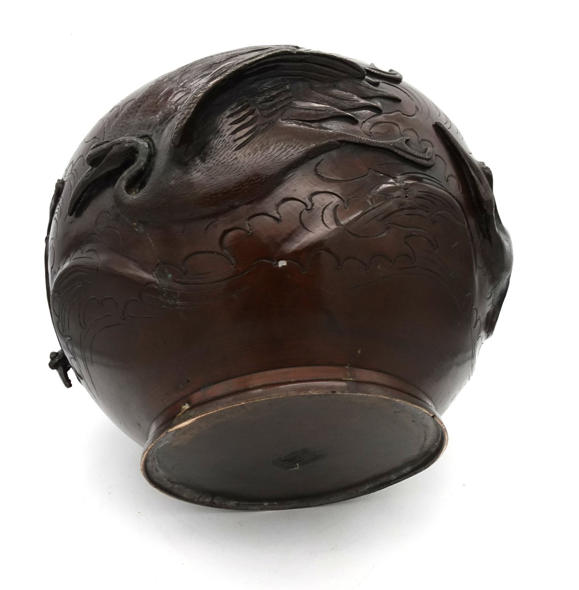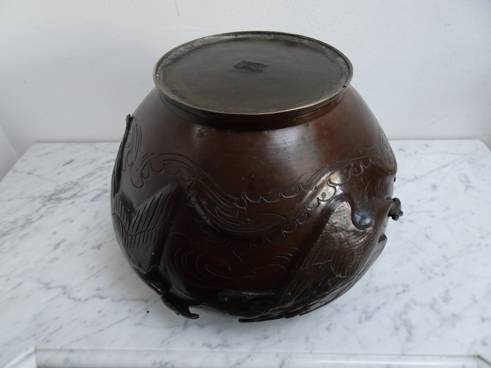 Large Japanese Meiji Bronze Planter with High Relief Cranes, 1890s