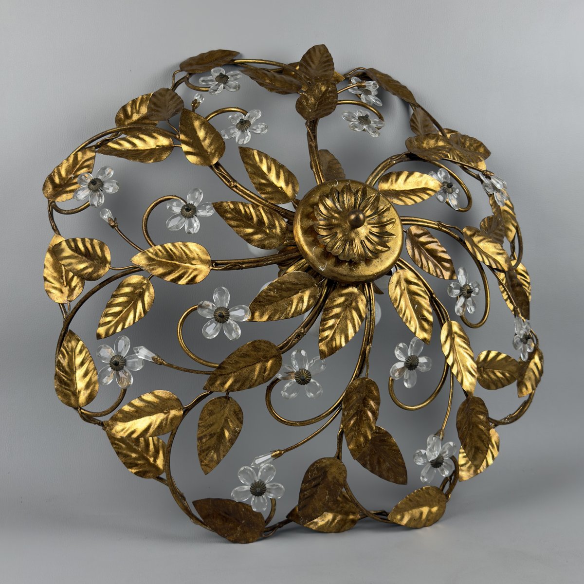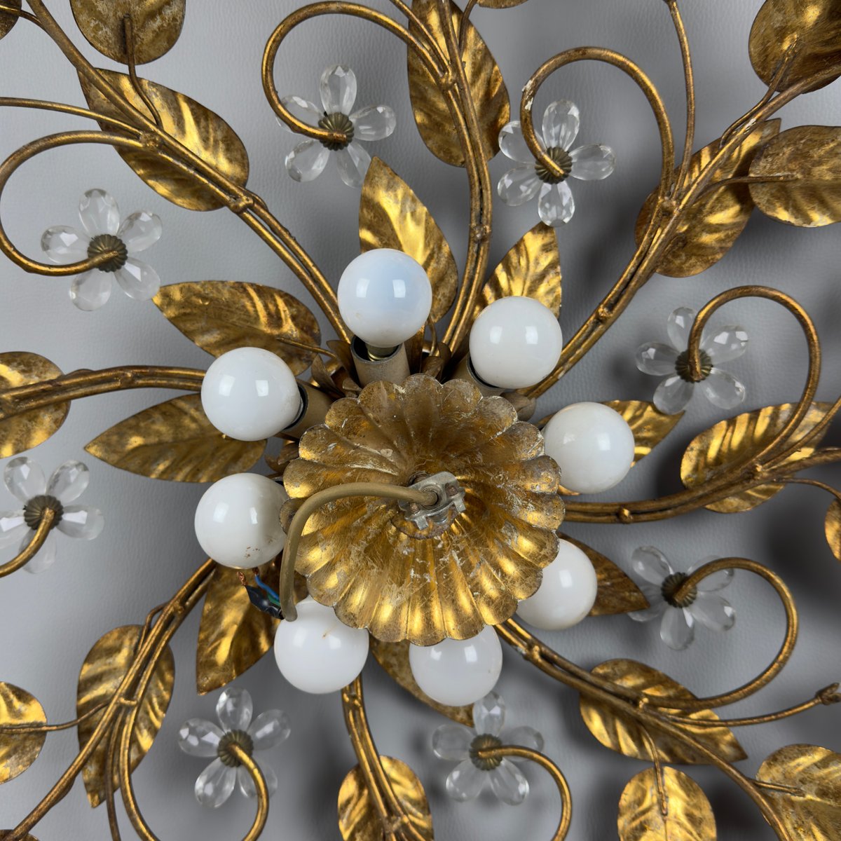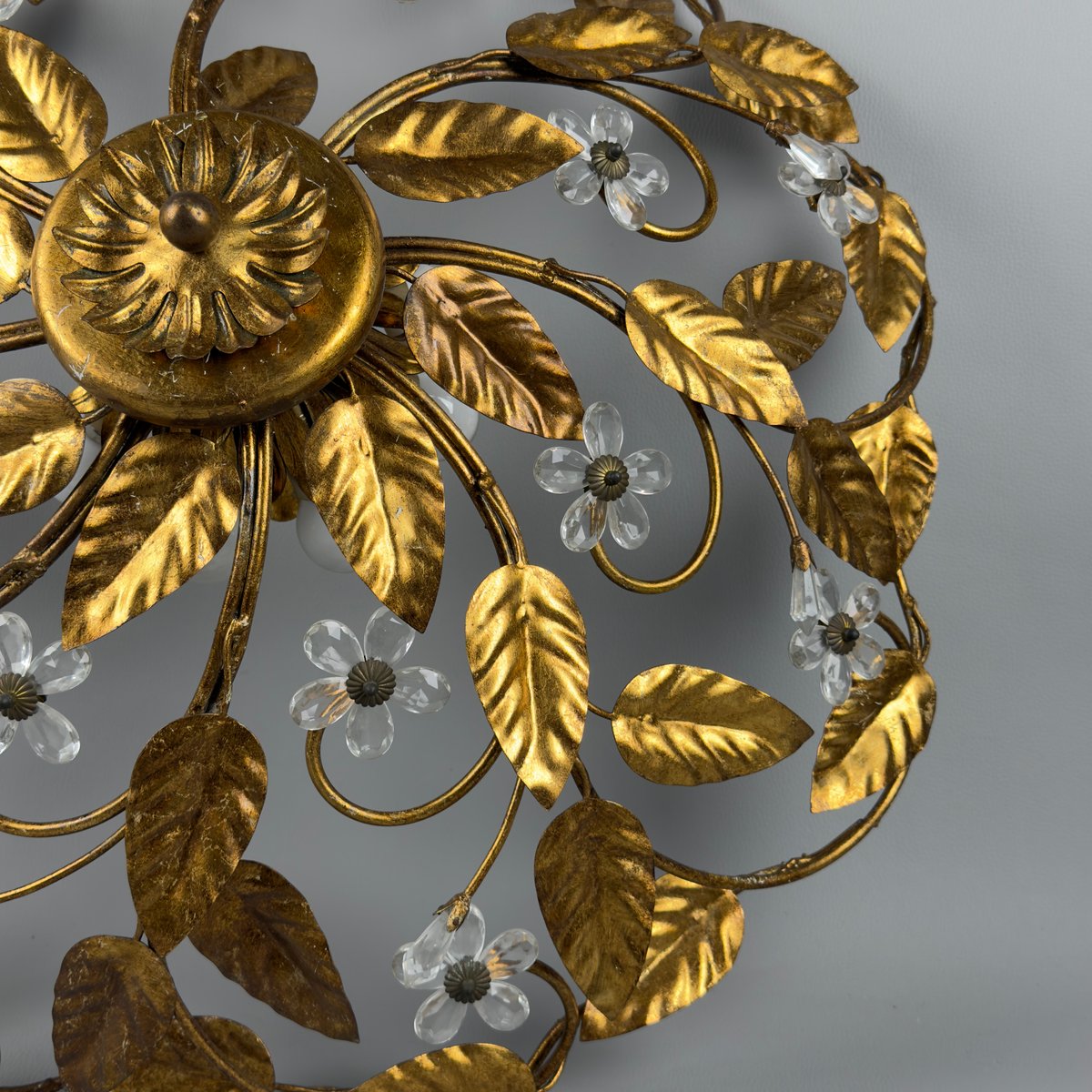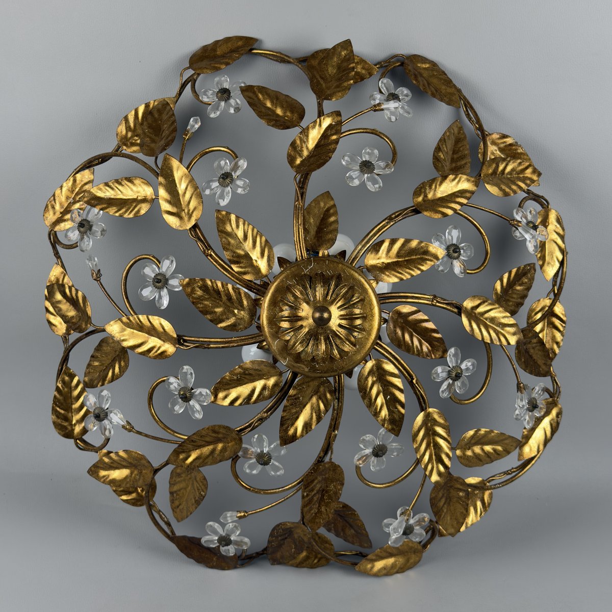 Large Vintage Gold Wrought Iron Ceiling Light with Glass Flowers, 1970s