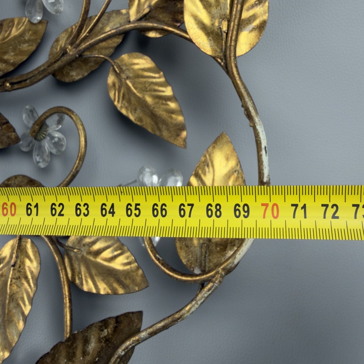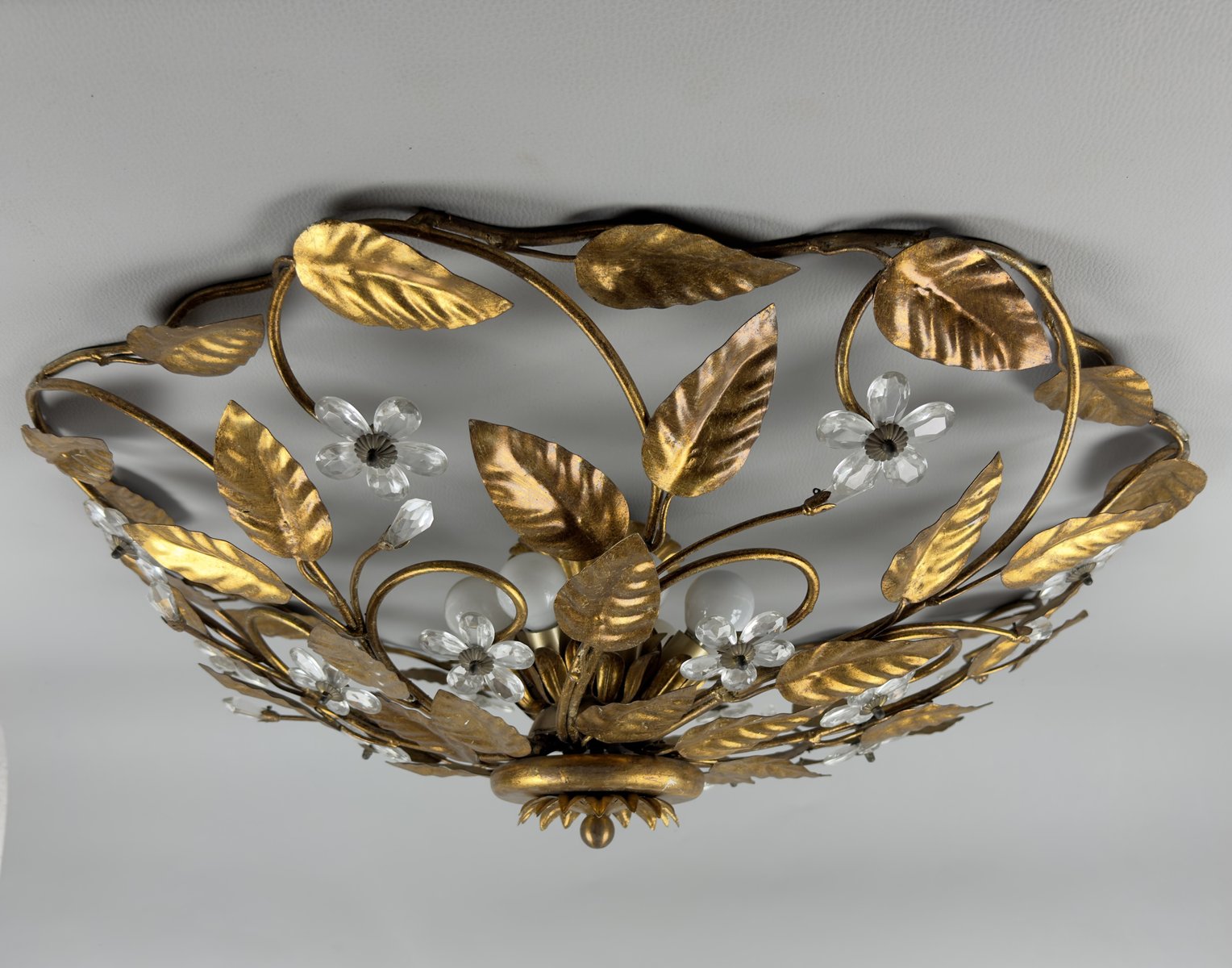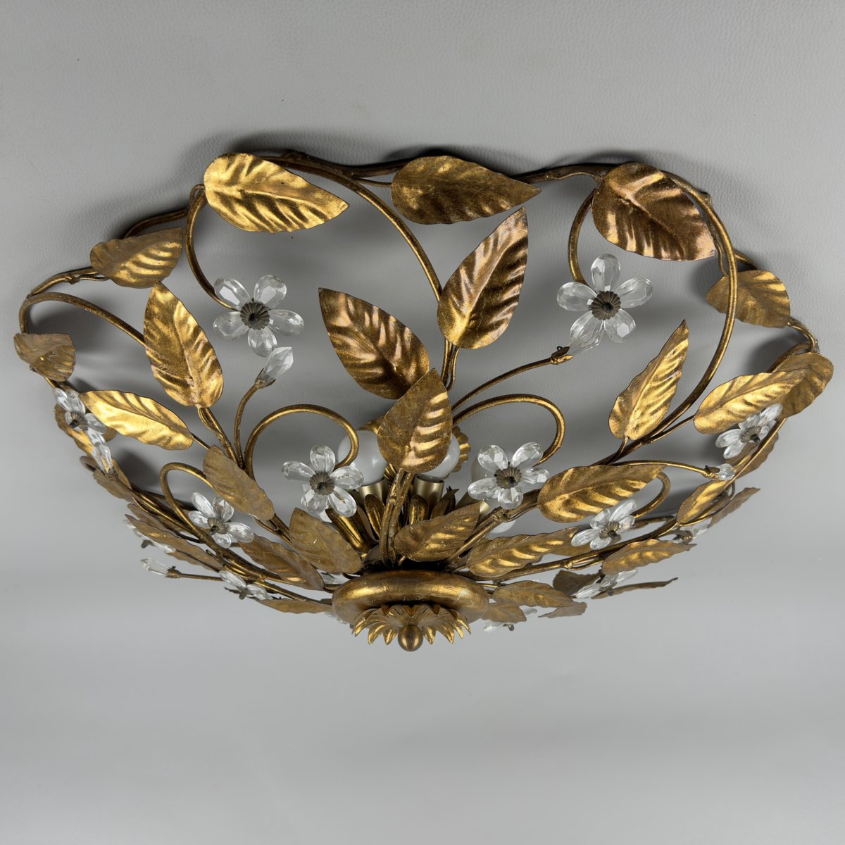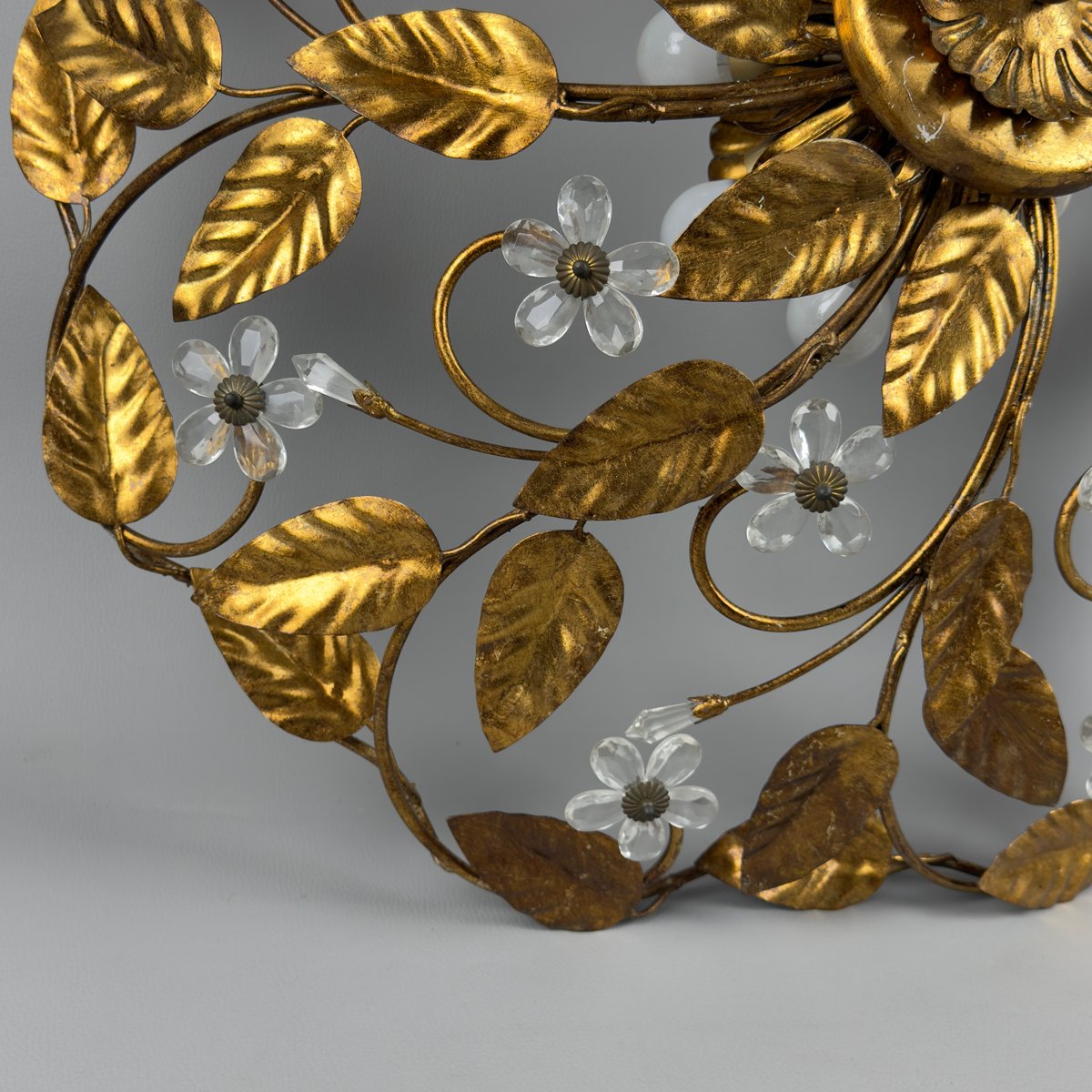 Large Vintage Gold Wrought Iron Ceiling Light with Glass Flowers, 1970s