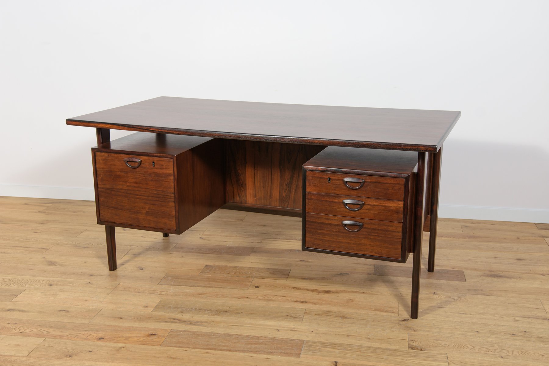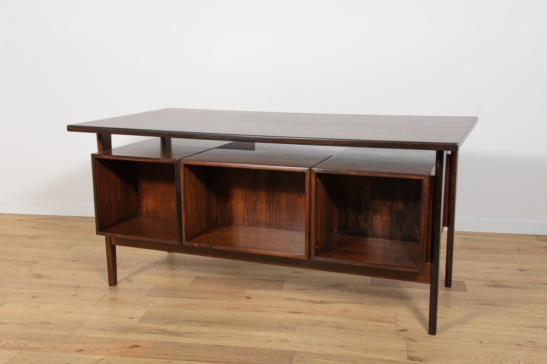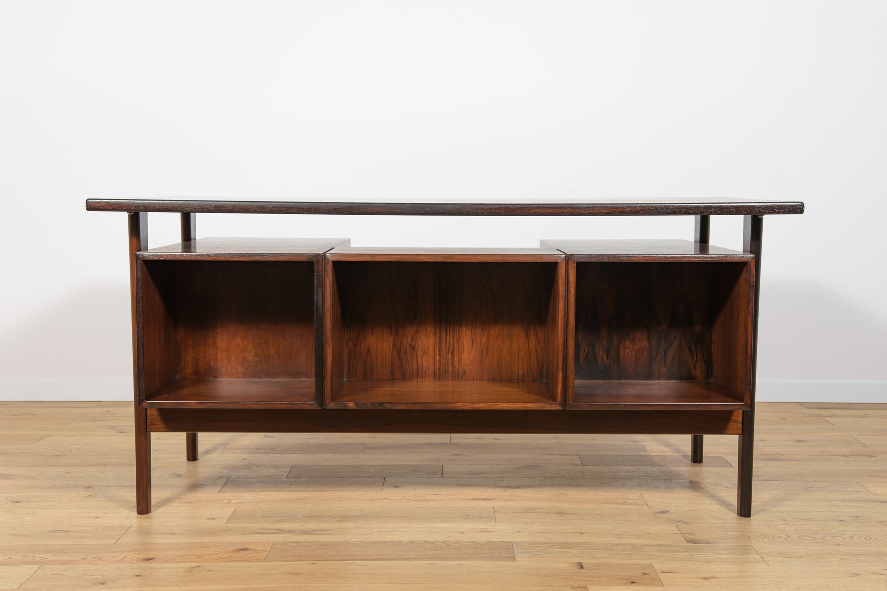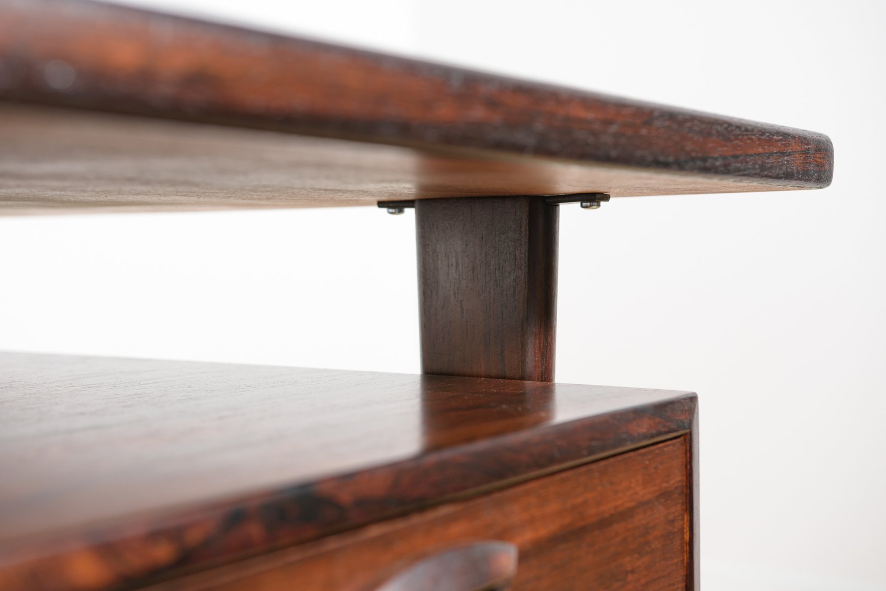 In true Danish modern fashion, Kristiansen favored well-joined teak and rosewood, evident equally in his chairs, desks, sideboards, and wall units. In 1956, he designed his most celebrated work, the No. 42 Chair for Schou Andersen. The organically curved back and pivoted armrests form a chair that is as beautiful as it is comfortable. The No. 42 was well-received by critics and enjoyed continued success as one of the most enduring Danish designs of the 20th century.