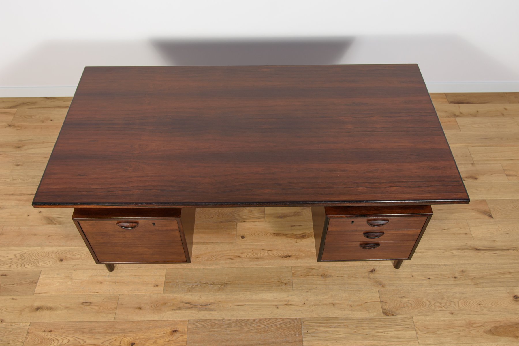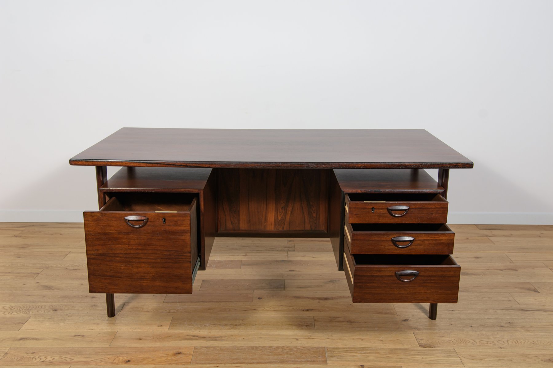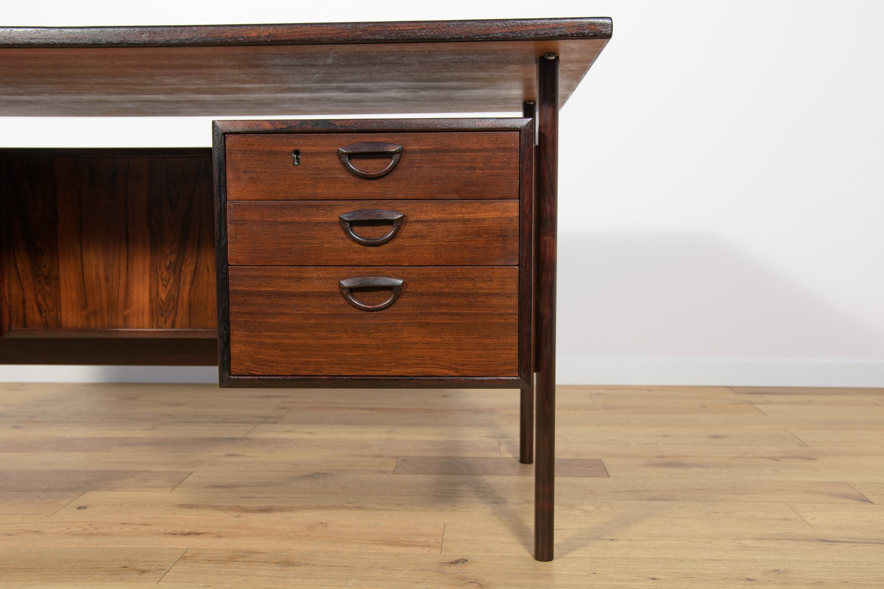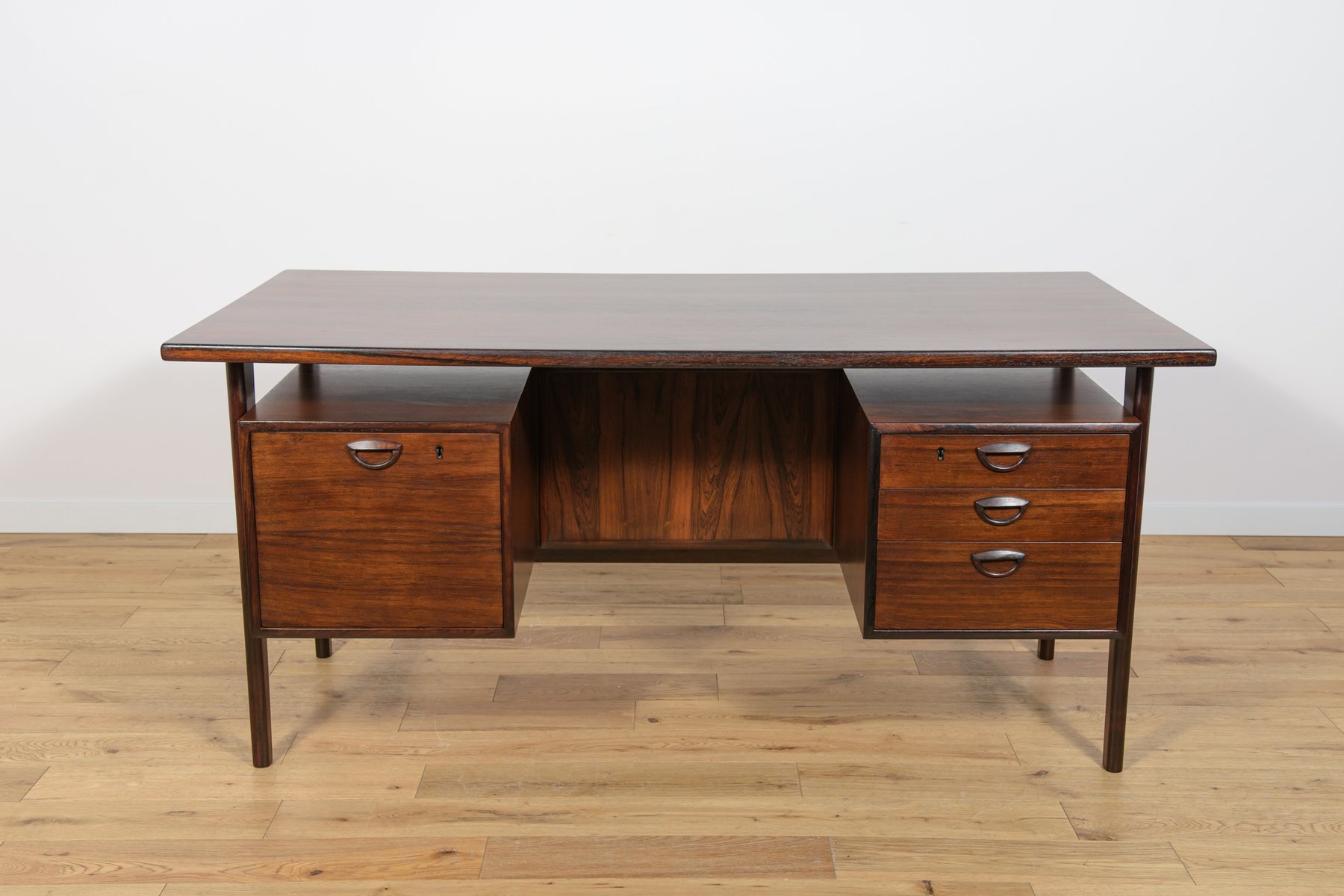 In true Danish modern fashion, Kristiansen favored well-joined teak and rosewood, evident equally in his chairs, desks, sideboards, and wall units. In 1956, he designed his most celebrated work, the No. 42 Chair for Schou Andersen. The organically curved back and pivoted armrests form a chair that is as beautiful as it is comfortable. The No. 42 was well-received by critics and enjoyed continued success as one of the most enduring Danish designs of the 20th century.