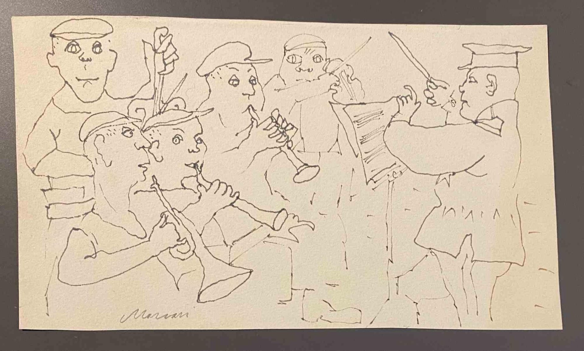 Concert is a pen Drawing realized by Mino Maccari (1924-1989) in the Mid-20th Century. Hand-signed on the lower. Good conditions. Mino Maccari (Siena, 1924-Rome, June 16, 1989) was an Italian writer, painter, engraver and journalist, winner of the Feltrinelli Prize for Painting in 1963 and first winner of the Forte dei Marmi Satira Prize in 1973.After completing his secondary education, he enrolls in university. An interventionist like many young people of his time, he took part in the Great War at the age of nineteen as a field artillery officer. At the end of the conflict he resumed his university studies in Siena and in 1920 he graduated in law. In 1924 he was called by Angiolo Bencini to take care of the printing of the magazine Il Selvaggio, openly uncompromising fascist, revolutionary and anti-bourgeois, where his first engravings were published. After a few years of coexistence between work at the newspaper and the law firm, at the beginning of 1926 he left the legal profession to take over the direction of Il Selvaggio which he would hold until 1942. In 1928 he was the author of the small book published by Vallecchi (Florence), Il Trastullo di Strapaese (little songs and engraved woodwinds) which collected fascist songs (the same book was seized several times from Antonio Gramsci during his detention). with the transfer of the editorial staff of the Selvaggio in 1925 from Colle di Val d'Elsa to Florence, Maccari collaborated with Ardengo Soffici, Ottone Rosai and Achille Lega. In the meantime, between 1927 and 1930, he made himself known to the general public as a painter by participating in various national exhibitions. Also in 1930 Maccari works in Turin at La Stampa as editor-in-chief and has the writer Curzio Malaparte as director. His presence in the cultural and editorial world of the fascist regime is very intense, he writes and collaborates with various magazines: Quadrivio, L'Italia Letteraria, L'Italiano and Omnibus by Leo Longanesi; then, during the war, in il Primato di Bottai and, subsequently again, in Il Mondo di Pannunzio (from the first number, in 1949), up to Documento by Federigo Valli. His graphic production is also vast, ranging from the Album of Vallecchi (1925), Il trastullo di Strapaese (1928) to Linoleum (1931). Maccari illustrated in 1934 La vecchia del Bal Bullier by Antonio Baldini and in 1942 he published the Album folder, followed by Come quando fuori Piove and Il superfluo illustrata.For his pictorial work full of evident chromatic accentuations and fast brushstrokes, the violent drawing combined with the lively stroke of the graphic sign of his engravings, he is recognized by critics as a complete artist. In 1962 he was also entrusted with the presidency of the Accademia di San Luca in Rome and managed to obtain a personal exhibition at Gallery 63 in New York. His production of drawings, watercolors, temperas, etc. is endless, sometimes in collaboration with prestigious publishing houses; it is worth mentioning, just as an excellent example, the 32 b/w and color drawings with which he illustrated Il gusto di vivere, a volume that collects writings by Giancarlo Fusco, edited by Natalia Aspesi and published by Laterza in 1985. Maccari, Sienese and great contradaiolo della Torre, painted the Palio of 16 August 1970 won by Selva. In 1973 he was awarded the Political Satire Award of Forte dei Marmi, an award born in that year. He died without great fanfare, in silence, at the age of ninety, in Rome on June 16, 1989.