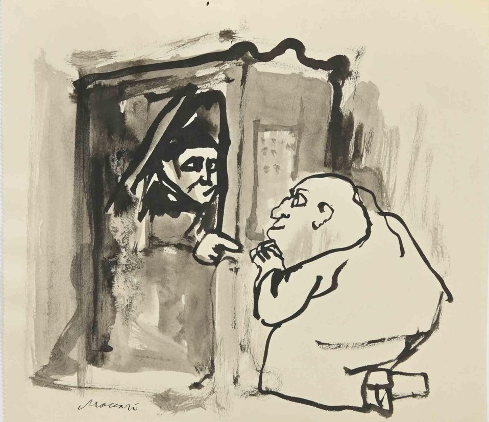Confession is a watercolor Drawing realized by Mino Maccari (1924-1989) in the 1960s. Hand-signed on the lower. Good condition Mino Maccari (Siena, 1924-Rome, June 16, 1989) was an Italian writer, painter, engraver and journalist, winner of the Feltrinelli Prize for Painting in 1963 and first winner of the Forte dei Marmi Satira Prize in 1973.After completing his secondary education, he enrolls in university. An interventionist like many young people of his time, he took part in the Great War at the age of nineteen as a field artillery officer. At the end of the conflict he resumed his university studies in Siena and in 1920 he graduated in law. In 1924 he was called by Angiolo Bencini to take care of the printing of the magazine Il Selvaggio, openly uncompromising fascist, revolutionary and anti-bourgeois, where his first engravings were published. After a few years of coexistence between work at the newspaper and the law firm, at the beginning of 1926 he left the legal profession to take over the direction of Il Selvaggio which he would hold until 1942. In 1928 he was the author of the small book published by Vallecchi (Florence), Il Trastullo di Strapaese (little songs and engraved woodwinds) which collected fascist songs (the same book was seized several times from Antonio Gramsci during his detention). with the transfer of the editorial staff of the Selvaggio in 1925 from Colle di Val d'Elsa to Florence, Maccari collaborated with Ardengo Soffici, Ottone Rosai and Achille Lega. In the meantime, between 1927 and 1930, he made himself known to the general public as a painter by participating in various national exhibitions. Also in 1930 Maccari works in Turin at La Stampa as editor-in-chief and has the writer Curzio Malaparte as director. His presence in the cultural and editorial world of the fascist regime is very intense, he writes and collaborates with various magazines: Quadrivio, L'Italia Letteraria, L'Italiano and Omnibus by Leo Longanesi; then, during the war, in il Primato di Bottai and, subsequently again, in Il Mondo di Pannunzio (from the first number, in 1949), up to Documento by Federigo Valli. His graphic production is also vast, ranging from the Album of Vallecchi (1925), Il trastullo di Strapaese (1928) to Linoleum (1931). Maccari illustrated in 1934 La vecchia del Bal Bullier by Antonio Baldini and in 1942 he published the Album folder, followed by Come quando fuori Piove and Il superfluo illustrata.For his pictorial work full of evident chromatic accentuations and fast brushstrokes, the violent drawing combined with the lively stroke of the graphic sign of his engravings, he is recognized by critics as a complete artist. In 1962 he was also entrusted with the presidency of the Accademia di San Luca in Rome and managed to obtain a personal exhibition at Gallery 63 in New York. His production of drawings, watercolors, temperas, etc. is endless, sometimes in collaboration with prestigious publishing houses; it is worth mentioning, just as an excellent example, the 32 b/w and color drawings with which he illustrated Il gusto di vivere, a volume that collects writings by Giancarlo Fusco, edited by Natalia Aspesi and published by Laterza in 1985. Maccari, Sienese and great contradaiolo della Torre, painted the Palio of 16 August 1970 won by Selva. In 1973 he was awarded the Political Satire Award of Forte dei Marmi, an award born in that year. He died without great fanfare, in silence, at the age of ninety, in Rome on June 16, 1989.