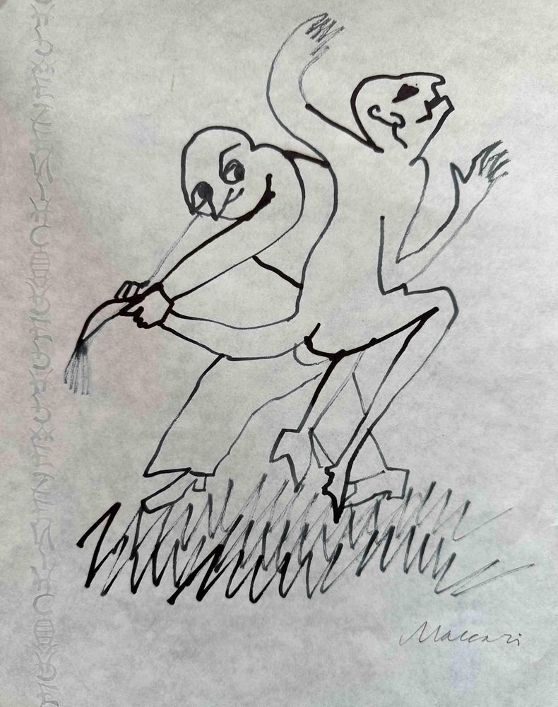 Dancing Figures is a china ink drawing realized by Mino Maccari in 1975. Hand-signed in the lower right part. Good conditions with slight folding. Mino Maccari (Siena, 1924-Rome, June 16, 1989) was an Italian writer, painter, engraver and journalist, winner of the Feltrinelli Prize for Painting in 1963 and first winner of the Forte dei Marmi Satira Prize in 1973.After completing his secondary education, he enrolls in university. An interventionist like many young people of his time, he took part in the Great War at the age of nineteen as a field artillery officer. At the end of the conflict he resumed his university studies in Siena and in 1920 he graduated in law. In 1924 he was called by Angiolo Bencini to take care of the printing of the magazine Il Selvaggio, openly uncompromising fascist, revolutionary and anti-bourgeois, where his first engravings were published. After a few years of coexistence between work at the newspaper and the law firm, at the beginning of 1926 he left the legal profession to take over the direction of Il Selvaggio which he would hold until 1942. In 1928 he was the author of the small book published by Vallecchi (Florence), Il Trastullo di Strapaese (little songs and engraved woodwinds) which collected fascist songs (the same book was seized several times from Antonio Gramsci during his detention). with the transfer of the editorial staff of the Selvaggio in 1925 from Colle di Val d'Elsa to Florence, Maccari collaborated with Ardengo Soffici, Ottone Rosai and Achille Lega. In the meantime, between 1927 and 1930, he made himself known to the general public as a painter by participating in various national exhibitions. Also in 1930 Maccari works in Turin at La Stampa as editor-in-chief and has the writer Curzio Malaparte as director. His presence in the cultural and editorial world of the fascist regime is very intense, he writes and collaborates with various magazines: Quadrivio, L'Italia Letteraria, L'Italiano and Omnibus by Leo Longanesi; then, during the war, in il Primato di Bottai and, subsequently again, in Il Mondo di Pannunzio (from the first number, in 1949), up to Documento by Federigo Valli. His graphic production is also vast, ranging from the Album of Vallecchi (1925), Il trastullo di Strapaese (1928) to Linoleum (1931). Maccari illustrated in 1934 La vecchia del Bal Bullier by Antonio Baldini and in 1942 he published the Album folder, followed by Come quando fuori Piove and Il superfluo illustrata.For his pictorial work full of evident chromatic accentuations and fast brushstrokes, the violent drawing combined with the lively stroke of the graphic sign of his engravings, he is recognized by critics as a complete artist. In 1962 he was also entrusted with the presidency of the Accademia di San Luca in Rome and managed to obtain a personal exhibition at Gallery 63 in New York. His production of drawings, watercolors, temperas, etc. is endless, sometimes in collaboration with prestigious publishing houses; it is worth mentioning, just as an excellent example, the 32 b/w and color drawings with which he illustrated Il gusto di vivere, a volume that collects writings by Giancarlo Fusco, edited by Natalia Aspesi and published by Laterza in 1985. Maccari, Sienese and great contradaiolo della Torre, painted the Palio of 16 August 1970 won by Selva. In 1973 he was awarded the Political Satire Award of Forte dei Marmi, an award born in that year. He died without great fanfare, in silence, at the age of ninety, in Rome on June 16, 1989.