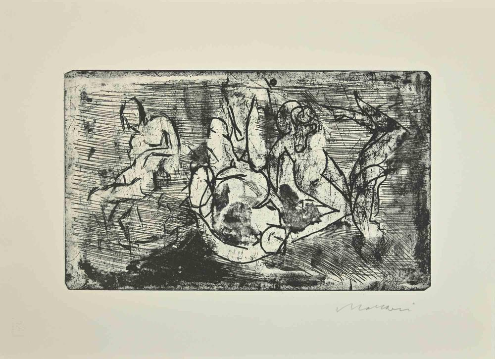 Figures is an Etching and Drypoint realized by Mino Maccari in the Mid-20th Century. Hand-signed in the lower right part. Good conditions. Mino Maccari (Siena, 1924-Rome, June 16, 1989) was an Italian writer, painter, engraver and journalist, winner of the Feltrinelli Prize for Painting in 1963 and first winner of the Forte dei Marmi Satira Prize in 1973.After completing his secondary education, he enrolls in university. An interventionist like many young people of his time, he took part in the Great War at the age of nineteen as a field artillery officer. At the end of the conflict he resumed his university studies in Siena and in 1920 he graduated in law. In 1924 he was called by Angiolo Bencini to take care of the printing of the magazine Il Selvaggio, openly uncompromising fascist, revolutionary and anti-bourgeois, where his first engravings were published. After a few years of coexistence between work at the newspaper and the law firm, at the beginning of 1926 he left the legal profession to take over the direction of Il Selvaggio which he would hold until 1942. In 1928 he was the author of the small book published by Vallecchi (Florence), Il Trastullo di Strapaese (little songs and engraved woodwinds) which collected fascist songs (the same book was seized several times from Antonio Gramsci during his detention). with the transfer of the editorial staff of the Selvaggio in 1925 from Colle di Val d'Elsa to Florence, Maccari collaborated with Ardengo Soffici, Ottone Rosai and Achille Lega. In the meantime, between 1927 and 1930, he made himself known to the general public as a painter by participating in various national exhibitions. Also in 1930 Maccari works in Turin at La Stampa as editor-in-chief and has the writer Curzio Malaparte as director. His presence in the cultural and editorial world of the fascist regime is very intense, he writes and collaborates with various magazines: Quadrivio, L'Italia Letteraria, L'Italiano and Omnibus by Leo Longanesi; then, during the war, in il Primato di Bottai and, subsequently again, in Il Mondo di Pannunzio (from the first number, in 1949), up to Documento by Federigo Valli. His graphic production is also vast, ranging from the Album of Vallecchi (1925), Il trastullo di Strapaese (1928) to Linoleum (1931). Maccari illustrated in 1934 La vecchia del Bal Bullier by Antonio Baldini and in 1942 he published the Album folder, followed by Come quando fuori Piove and Il superfluo illustrata.For his pictorial work full of evident chromatic accentuations and fast brushstrokes, the violent drawing combined with the lively stroke of the graphic sign of his engravings, he is recognized by critics as a complete artist. In 1962 he was also entrusted with the presidency of the Accademia di San Luca in Rome and managed to obtain a personal exhibition at Gallery 63 in New York. His production of drawings, watercolors, temperas, etc. is endless, sometimes in collaboration with prestigious publishing houses; it is worth mentioning, just as an excellent example, the 32 b/w and color drawings with which he illustrated Il gusto di vivere, a volume that collects writings by Giancarlo Fusco, edited by Natalia Aspesi and published by Laterza in 1985. Maccari, Sienese and great contradaiolo della Torre, painted the Palio of 16 August 1970 won by Selva. In 1973 he was awarded the Political Satire Award of Forte dei Marmi, an award born in that year. He died without great fanfare, in silence, at the age of ninety, in Rome on June 16, 1989.