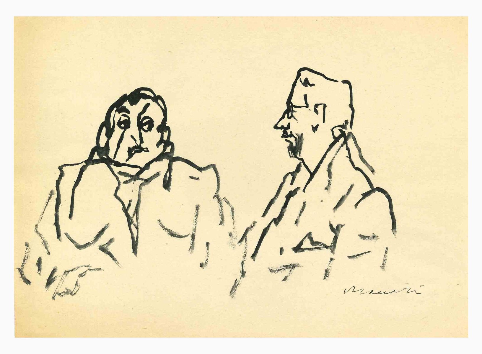 Figures is a black permanent marker Drawing realized by Mino Maccari (1924-1989) in the Mid-20th Century. Hand-signed on the lower. Good conditions. Mino Maccari (Siena, 1924-Rome, June 16, 1989) was an Italian writer, painter, engraver and journalist, winner of the Feltrinelli Prize for Painting in 1963 and first winner of the Forte dei Marmi Satira Prize in 1973.After completing his secondary education, he enrolls in university. An interventionist like many young people of his time, he took part in the Great War at the age of nineteen as a field artillery officer. At the end of the conflict he resumed his university studies in Siena and in 1920 he graduated in law. In 1924 he was called by Angiolo Bencini to take care of the printing of the magazine Il Selvaggio, openly uncompromising fascist, revolutionary and anti-bourgeois, where his first engravings were published. After a few years of coexistence between work at the newspaper and the law firm, at the beginning of 1926 he left the legal profession to take over the direction of Il Selvaggio which he would hold until 1942. In 1928 he was the author of the small book published by Vallecchi (Florence), Il Trastullo di Strapaese (little songs and engraved woodwinds) which collected fascist songs (the same book was seized several times from Antonio Gramsci during his detention). with the transfer of the editorial staff of the Selvaggio in 1925 from Colle di Val d'Elsa to Florence, Maccari collaborated with Ardengo Soffici, Ottone Rosai and Achille Lega. In the meantime, between 1927 and 1930, he made himself known to the general public as a painter by participating in various national exhibitions. Also in 1930 Maccari works in Turin at La Stampa as editor-in-chief and has the writer Curzio Malaparte as director. His presence in the cultural and editorial world of the fascist regime is very intense, he writes and collaborates with various magazines: Quadrivio, L'Italia Letteraria, L'Italiano and Omnibus by Leo Longanesi; then, during the war, in il Primato di Bottai and, subsequently again, in Il Mondo di Pannunzio (from the first number, in 1949), up to Documento by Federigo Valli. His graphic production is also vast, ranging from the Album of Vallecchi (1925), Il trastullo di Strapaese (1928) to Linoleum (1931). Maccari illustrated in 1934 La vecchia del Bal Bullier by Antonio Baldini and in 1942 he published the Album folder, followed by Come quando fuori Piove and Il superfluo illustrata.For his pictorial work full of evident chromatic accentuations and fast brushstrokes, the violent drawing combined with the lively stroke of the graphic sign of his engravings, he is recognized by critics as a complete artist. In 1962 he was also entrusted with the presidency of the Accademia di San Luca in Rome and managed to obtain a personal exhibition at Gallery 63 in New York. His production of drawings, watercolors, temperas, etc. is endless, sometimes in collaboration with prestigious publishing houses; it is worth mentioning, just as an excellent example, the 32 b/w and color drawings with which he illustrated Il gusto di vivere, a volume that collects writings by Giancarlo Fusco, edited by Natalia Aspesi and published by Laterza in 1985. Maccari, Sienese and great contradaiolo della Torre, painted the Palio of 16 August 1970 won by Selva. In 1973 he was awarded the Political Satire Award of Forte dei Marmi, an award born in that year. He died without great fanfare, in silence, at the age of ninety, in Rome on June 16, 1989.