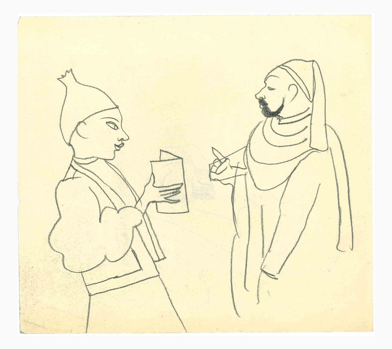 Figures is a pencil Drawing realized by Mino Maccari (1924-1989) in the Mid-20th Century. Good conditions. Mino Maccari (Siena, 1924-Rome, June 16, 1989) was an Italian writer, painter, engraver and journalist, winner of the Feltrinelli Prize for Painting in 1963 and first winner of the Forte dei Marmi Satira Prize in 1973.After completing his secondary education, he enrolls in university. An interventionist like many young people of his time, he took part in the Great War at the age of nineteen as a field artillery officer. At the end of the conflict he resumed his university studies in Siena and in 1920 he graduated in law. In 1924 he was called by Angiolo Bencini to take care of the printing of the magazine Il Selvaggio, openly uncompromising fascist, revolutionary and anti-bourgeois, where his first engravings were published. After a few years of coexistence between work at the newspaper and the law firm, at the beginning of 1926 he left the legal profession to take over the direction of Il Selvaggio which he would hold until 1942. In 1928 he was the author of the small book published by Vallecchi (Florence), Il Trastullo di Strapaese (little songs and engraved woodwinds) which collected fascist songs (the same book was seized several times from Antonio Gramsci during his detention). with the transfer of the editorial staff of the Selvaggio in 1925 from Colle di Val d'Elsa to Florence, Maccari collaborated with Ardengo Soffici, Ottone Rosai and Achille Lega. In the meantime, between 1927 and 1930, he made himself known to the general public as a painter by participating in various national exhibitions. Also in 1930 Maccari works in Turin at La Stampa as editor-in-chief and has the writer Curzio Malaparte as director. His presence in the cultural and editorial world of the fascist regime is very intense, he writes and collaborates with various magazines: Quadrivio, L'Italia Letteraria, L'Italiano and Omnibus by Leo Longanesi; then, during the war, in il Primato di Bottai and, subsequently again, in Il Mondo di Pannunzio (from the first number, in 1949), up to Documento by Federigo Valli. His graphic production is also vast, ranging from the Album of Vallecchi (1925), Il trastullo di Strapaese (1928) to Linoleum (1931). Maccari illustrated in 1934 La vecchia del Bal Bullier by Antonio Baldini and in 1942 he published the Album folder, followed by Come quando fuori Piove and Il superfluo illustrata.For his pictorial work full of evident chromatic accentuations and fast brushstrokes, the violent drawing combined with the lively stroke of the graphic sign of his engravings, he is recognized by critics as a complete artist. In 1962 he was also entrusted with the presidency of the Accademia di San Luca in Rome and managed to obtain a personal exhibition at Gallery 63 in New York. His production of drawings, watercolors, temperas, etc. is endless, sometimes in collaboration with prestigious publishing houses; it is worth mentioning, just as an excellent example, the 32 b/w and color drawings with which he illustrated Il gusto di vivere, a volume that collects writings by Giancarlo Fusco, edited by Natalia Aspesi and published by Laterza in 1985. Maccari, Sienese and great contradaiolo della Torre, painted the Palio of 16 August 1970 won by Selva. In 1973 he was awarded the Political Satire Award of Forte dei Marmi, an award born in that year. He died without great fanfare, in silence, at the age of ninety, in Rome on June 16, 1989.