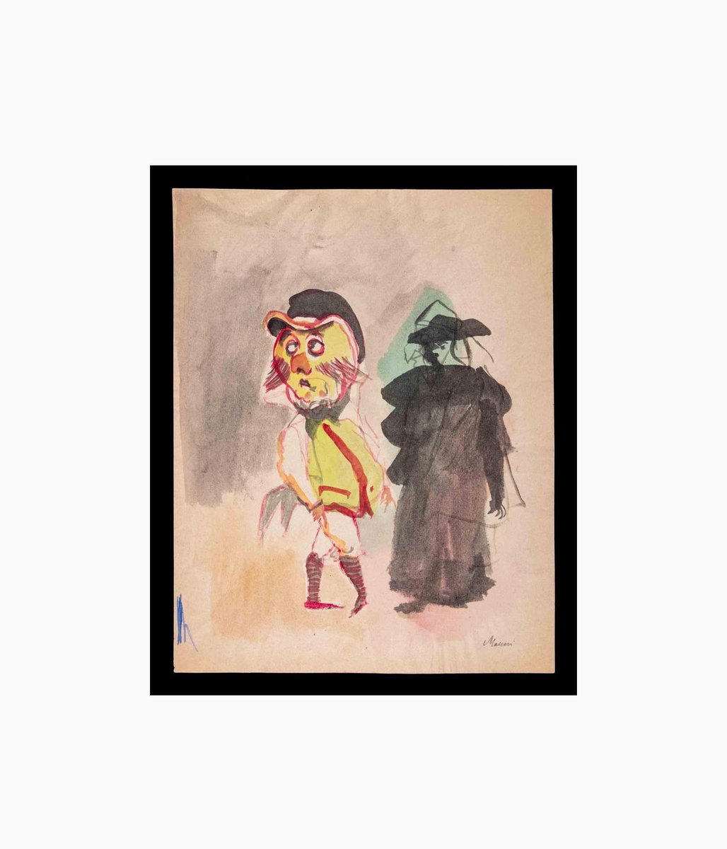 Maggio Fiorentino is a Watercolor Drawing realized by Mino Maccari (1924-1989) in 1940s. Hand-signed on the lower margin. Good condition on a yellowed paper. Mino Maccari (Siena, 1924-Rome, June 16, 1989) was an Italian writer, painter, engraver and journalist, winner of the Feltrinelli Prize for Painting in 1963 and first winner of the Forte dei Marmi Satira Prize in 1973.After completing his secondary education, he enrolls in university. An interventionist like many young people of his time, he took part in the Great War at the age of nineteen as a field artillery officer. At the end of the conflict he resumed his university studies in Siena and in 1920 he graduated in law. In 1924 he was called by Angiolo Bencini to take care of the printing of the magazine Il Selvaggio, openly uncompromising fascist, revolutionary and anti-bourgeois, where his first engravings were published. After a few years of coexistence between work at the newspaper and the law firm, at the beginning of 1926 he left the legal profession to take over the direction of Il Selvaggio which he would hold until 1942. In 1928 he was the author of the small book published by Vallecchi (Florence), Il Trastullo di Strapaese (little songs and engraved woodwinds) which collected fascist songs (the same book was seized several times from Antonio Gramsci during his detention). with the transfer of the editorial staff of the Selvaggio in 1925 from Colle di Val d'Elsa to Florence, Maccari collaborated with Ardengo Soffici, Ottone Rosai and Achille Lega. In the meantime, between 1927 and 1930, he made himself known to the general public as a painter by participating in various national exhibitions. Also in 1930 Maccari works in Turin at La Stampa as editor-in-chief and has the writer Curzio Malaparte as director. His presence in the cultural and editorial world of the fascist regime is very intense, he writes and collaborates with various magazines: Quadrivio, L'Italia Letteraria, L'Italiano and Omnibus by Leo Longanesi; then, during the war, in il Primato di Bottai and, subsequently again, in Il Mondo di Pannunzio (from the first number, in 1949), up to Documento by Federigo Valli. His graphic production is also vast, ranging from the Album of Vallecchi (1925), Il trastullo di Strapaese (1928) to Linoleum (1931). Maccari illustrated in 1934 La vecchia del Bal Bullier by Antonio Baldini and in 1942 he published the Album folder, followed by Come quando fuori Piove and Il superfluo illustrata.For his pictorial work full of evident chromatic accentuations and fast brushstrokes, the violent drawing combined with the lively stroke of the graphic sign of his engravings, he is recognized by critics as a complete artist. In 1962 he was also entrusted with the presidency of the Accademia di San Luca in Rome and managed to obtain a personal exhibition at Gallery 63 in New York. His production of drawings, watercolors, temperas, etc. is endless, sometimes in collaboration with prestigious publishing houses; it is worth mentioning, just as an excellent example, the 32 b/w and color drawings with which he illustrated Il gusto di vivere, a volume that collects writings by Giancarlo Fusco, edited by Natalia Aspesi and published by Laterza in 1985. Maccari, Sienese and great contradaiolo della Torre, painted the Palio of 16 August 1970 won by Selva. In 1973 he was awarded the Political Satire Award of Forte dei Marmi, an award born in that year. He died without great fanfare, in silence, at the age of ninety, in Rome on June 16, 1989.