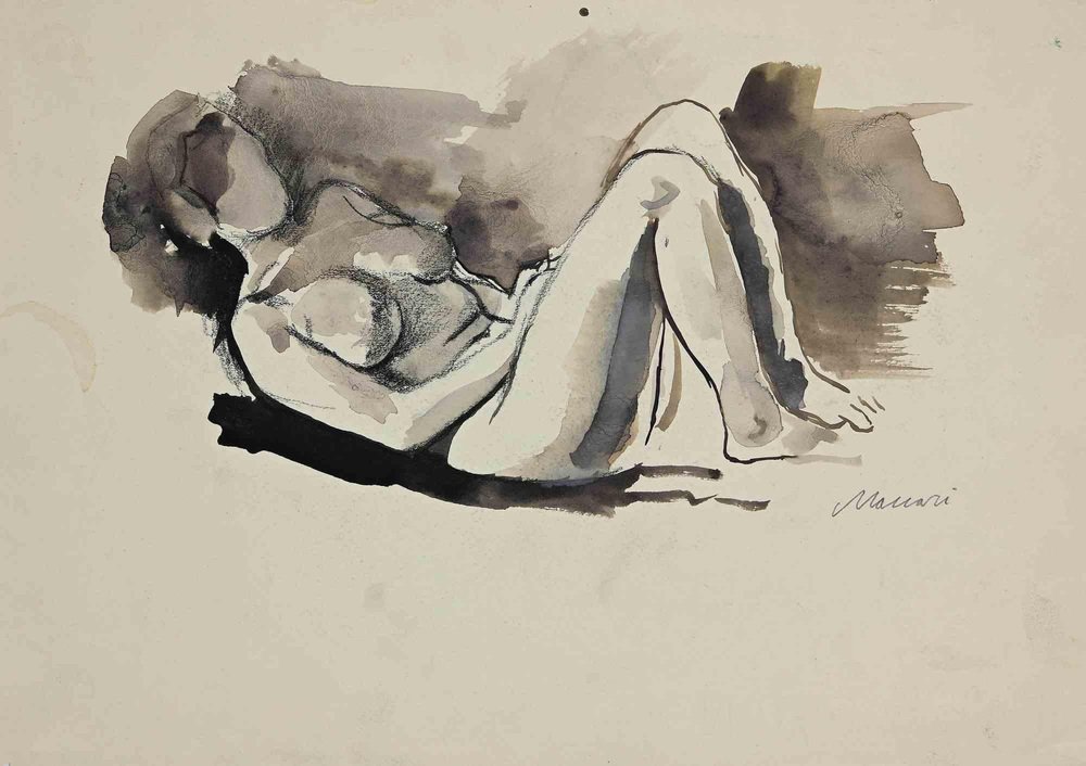 Mino Maccari, Reclined Nude, Original Drawing, Mid 20th-Century