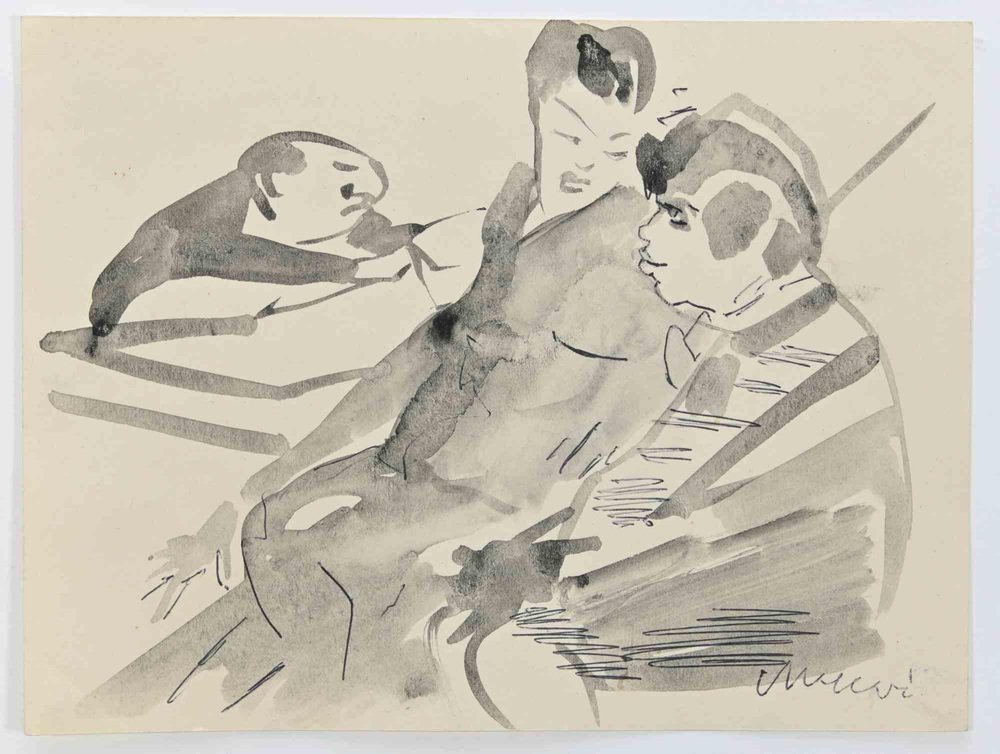 Tenderness is a pen and watercolor Drawing realized by Mino Maccari (1924-1989) in 1960s. Hand-signed on the lower margin. Good condition. Mino Maccari (Siena, 1924-Rome, June 16, 1989) was an Italian writer, painter, engraver and journalist, winner of the Feltrinelli Prize for Painting in 1963 and first winner of the Forte dei Marmi Satira Prize in 1973.After completing his secondary education, he enrolls in university. An interventionist like many young people of his time, he took part in the Great War at the age of nineteen as a field artillery officer. At the end of the conflict he resumed his university studies in Siena and in 1920 he graduated in law. In 1924 he was called by Angiolo Bencini to take care of the printing of the magazine Il Selvaggio, openly uncompromising fascist, revolutionary and anti-bourgeois, where his first engravings were published. After a few years of coexistence between work at the newspaper and the law firm, at the beginning of 1926 he left the legal profession to take over the direction of Il Selvaggio which he would hold until 1942. In 1928 he was the author of the small book published by Vallecchi (Florence), Il Trastullo di Strapaese (little songs and engraved woodwinds) which collected fascist songs (the same book was seized several times from Antonio Gramsci during his detention). with the transfer of the editorial staff of the Selvaggio in 1925 from Colle di Val d'Elsa to Florence, Maccari collaborated with Ardengo Soffici, Ottone Rosai and Achille Lega. In the meantime, between 1927 and 1930, he made himself known to the general public as a painter by participating in various national exhibitions. Also in 1930 Maccari works in Turin at La Stampa as editor-in-chief and has the writer Curzio Malaparte as director. His presence in the cultural and editorial world of the fascist regime is very intense, he writes and collaborates with various magazines: Quadrivio, L'Italia Letteraria, L'Italiano and Omnibus by Leo Longanesi; then, during the war, in il Primato di Bottai and, subsequently again, in Il Mondo di Pannunzio (from the first number, in 1949), up to Documento by Federigo Valli. His graphic production is also vast, ranging from the Album of Vallecchi (1925), Il trastullo di Strapaese (1928) to Linoleum (1931). Maccari illustrated in 1934 La vecchia del Bal Bullier by Antonio Baldini and in 1942 he published the Album folder, followed by Come quando fuori Piove and Il superfluo illustrata.For his pictorial work full of evident chromatic accentuations and fast brushstrokes, the violent drawing combined with the lively stroke of the graphic sign of his engravings, he is recognized by critics as a complete artist. In 1962 he was also entrusted with the presidency of the Accademia di San Luca in Rome and managed to obtain a personal exhibition at Gallery 63 in New York. His production of drawings, watercolors, temperas, etc. is endless, sometimes in collaboration with prestigious publishing houses; it is worth mentioning, just as an excellent example, the 32 b/w and color drawings with which he illustrated Il gusto di vivere, a volume that collects writings by Giancarlo Fusco, edited by Natalia Aspesi and published by Laterza in 1985. Maccari, Sienese and great contradaiolo della Torre, painted the Palio of 16 August 1970 won by Selva. In 1973 he was awarded the Political Satire Award of Forte dei Marmi, an award born in that year. He died without great fanfare, in silence, at the age of ninety, in Rome on June 16, 1989.