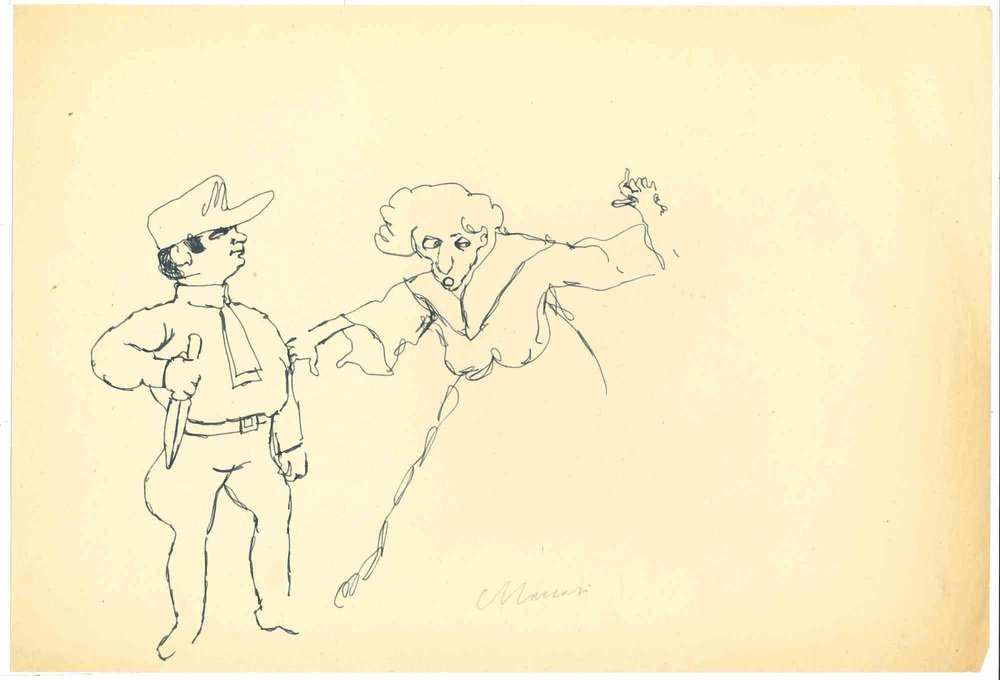 The Old and Soldier is a pen Drawing realized by Mino Maccari (1924-1989) in the 1950s. Hand-signed on the lower. Good condition except for a cut on the right margins. Mino Maccari (Siena, 1924-Rome, June 16, 1989) was an Italian writer, painter, engraver and journalist, winner of the Feltrinelli Prize for Painting in 1963 and first winner of the Forte dei Marmi Satira Prize in 1973.After completing his secondary education, he enrolls in university. An interventionist like many young people of his time, he took part in the Great War at the age of nineteen as a field artillery officer. At the end of the conflict he resumed his university studies in Siena and in 1920 he graduated in law. In 1924 he was called by Angiolo Bencini to take care of the printing of the magazine Il Selvaggio, openly uncompromising fascist, revolutionary and anti-bourgeois, where his first engravings were published. After a few years of coexistence between work at the newspaper and the law firm, at the beginning of 1926 he left the legal profession to take over the direction of Il Selvaggio which he would hold until 1942. In 1928 he was the author of the small book published by Vallecchi (Florence), Il Trastullo di Strapaese (little songs and engraved woodwinds) which collected fascist songs (the same book was seized several times from Antonio Gramsci during his detention). with the transfer of the editorial staff of the Selvaggio in 1925 from Colle di Val d'Elsa to Florence, Maccari collaborated with Ardengo Soffici, Ottone Rosai and Achille Lega. In the meantime, between 1927 and 1930, he made himself known to the general public as a painter by participating in various national exhibitions. Also in 1930 Maccari works in Turin at La Stampa as editor-in-chief and has the writer Curzio Malaparte as director. His presence in the cultural and editorial world of the fascist regime is very intense, he writes and collaborates with various magazines: Quadrivio, L'Italia Letteraria, L'Italiano and Omnibus by Leo Longanesi; then, during the war, in il Primato di Bottai and, subsequently again, in Il Mondo di Pannunzio (from the first number, in 1949), up to Documento by Federigo Valli. His graphic production is also vast, ranging from the Album of Vallecchi (1925), Il trastullo di Strapaese (1928) to Linoleum (1931). Maccari illustrated in 1934 La vecchia del Bal Bullier by Antonio Baldini and in 1942 he published the Album folder, followed by Come quando fuori Piove and Il superfluo illustrata.For his pictorial work full of evident chromatic accentuations and fast brushstrokes, the violent drawing combined with the lively stroke of the graphic sign of his engravings, he is recognized by critics as a complete artist. In 1962 he was also entrusted with the presidency of the Accademia di San Luca in Rome and managed to obtain a personal exhibition at Gallery 63 in New York. His production of drawings, watercolors, temperas, etc. is endless, sometimes in collaboration with prestigious publishing houses; it is worth mentioning, just as an excellent example, the 32 b/w and color drawings with which he illustrated Il gusto di vivere, a volume that collects writings by Giancarlo Fusco, edited by Natalia Aspesi and published by Laterza in 1985. Maccari, Sienese and great contradaiolo della Torre, painted the Palio of 16 August 1970 won by Selva. In 1973 he was awarded the Political Satire Award of Forte dei Marmi, an award born in that year. He died without great fanfare, in silence, at the age of ninety, in Rome on June 16, 1989.