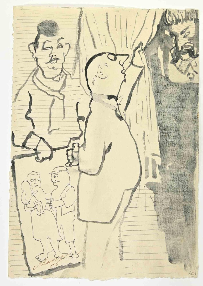 The Painter is an ink and Watercolor Drawing realized by Mino Maccari (1924-1989) in 1956. Hand-signed on the lower and dated Good conditions. Mino Maccari (Siena, 1924-Rome, June 16, 1989) was an Italian writer, painter, engraver and journalist, winner of the Feltrinelli Prize for Painting in 1963 and first winner of the Forte dei Marmi Satira Prize in 1973.After completing his secondary education, he enrolls in university. An interventionist like many young people of his time, he took part in the Great War at the age of nineteen as a field artillery officer. At the end of the conflict he resumed his university studies in Siena and in 1920 he graduated in law. In 1924 he was called by Angiolo Bencini to take care of the printing of the magazine Il Selvaggio, openly uncompromising fascist, revolutionary and anti-bourgeois, where his first engravings were published. After a few years of coexistence between work at the newspaper and the law firm, at the beginning of 1926 he left the legal profession to take over the direction of Il Selvaggio which he would hold until 1942. In 1928 he was the author of the small book published by Vallecchi (Florence), Il Trastullo di Strapaese (little songs and engraved woodwinds) which collected fascist songs (the same book was seized several times from Antonio Gramsci during his detention). with the transfer of the editorial staff of the Selvaggio in 1925 from Colle di Val d'Elsa to Florence, Maccari collaborated with Ardengo Soffici, Ottone Rosai and Achille Lega. In the meantime, between 1927 and 1930, he made himself known to the general public as a painter by participating in various national exhibitions. Also in 1930 Maccari works in Turin at La Stampa as editor-in-chief and has the writer Curzio Malaparte as director. His presence in the cultural and editorial world of the fascist regime is very intense, he writes and collaborates with various magazines: Quadrivio, L'Italia Letteraria, L'Italiano and Omnibus by Leo Longanesi; then, during the war, in il Primato di Bottai and, subsequently again, in Il Mondo di Pannunzio (from the first number, in 1949), up to Documento by Federigo Valli. His graphic production is also vast, ranging from the Album of Vallecchi (1925), Il trastullo di Strapaese (1928) to Linoleum (1931). Maccari illustrated in 1934 La vecchia del Bal Bullier by Antonio Baldini and in 1942 he published the Album folder, followed by Come quando fuori Piove and Il superfluo illustrata.For his pictorial work full of evident chromatic accentuations and fast brushstrokes, the violent drawing combined with the lively stroke of the graphic sign of his engravings, he is recognized by critics as a complete artist. In 1962 he was also entrusted with the presidency of the Accademia di San Luca in Rome and managed to obtain a personal exhibition at Gallery 63 in New York. His production of drawings, watercolors, temperas, etc. is endless, sometimes in collaboration with prestigious publishing houses; it is worth mentioning, just as an excellent example, the 32 b/w and color drawings with which he illustrated Il gusto di vivere, a volume that collects writings by Giancarlo Fusco, edited by Natalia Aspesi and published by Laterza in 1985. Maccari, Sienese and great contradaiolo della Torre, painted the Palio of 16 August 1970 won by Selva. In 1973 he was awarded the Political Satire Award of Forte dei Marmi, an award born in that year. He died without great fanfare, in silence, at the age of ninety, in Rome on June 16, 1989.