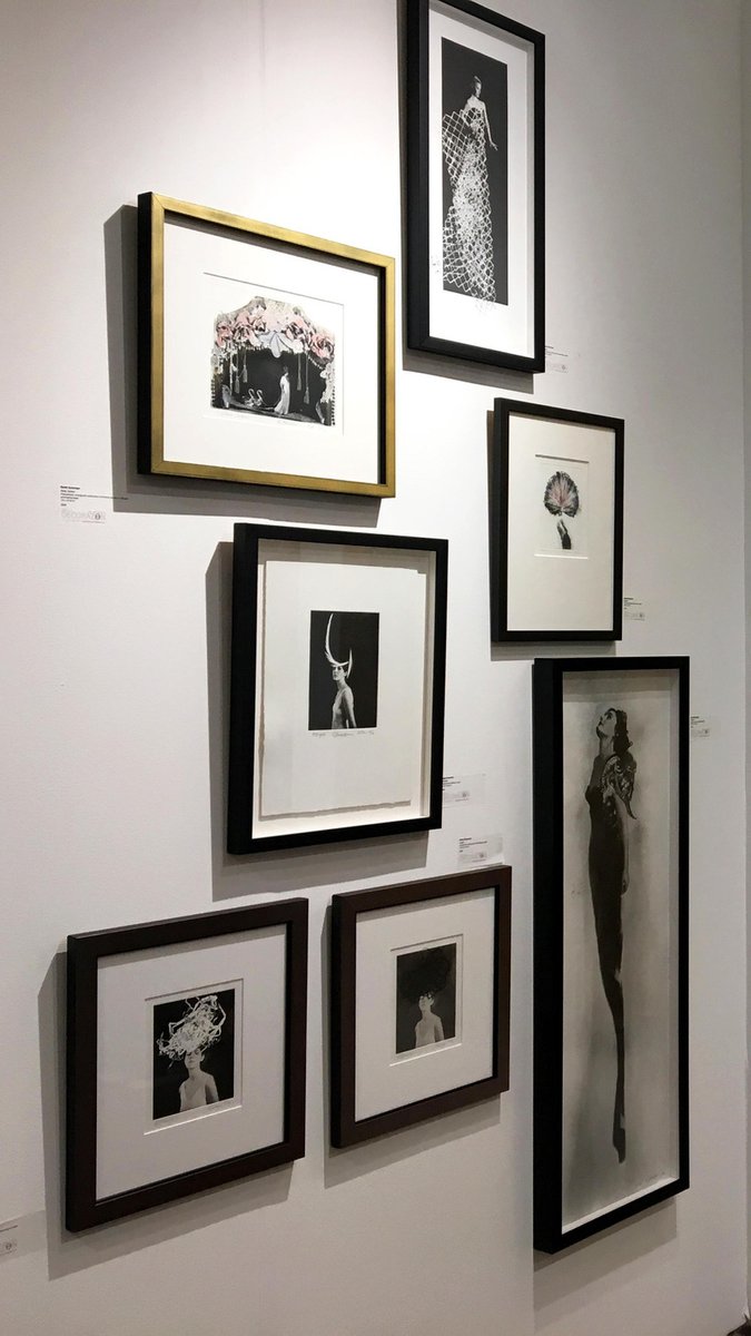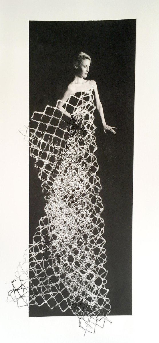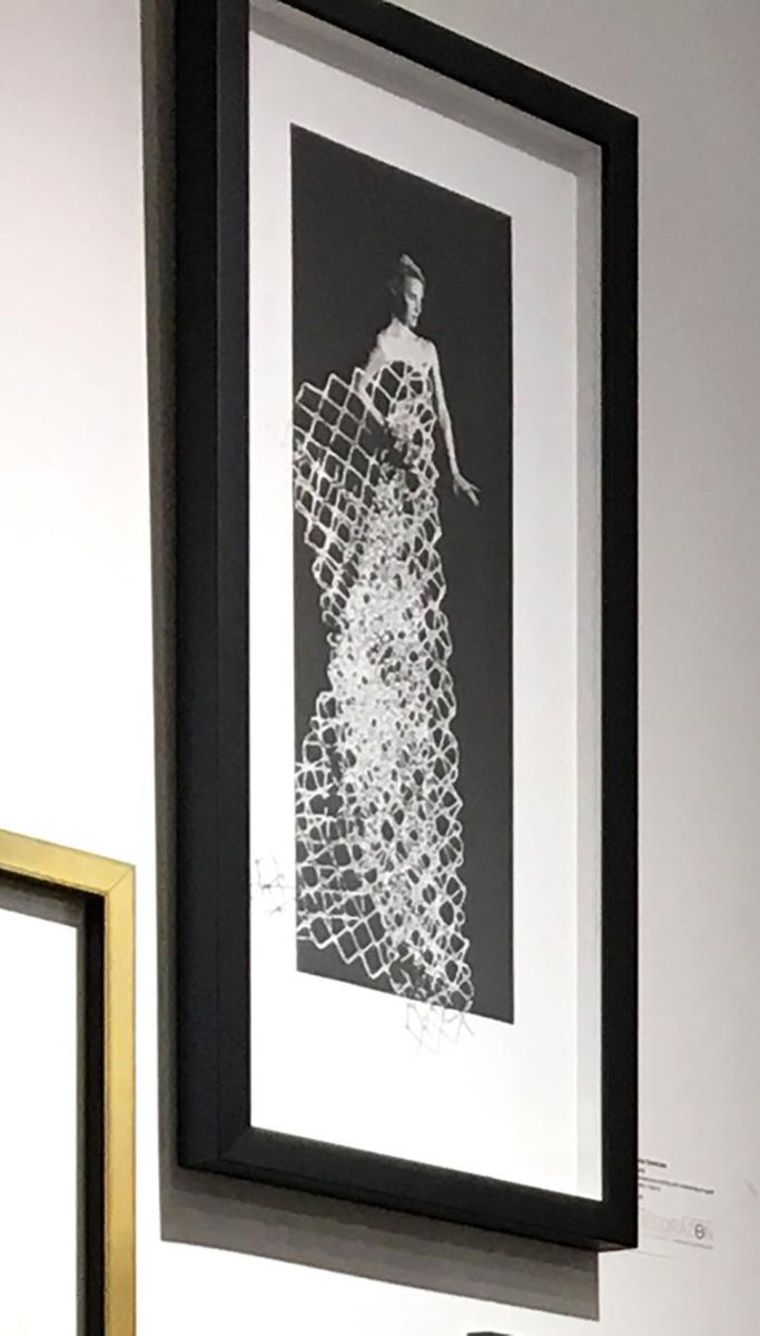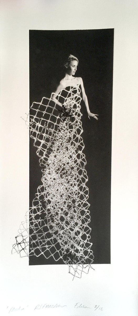 "Moda" is one of Rosie Emerson's newest pieces from her fashion inspired photographic series. This is a photopolymer etching with embossing on paper, framed in a custom box black frame. This is and edition of 12, and each piece is slightly different because they are each hand-made. Moda, Ed 2/12 Photopolymer etching with embossing on paper, framed Artwork: 22" x 10" inches / 55 x 25 cm Rosie Emerson, born in 1981, is a contemporary artist working almost exclusively on representing the female form. Emerson’s figures draw reference from archetypes old and new, from Artemis to the modern day supermodel, each solitary figure, and allegory of her own fantasy. Interested in surface, the interplay between photography and painting. Emerson’s works are playful constructs; Photography is used, not as a device for capturing reality but for creating romanticised optical illusions. Inspired by her love of theatre, performance, shrines and rituals, she uses lighting, costume, set and prop making, alongside printmaking and painting to create other worldly one off pieces. Her photography is inspired by both the drama of the baroque, and ethereal qualities of Pre Raphaelite works. Other important influences include late medieval and renaissance paintings, Japanese prints, and magical realist literature. Emerson’s screen-prints use unusual materials including charcoal powder, ash and saw dust to shift the focus of printmaking from accuracy and replication to the creation of unique, hand-finished prints with subtle texture. She explains ‘By combining photography with painting it allows me to balance energy and precision, and create something, which despite hours of planning will still surprise me in its results.’ Her recent Cyanotype works enable her to montage objects with real size photographic negatives. Using UV light from the sun to expose objects and images directly on to the sensitized surface, the works are often hand painted or gilded with gold leaf. Emerson describes ‘the technique itself has and element of magic about it, it also a wonderful discovery to be able to combine painting, collage and photography in this way’’. Emerson’s work is widely collected and exhibited both in the UK as well as internationally, through galleries, art fairs and museums. She has also worked with brands and individuals including Harvey Nichols, The Ivy Club, Sony, Triumph Underwear, Redbull, P&O Cruises, and Annoushka jewelry .Her work has also been featured in Vogue, Harpers Bazaar, Another Magazine, The Financial Times Magazine and The Sunday Times Style Magazine. In 2014, she was invited to be Artist in residence at Somerset House as part of The National Open Art Competition and was commissioned by Hackney WickED Arts Festival to create a new world record by making the world’s largest Cyanotype photograph, the final artwork measuring 46.8 sq metres. In 2015 she was awarded the Bridgeman Studio Award and took part in the Young Masters Art Prize, exhibiting her works alongside old masters at Sphinx Gallery in London.