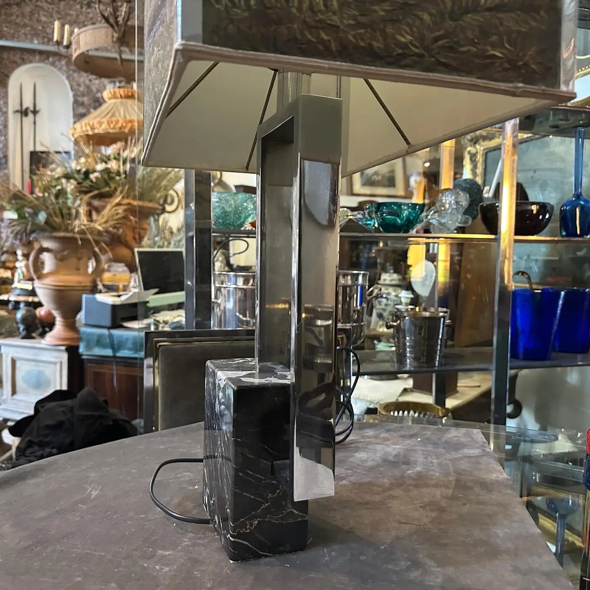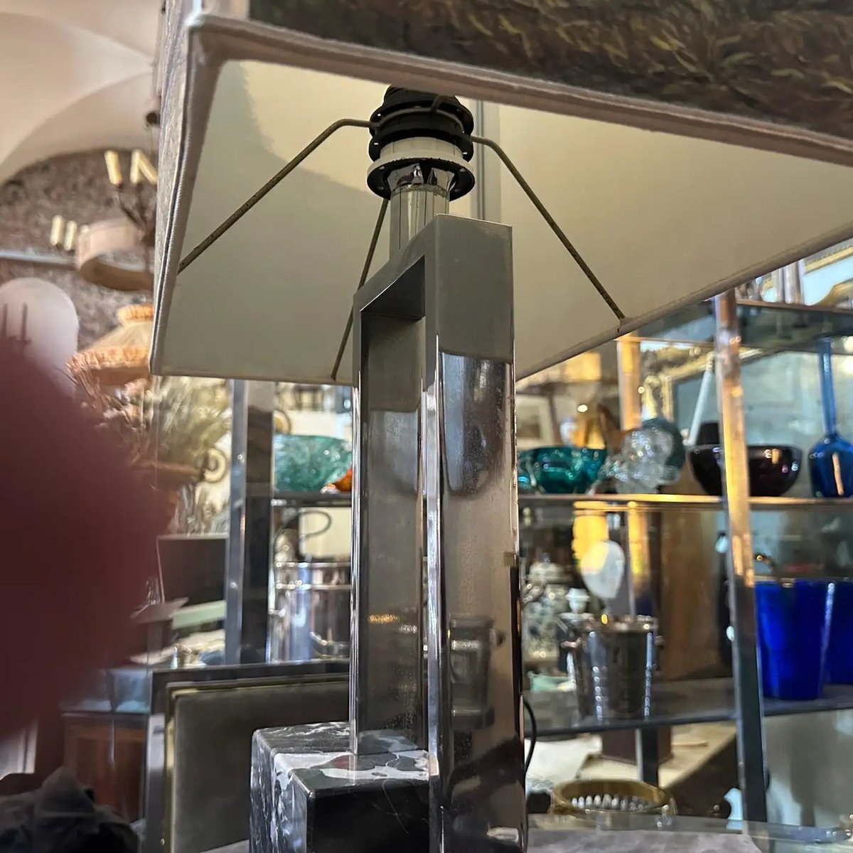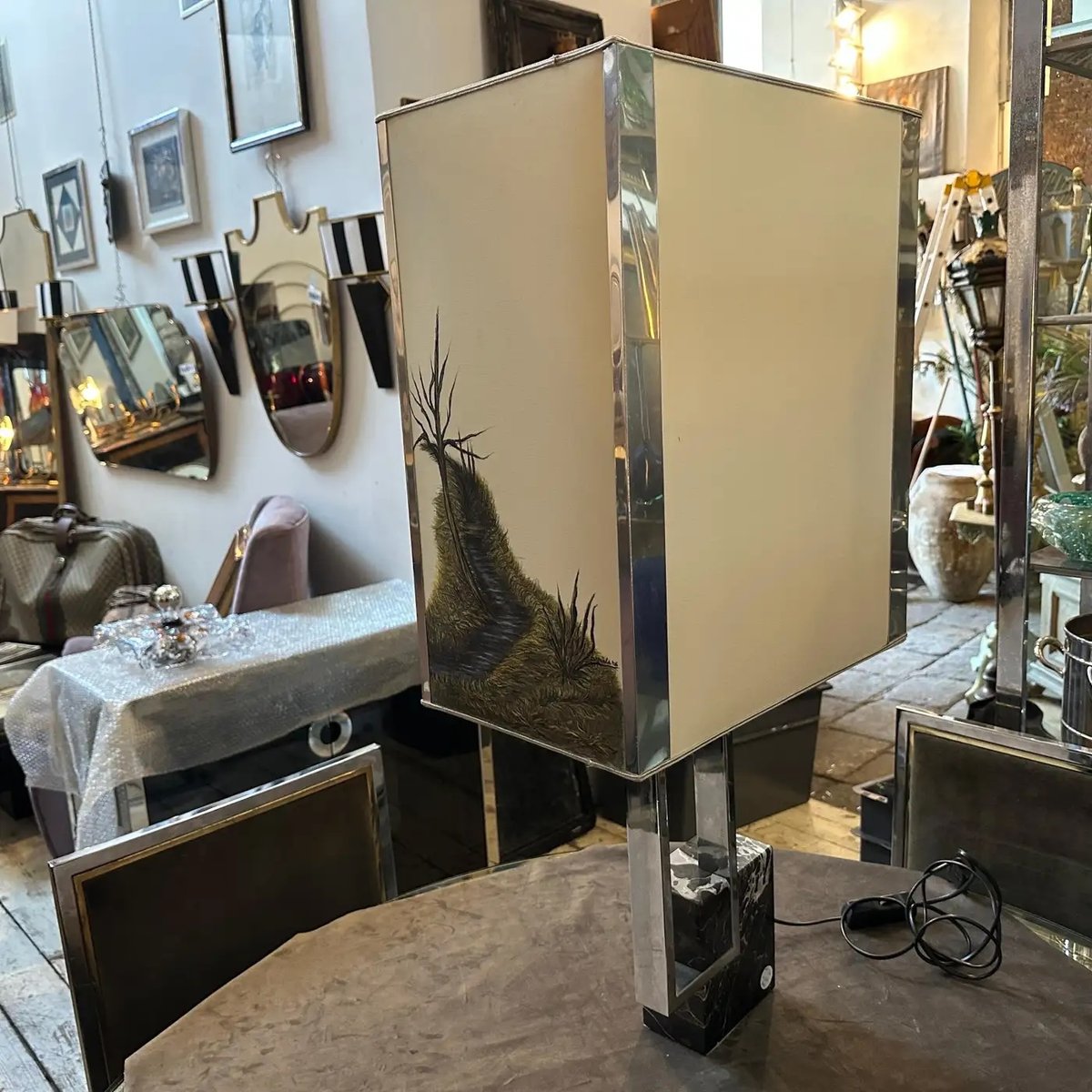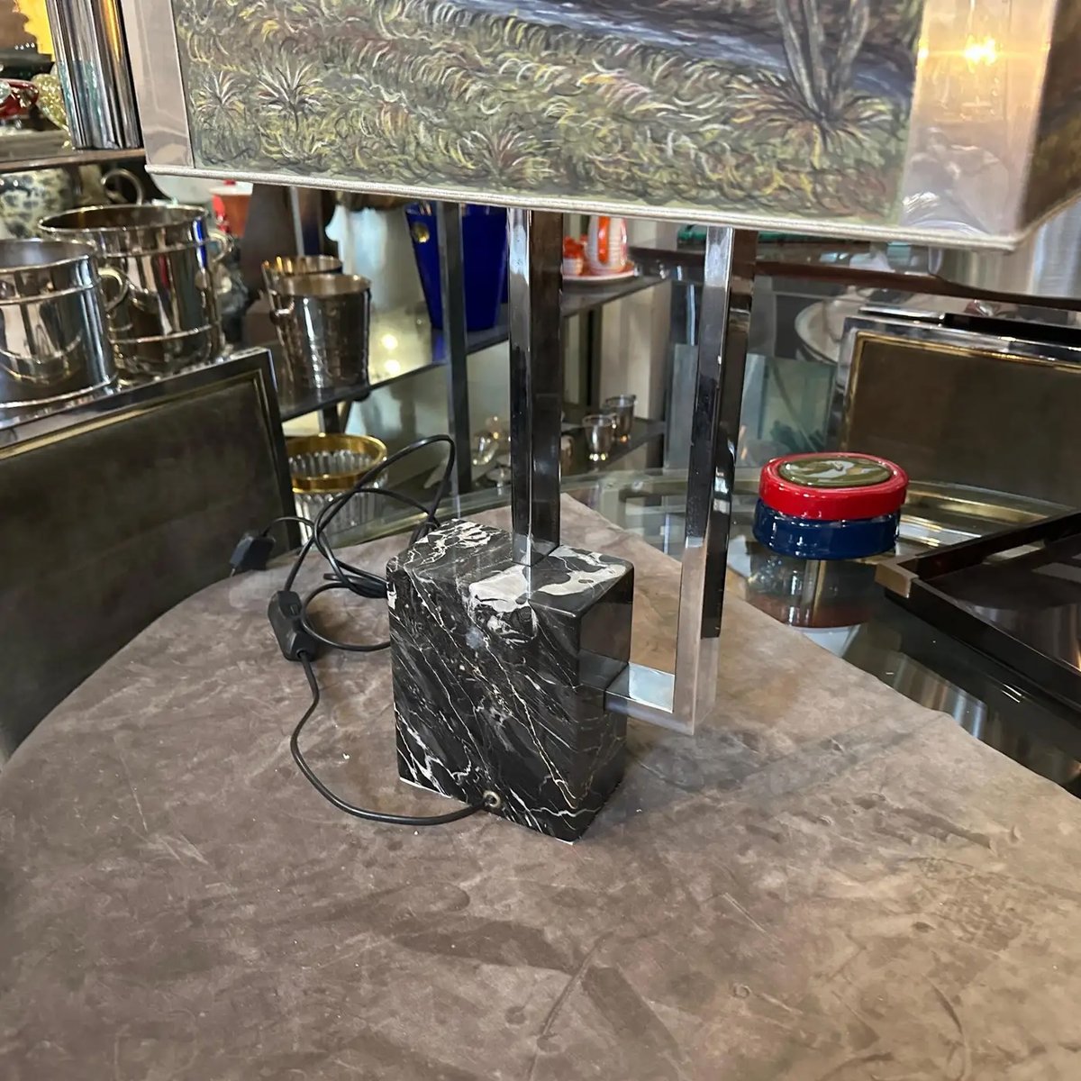 Modernist Chromed Metal and Marble Table Lamp with Hand Painted Lampshade from Banci Firenze, 1970s