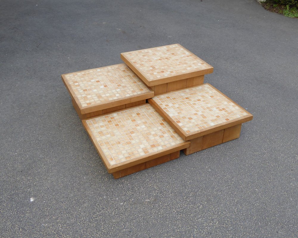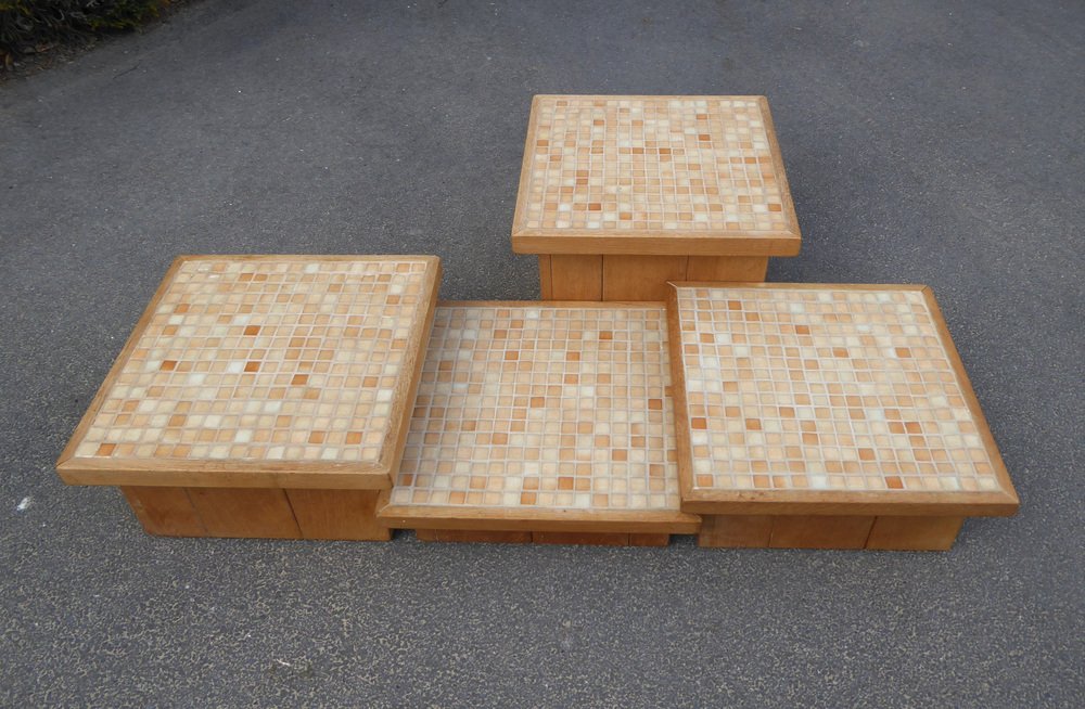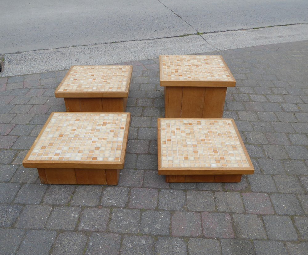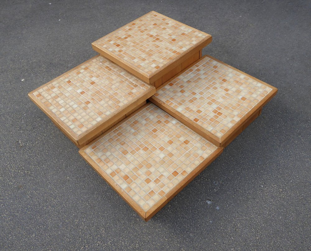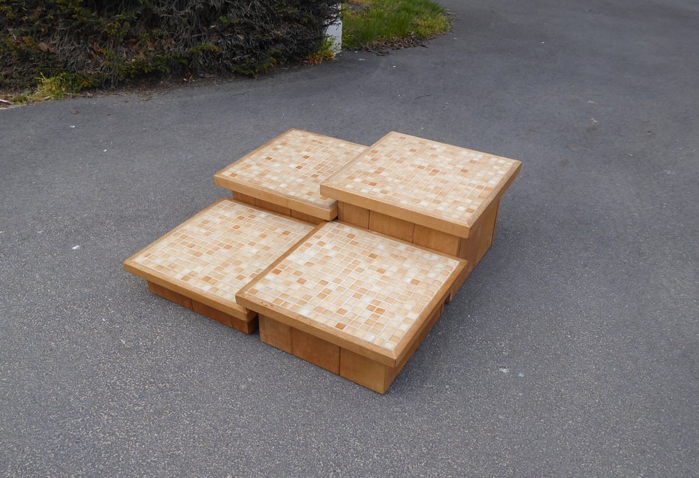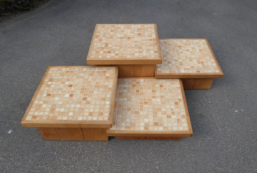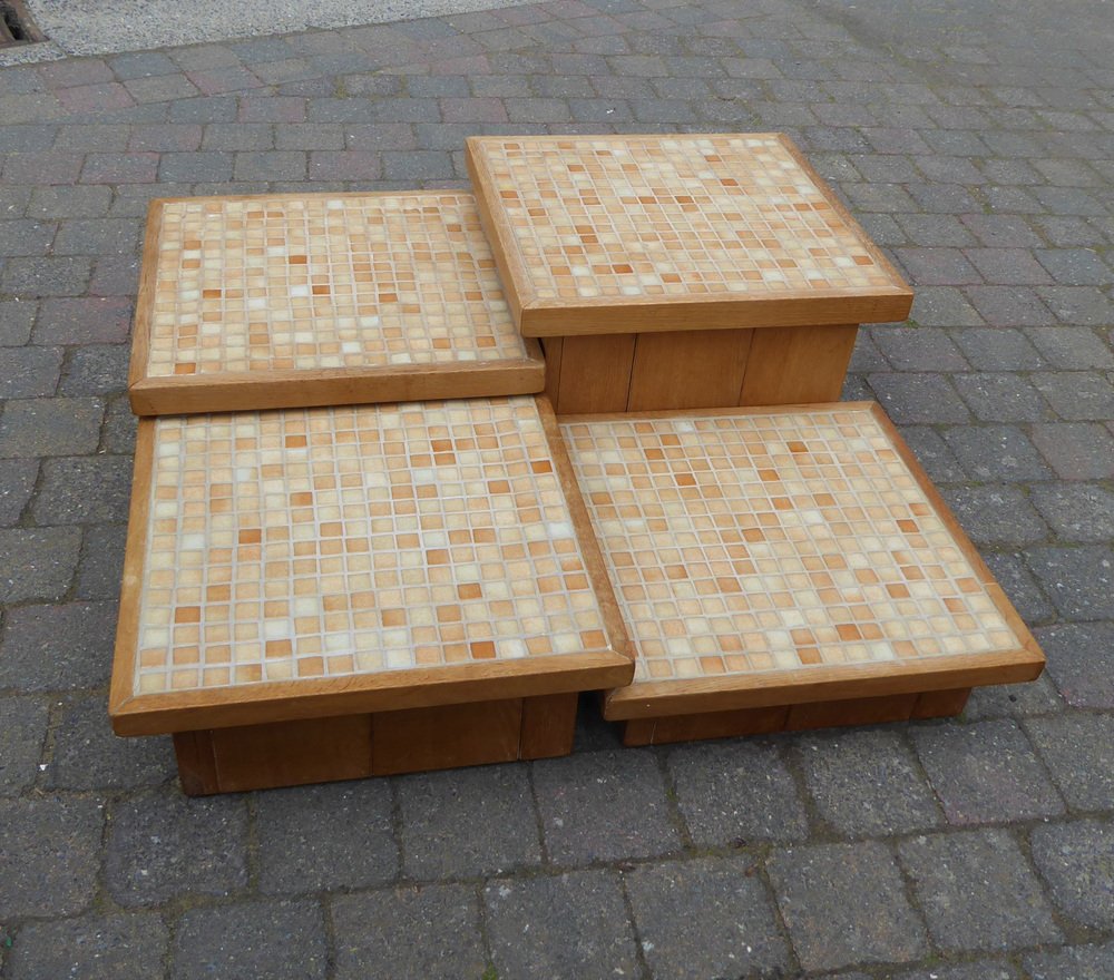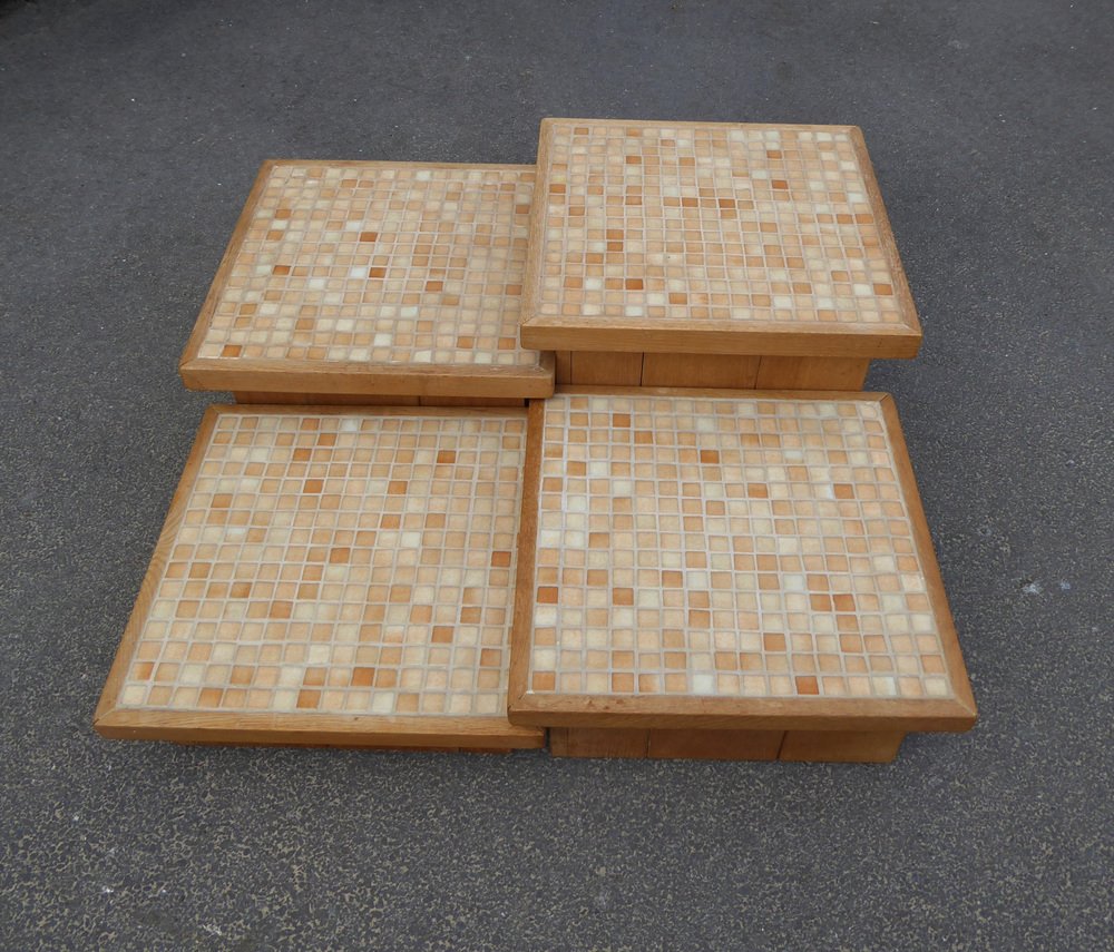 Modular Pink Mosaic and Inlaid Oak Coffee Table, 1960s, Set of 4