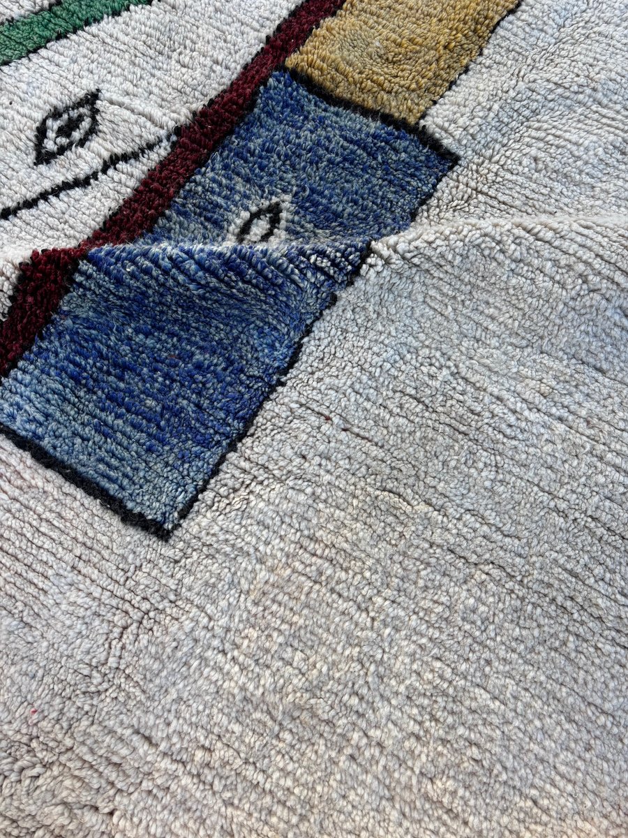 This large Moroccan Boujad rug is an authentic handwoven piece originating from the Middle Atlas region of Morocco, renowned for its expressive designs and artistic freedom. Boujad rugs are celebrated for their bold compositions, symbolic motifs, and vibrant yet balanced color palettes.
