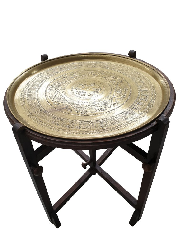 Moroccan Brass Tray Table with Folding Wooden Base, 1960s