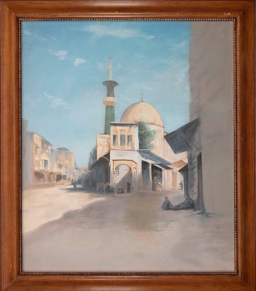 Mosque in Constantinople, Original Tempera & Watercolor on Plywood, Mid-20th Century, Framed