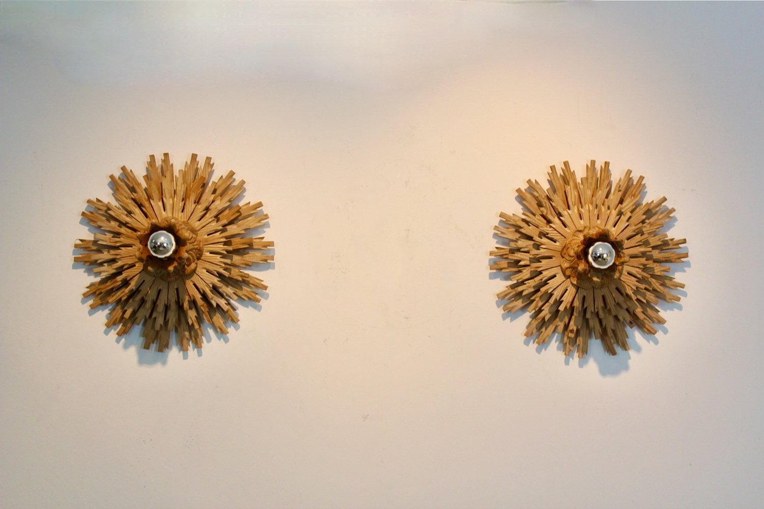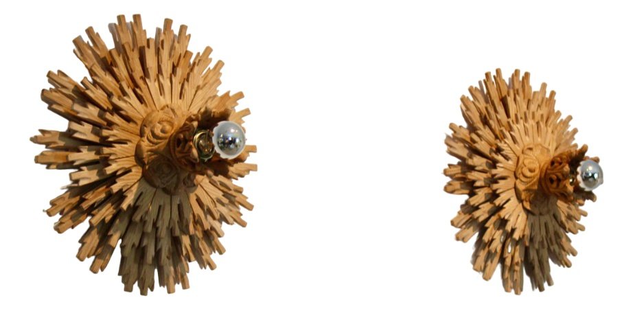 Natrual Large Sunburst Wooden Sconces, 1960s, Set of 2