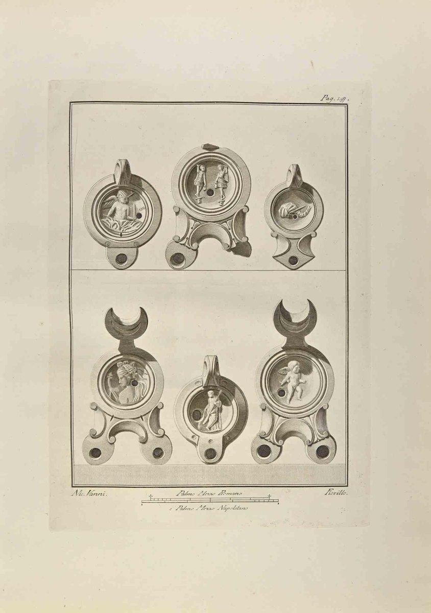 Nicola Fiorillo, Half Moon Oil Lamps with Cupid, Etching, 18th Century