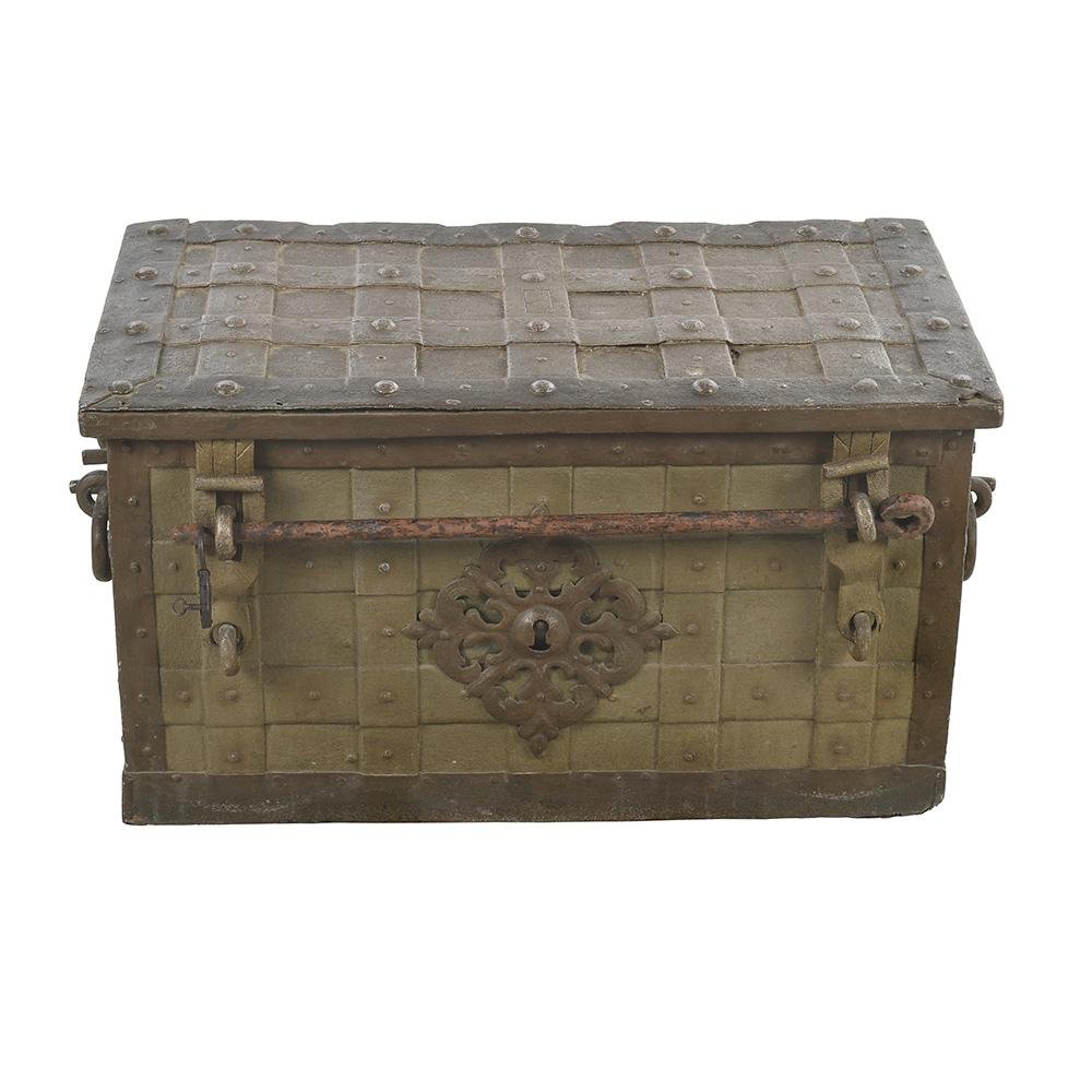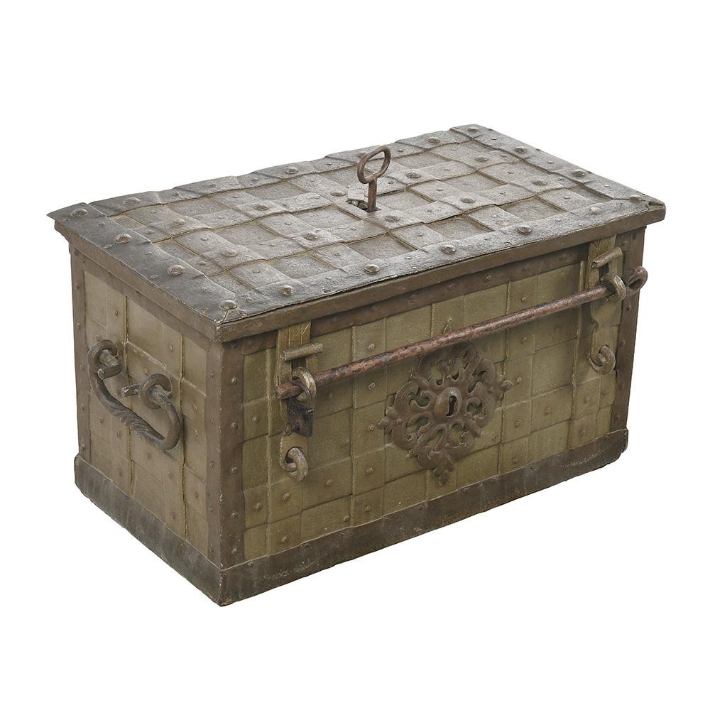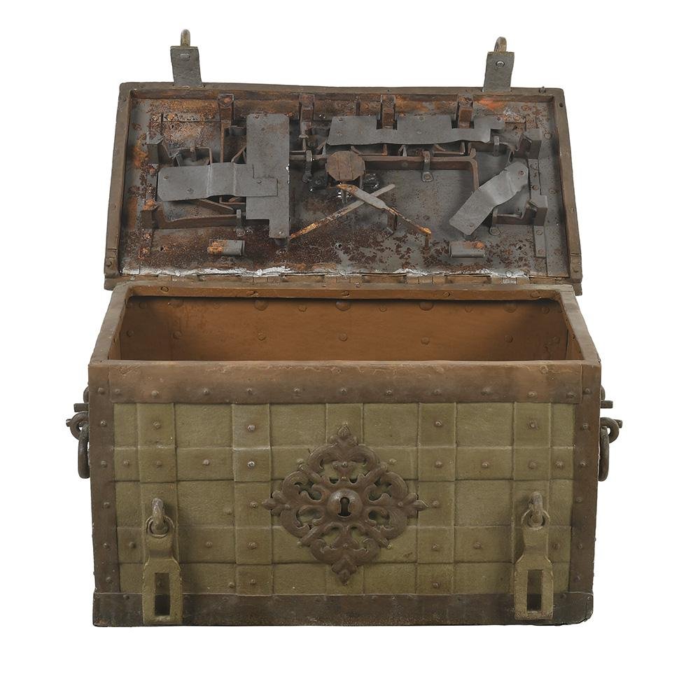 Iron "corsair" or "Nüremberg" chest Germany 17th/18th century Large iron chest with riveted protection bars and side pull handles, a large shield on the front. It opens from the top by means of a double key lock, on the front - the latter being a decoy - and on the lid, the latter enclosing an impressive lock over its entire inner surface. Two lugs allow the addition of a bar and two locks. This type of safe is the ancestor of our modern safes. However, it is designed to be transportable, with its two handles. The double-headed eagle that adorns the front is a heraldic emblem that tells us about the purpose of this safe. It holds in its talons a hand of justice and a sword, a reminder of the regal functions of the Holy Roman Empire. The double-headed eagle is found on coins and on the coats of arms of certain cities or regions (Franche-Comté) that have pledged allegiance to the Emperor, heir to the Rome of the Caesars and to the western half of their empire (the other half is ruled by the Basileus, who reigned in Byzantium-Constantinople until his fall in 1453: Kiev, then Moscow, took over this heritage, becoming "the third Rome", and keeping the Roman Eagle, which had become two-headed since Constantine's division). The closed crown, sign of the Empire, should be on the eagle's head, which may be due to an alteration, but more likely to the ironworker's desire not to multiply the embellishments on a piece intended above all to receive and parry blows, during travel or attacks. The art of ironwork was of prime importance in medieval and modern Europe. Although it was not as precious as gold -rare-, silver or bronze, it underpinned the small but essential industries of the time: it was used to make the irons that powered mills, cartwheels and all the moving and reinforcing parts of buildings. It is omnipresent in defense and attack: chain mail, helmets, armor, swords, arrowheads, spearheads, knives... Its work, which has to do with fire, is a bit like magic, and craftsmen have all their secrets. The creation of a chest like ours is even more complex: in addition to the beating of the metal, which is difficult to produce without a rolling mill, and the size of the pieces, all of which are handled "by hand" above the forge, it required the intervention of a skilled locksmith, or even a clockwork engineer, to design the machinery of the multi-penetration lock. The free city of Nüremberg (in Bavaria) had made a specialty of mechanical craftsmanship, from automata to toys, and developed trade links throughout Europe and the New World from the 16th century onwards. Traditionally, these chests could be taken on board ships, and fixed to the floor in the commander's room, where he deposited his belongings, papers and navigational instruments, or... his treasure. Perhaps the Chevalier de Haddocque's "La Licorne" was equipped with a similar chest?