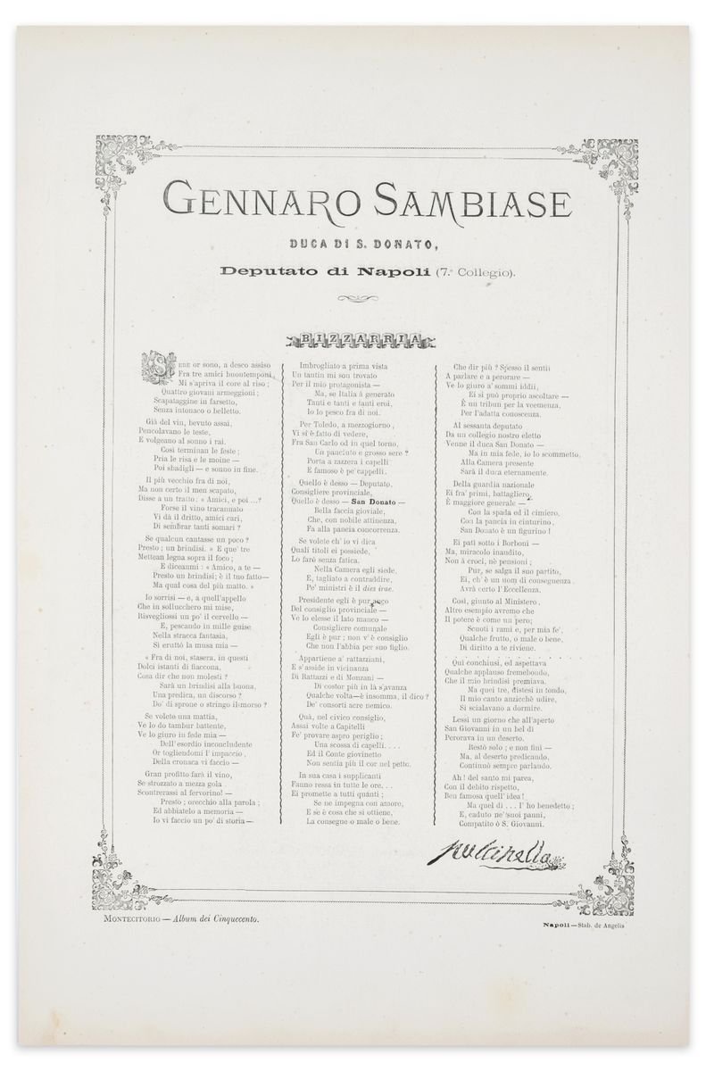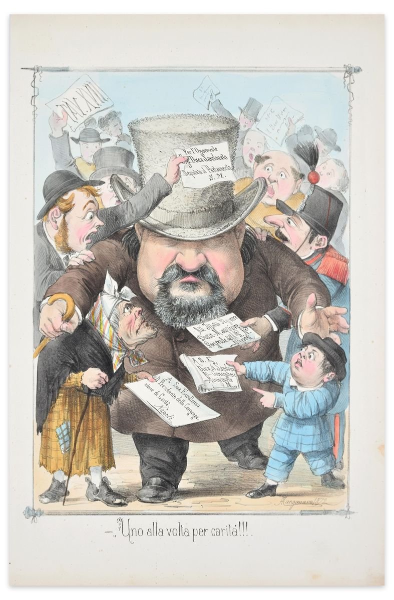 One at a Time is an original lithography artwork realized by Antonio Manganaro, in 1872. Original lithograph, watercolored by hand. Titled in Italian on the lower center'' Uno alla volta per carita!!!''. Good conditions, except for a slightly yellowed paper due to the passing of time and some light foxings. This satirical print is plate n. XVII (as written at the top part of the artwork) from ''The album of the 500'' (Album dei 500), Tipografia De Angelis, Naples, and represents a satirical scene. On the back description in Italian '' Le ferie Lettera Parlamentare'' Signed and dated on the plate on the lower right A. Manganaro. Antonio Manganaro (Manfredonia, 1842 - Naples, 1920) was a painter, caricaturist, and drawing professor. Early designer, at the age of 14, he was sent to Naples at the Royal Institute of Art. The expenses were borne by two local patrons, Baron Cessa and Diego Badarò, who awarded him six ducats a month. He soon passed to painting classes, winning prizes and receiving the praises of his masters, including Maldarelli and Postiglione. Arrested for political conspiracy (his family belonged to the Young Italy), he was ordered to leave Naples. In 1859, he was part of the secret or action committee and, in 1860, he participated in the revolutionary movements that favored the entry of Garibaldi into Naples. Following the General, he participated in numerous feats of arms and was also wounded, obtaining a medal. Taking leave of the Mobile National Guards, he directed a newspaper, The Last Judgment. He was considered one of the leading caricaturists of his era, together with Errico Colonna and Melchiorre Delfico. In 1885, he obtained the chair of design at the Technical School Giambattista Della Porta in Naples. He left many original caricature albums, among which I Cinquecento the Italian Parliament, Eighty Municipal Councilors of the Palazzo San Giacomo, Provincial Councilors of Naples, Contemporanei, etc. This artwork is shipped from Italy. Under existing legislation, any artwork in Italy created over 70 years ago by an artist who has died requires a licence for export regardless of the work’s market price. The shipping may require additional handling days to require the licence according to the final destination of the artwork.