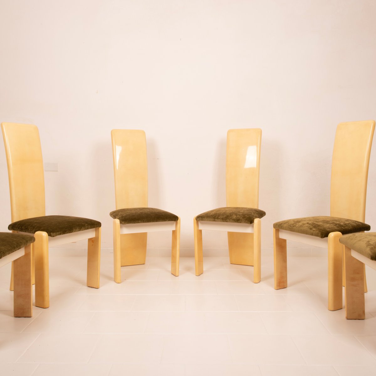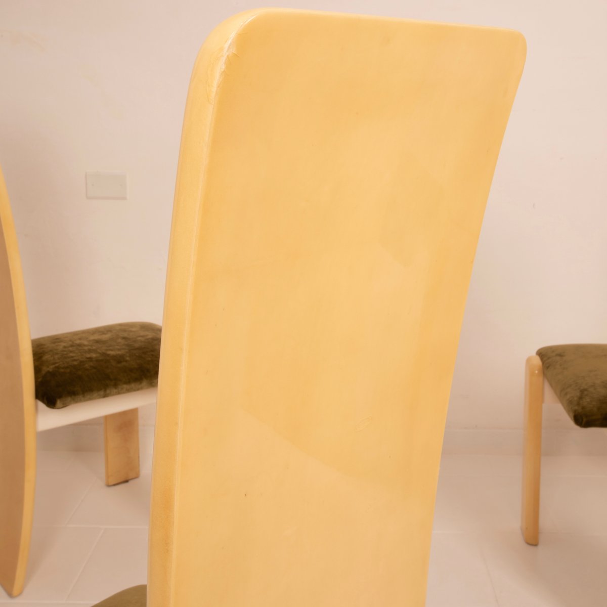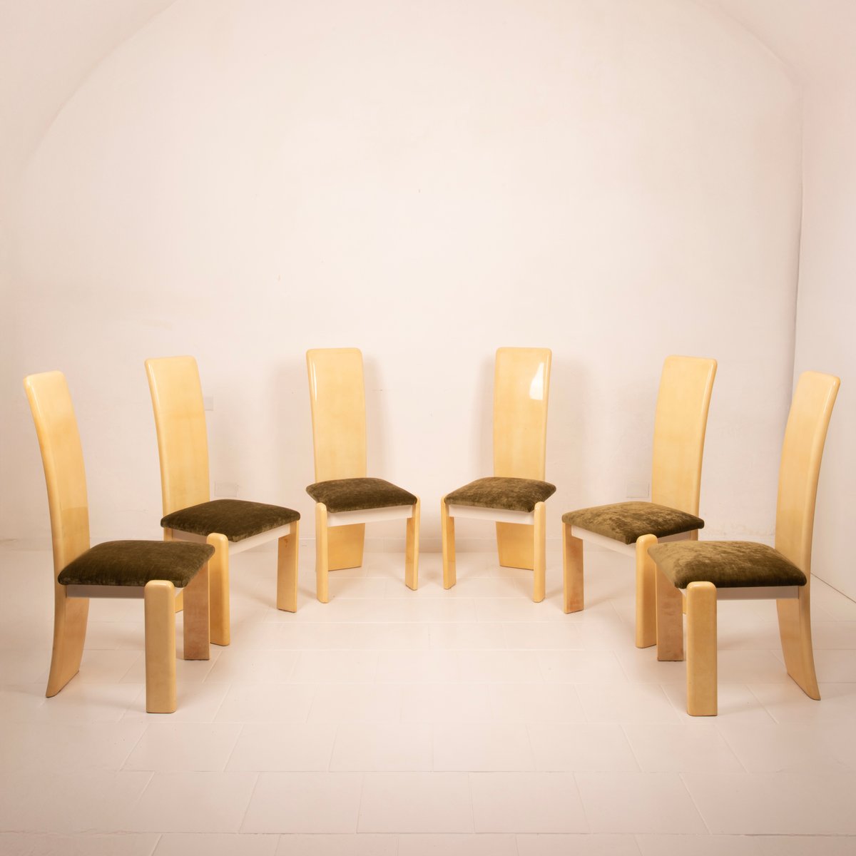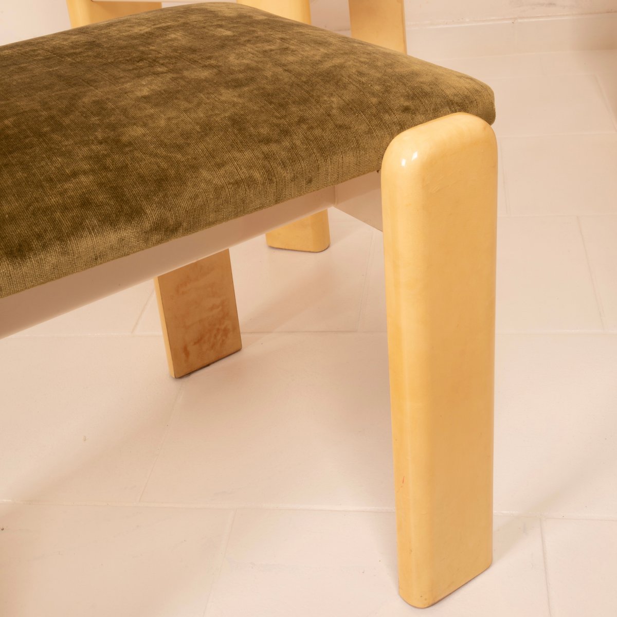 The seats have been reupholstered in green linen velvet, a choice that renews the seating while maintaining stylistic coherence with the original spirit. The velvet, soft to the touch and with its iridescent surface, creates a refined chromatic contrast with the light parchment, reinforcing the sophisticated identity of the ensemble.