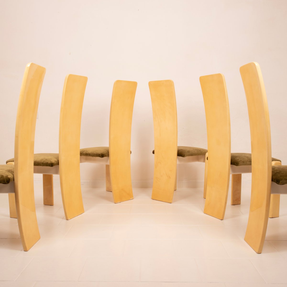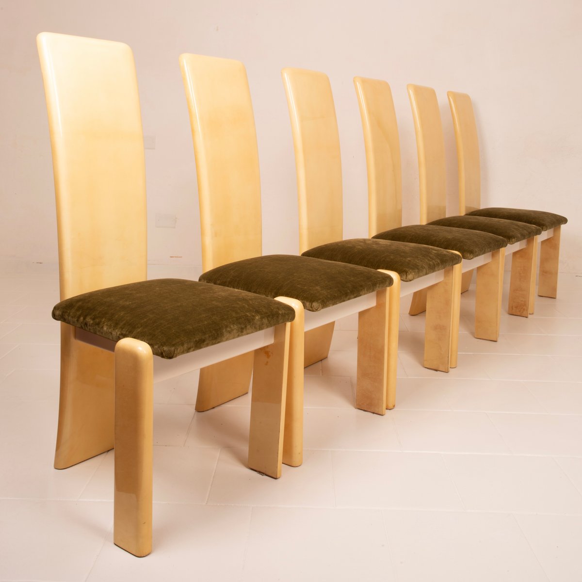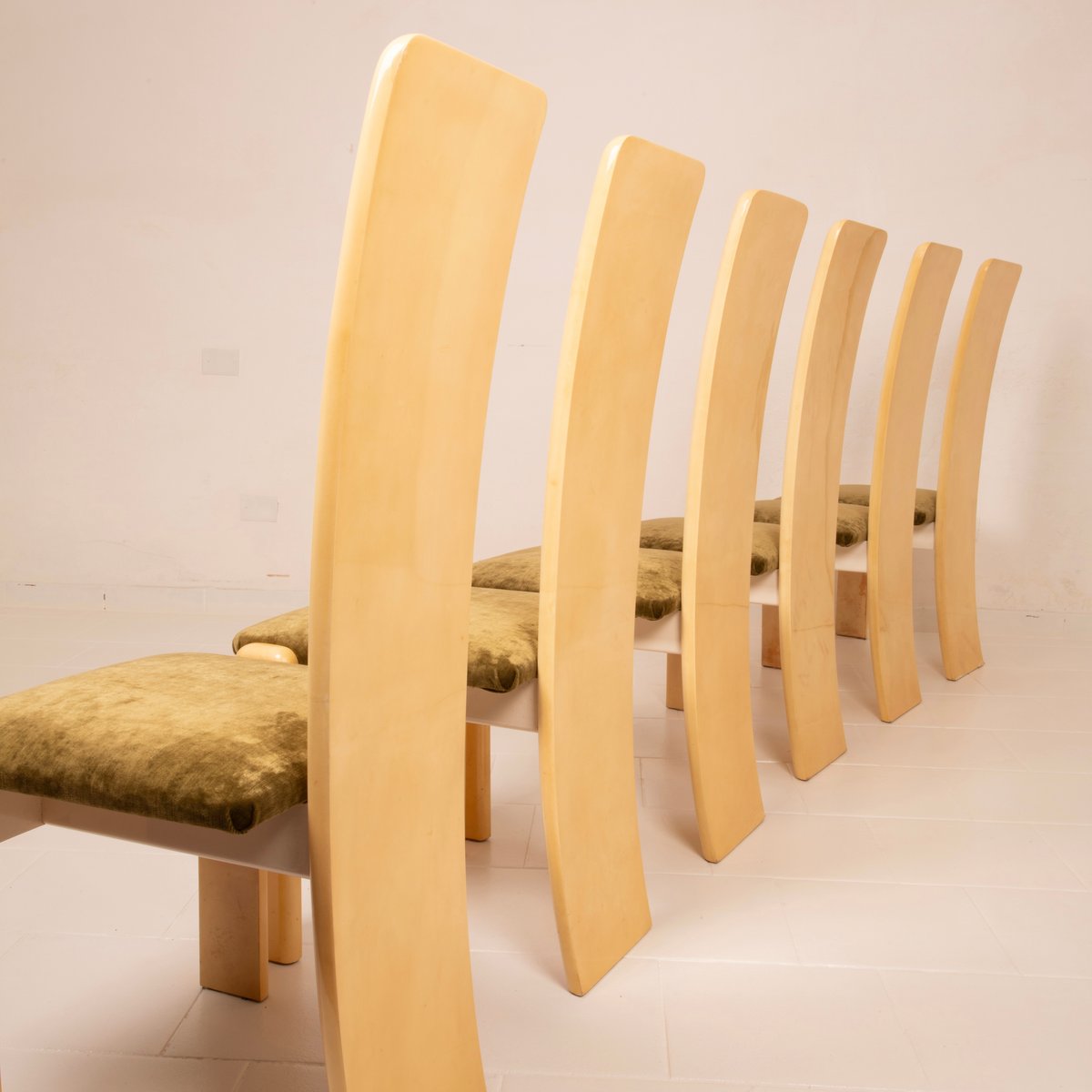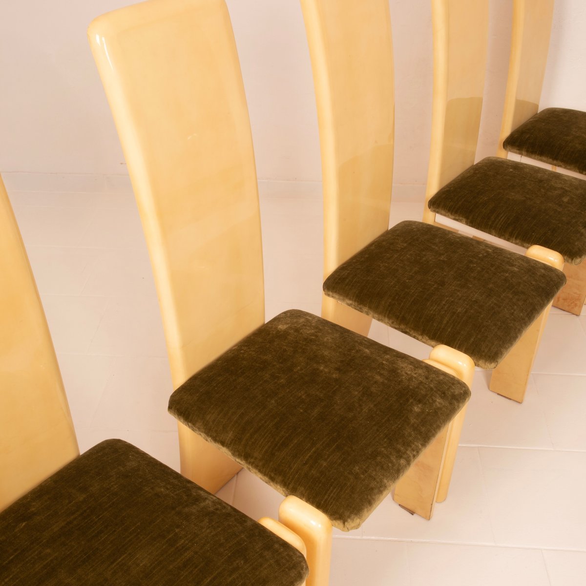 The seats have been reupholstered in green linen velvet, a choice that renews the seating while maintaining stylistic coherence with the original spirit. The velvet, soft to the touch and with its iridescent surface, creates a refined chromatic contrast with the light parchment, reinforcing the sophisticated identity of the ensemble.