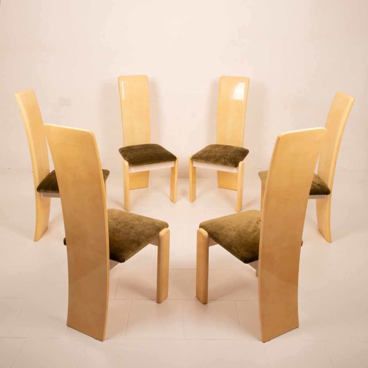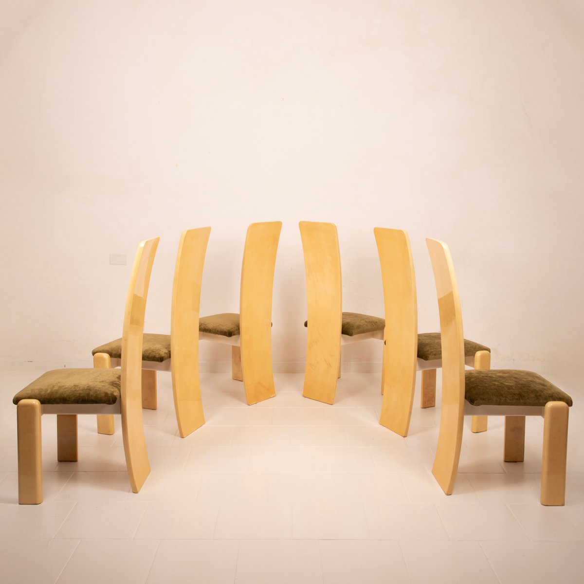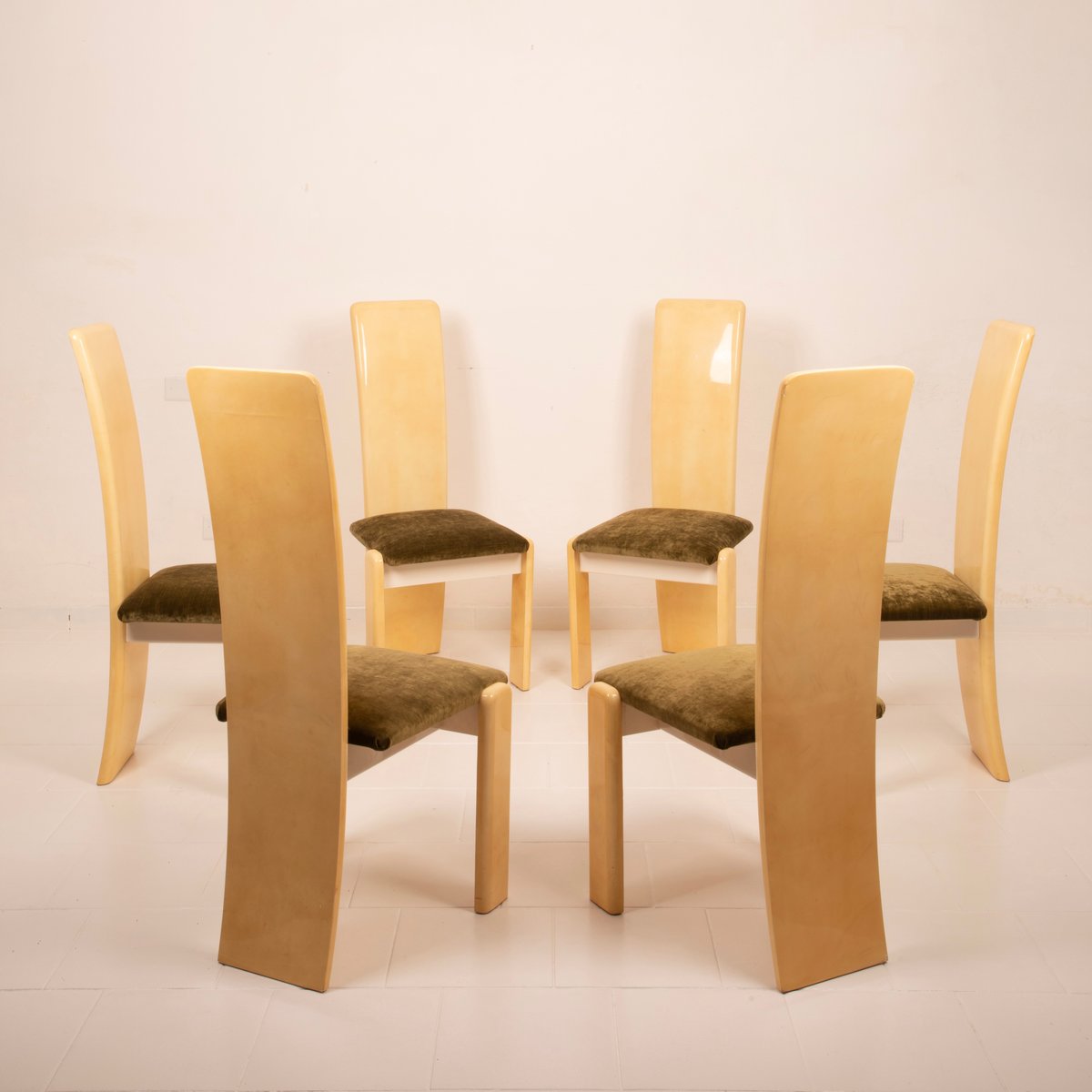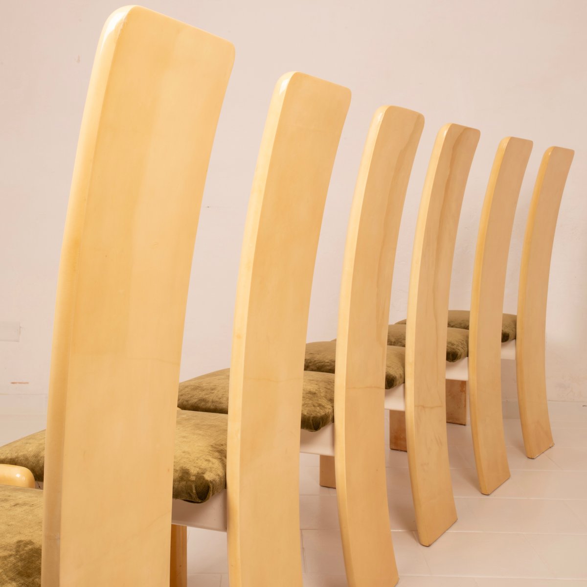 The seats have been reupholstered in green linen velvet, a choice that renews the seating while maintaining stylistic coherence with the original spirit. The velvet, soft to the touch and with its iridescent surface, creates a refined chromatic contrast with the light parchment, reinforcing the sophisticated identity of the ensemble.