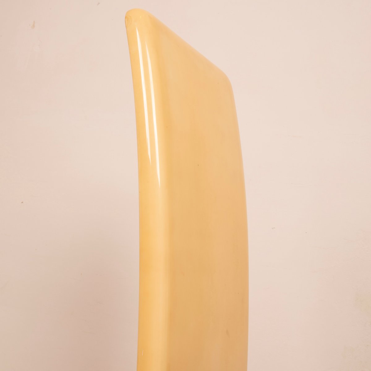 The design is distinguished by its high, slightly curved backrest, which lends momentum and verticality to the form, accentuating the tension between the clean lines and the imposing presence of the chair. The legs, seamlessly integrated into the chair's volume, reinforce its sculptural appearance, making the structure visually solid yet elegant.