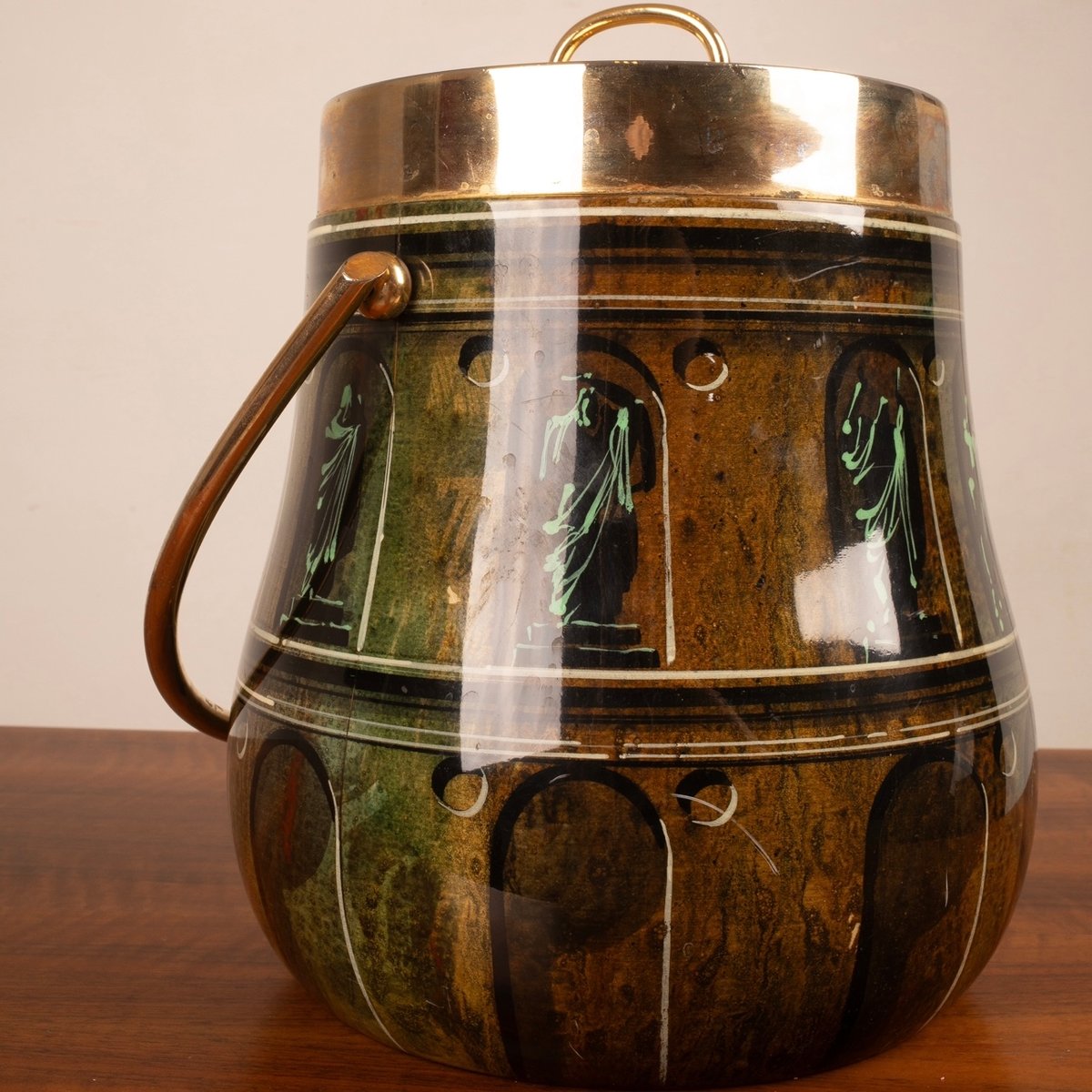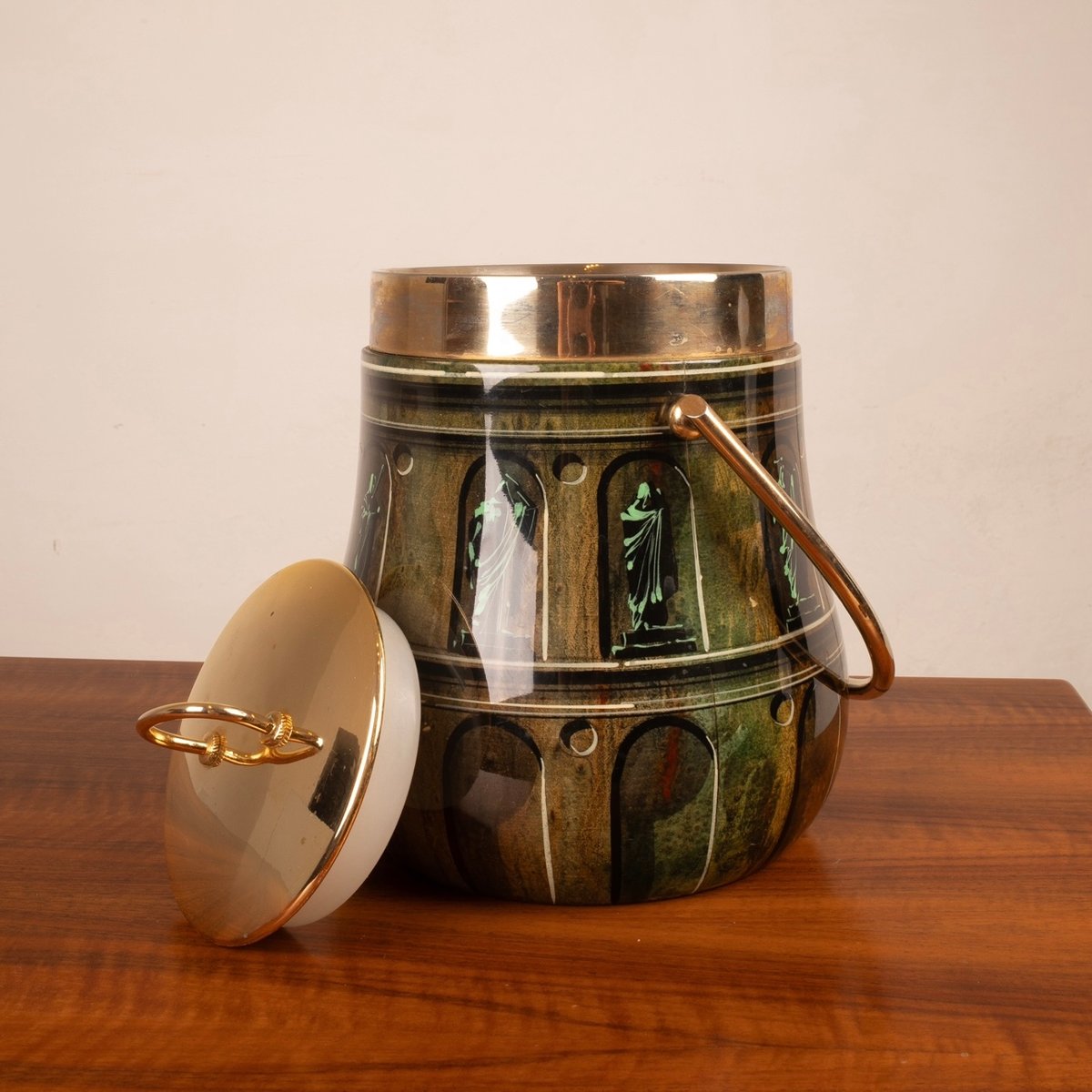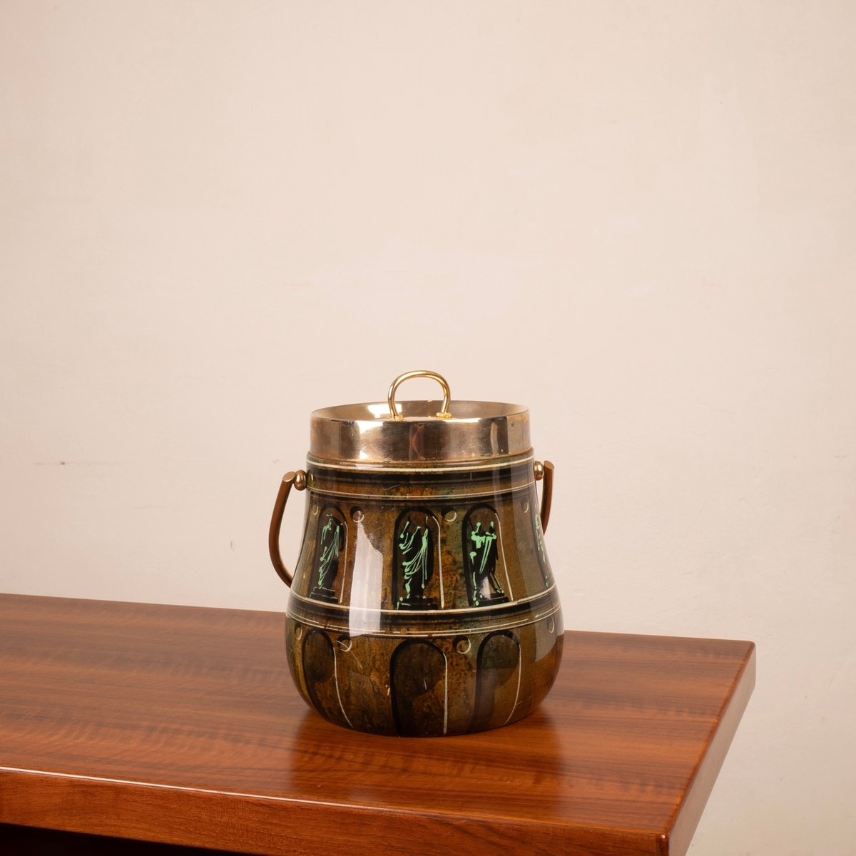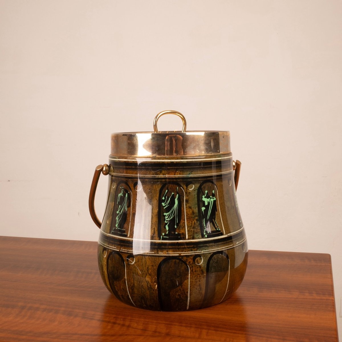 Distinctive Design: Sinuous body slightly flared towards the base, parchment lining in warm green-brown shades, hand-painted figurative decorations depicting stylized figures within classical arches, gilded metal lid with ring handle and curved brass side handle