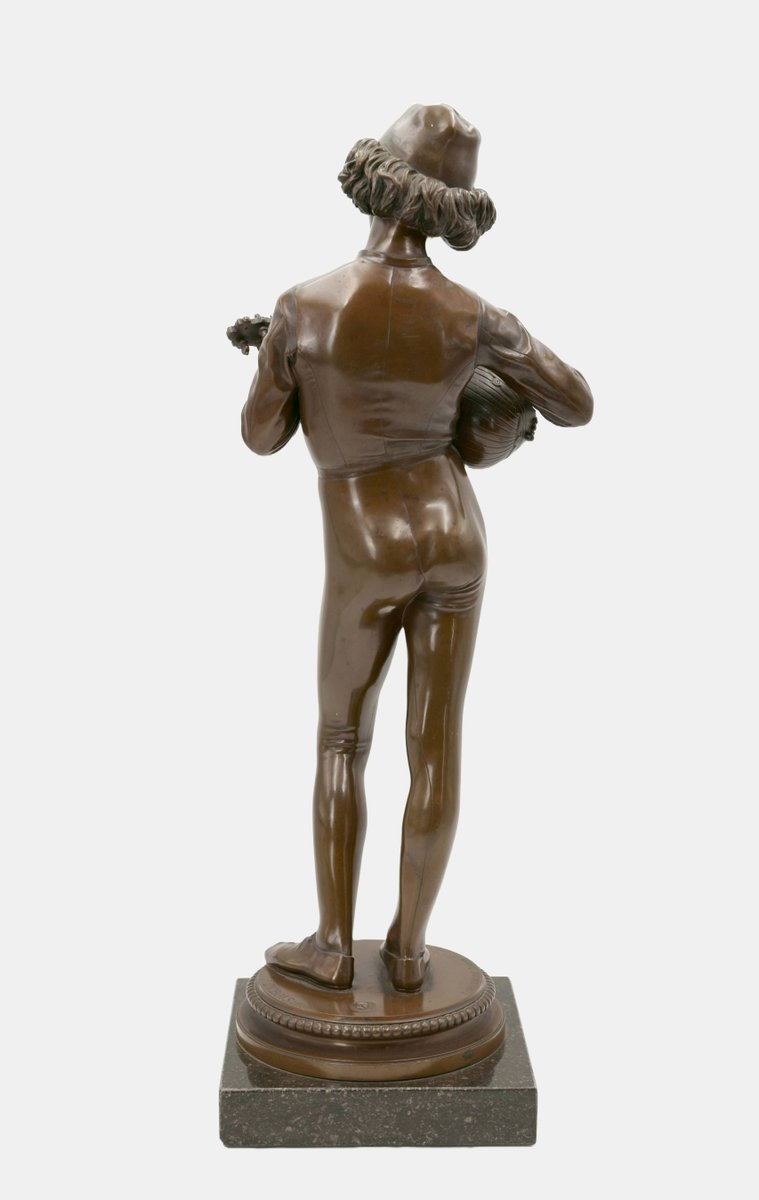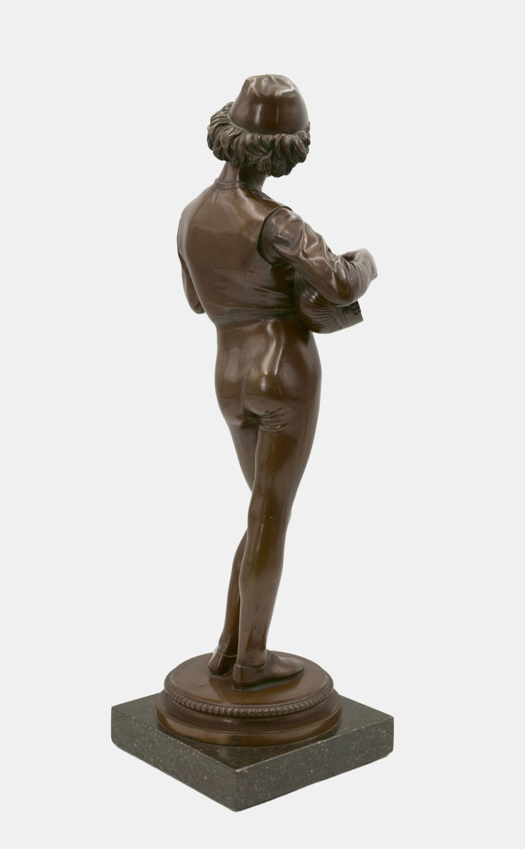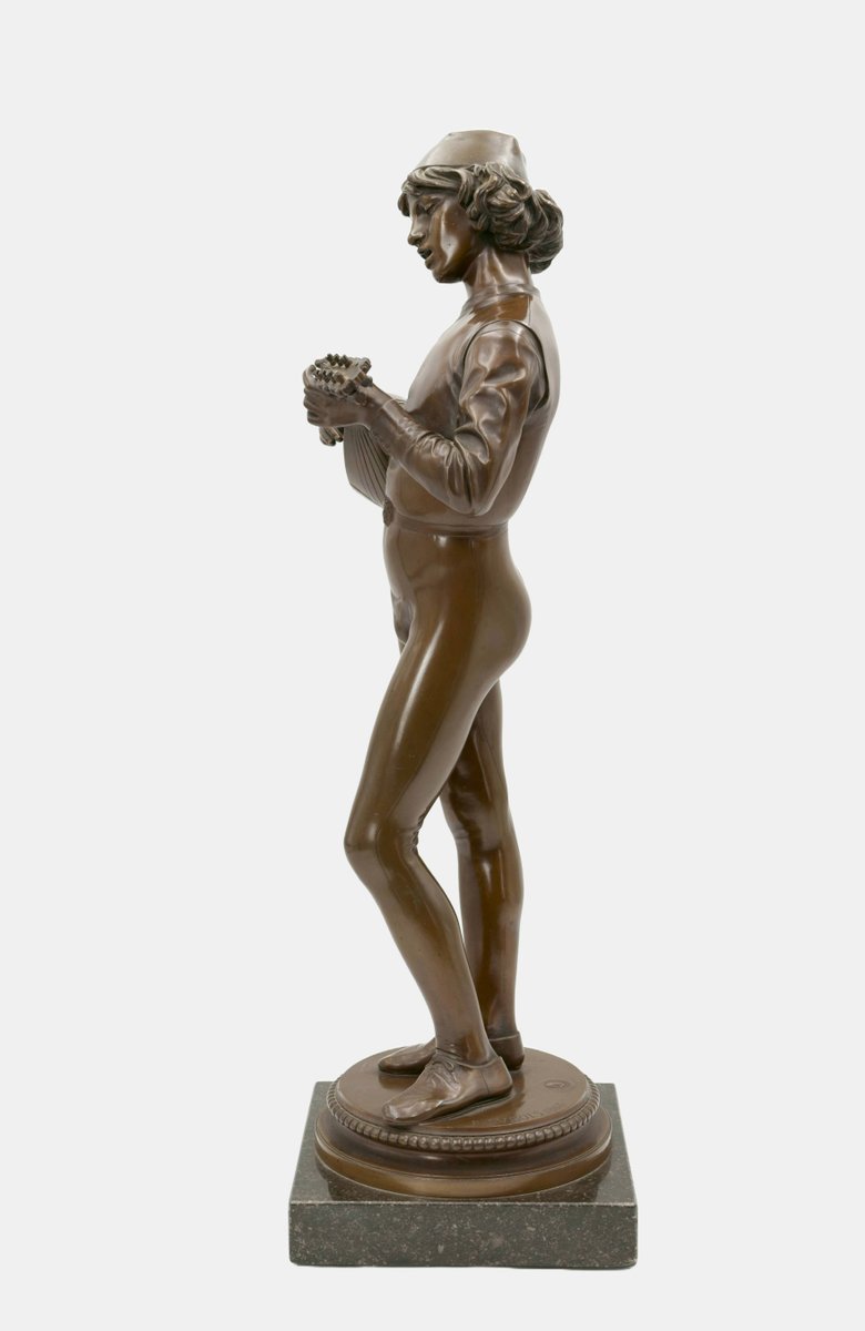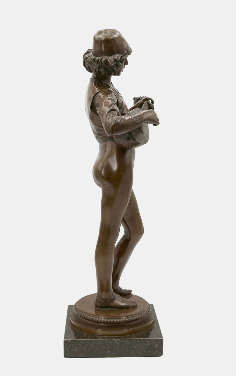 The bronze is a precisely executed and masterfully cast contemporary reduction of Paul Dubois 155 cm tall masterpiece "Florentine Singer", which is exhibited in the Musée d'Orsay and for which the artist was awarded the Medal of Honor at the Paris Salon in 1865. The work acted as a beacon, and was followed by a plethora of depictions of juveniles.