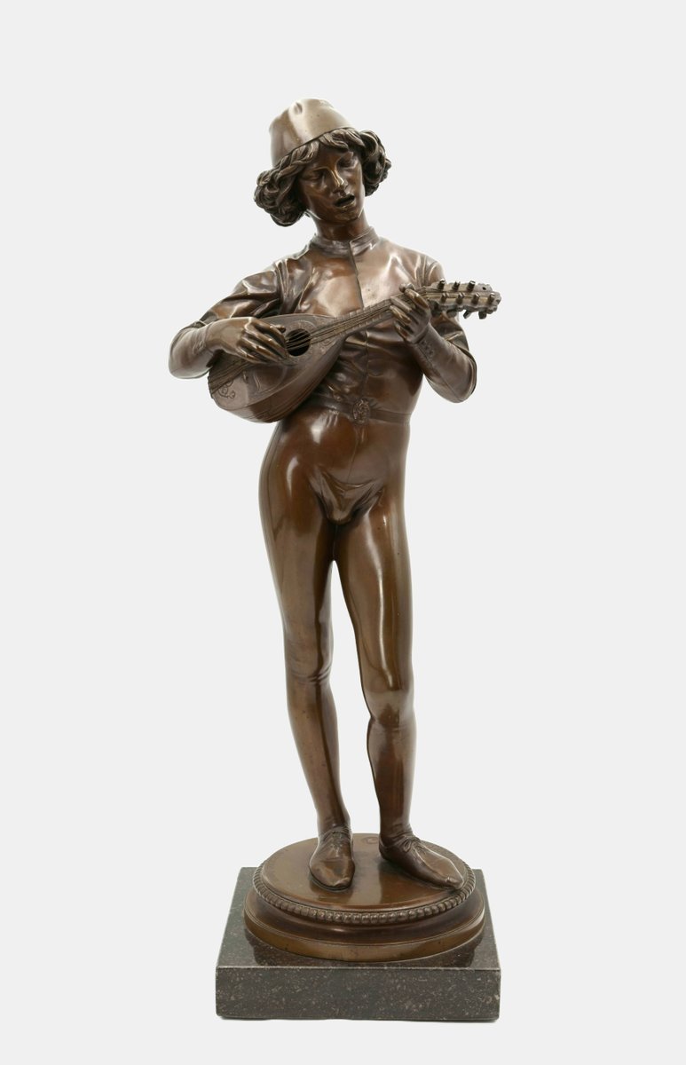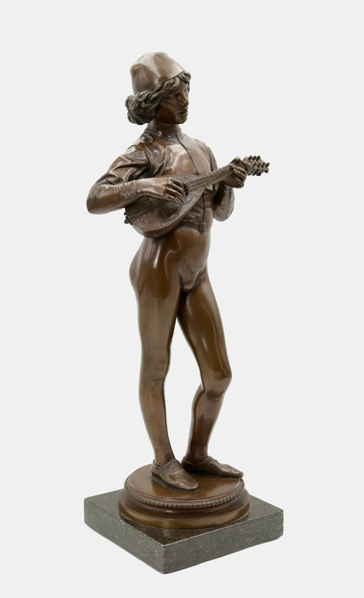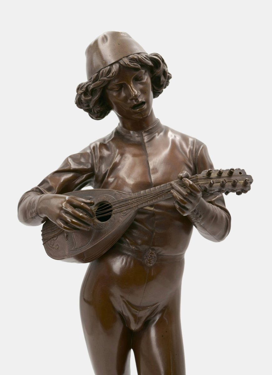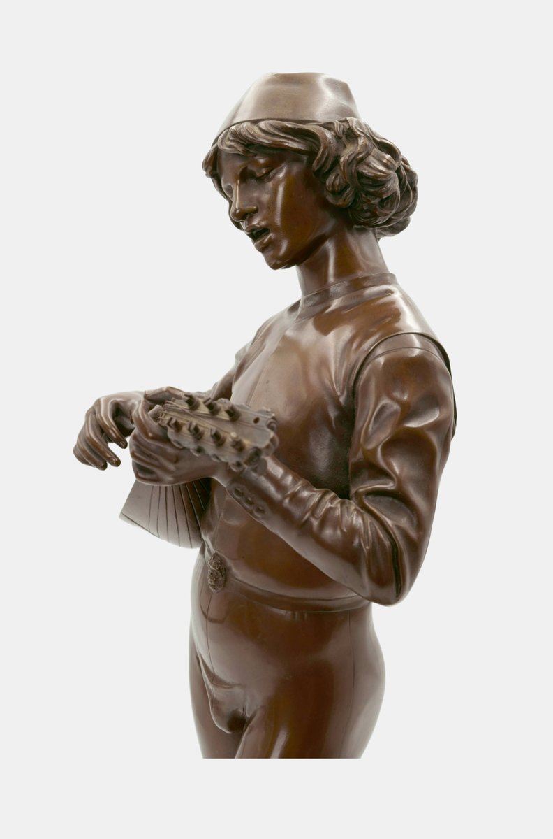 Dubois takes on the most difficult of all subjects, the depiction of singing through silent sculpture. He was preceded in this by Luca della Robbia and Donatello with their pulpits of singers created in the 1430s in the Museo dell'Opera del Duomo in Florence. Compared to these works, the physiognomy of Dubois singer is far less animated, yet he also depicts singing in a convincing manner. He uses the whole body. He takes the ancient contrapposto, which was essential to Renaissance sculpture, and transforms the standing leg-playing posture into a late medieval S-swing, giving the body an elegant beauty and at the same time setting it in melodic motion. In the equally elegant finger position, the music is expressed in a much more literal way with the beating of the lute. Finally, the musicality of the sculpture culminates in the face with the mouth open to sing.