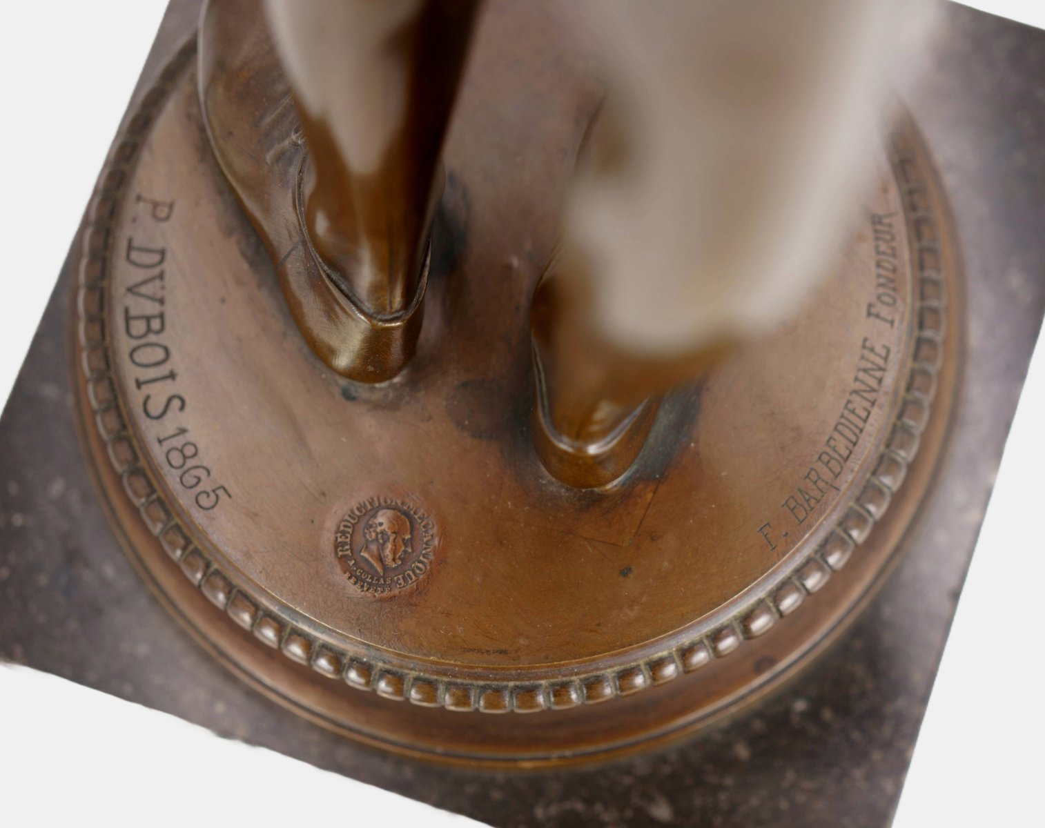 Paul Dubois (1829 Nogent-sur-Seine - 1905 Paris), Florentine singer, 1865. Light brown patinated bronze with cast round plinth mounted on a square marble base (3.5 cm high). Total height 53 cm. Bronze dimensions: 49.5 cm (height) x 20 cm (length) x 10 cm (width), weight 5.6 kg. Inscribed on the plinth "P.[aul] DUBOIS", dated "1865", with the foundry's mark "F. BARBEDIENNE FONDEUR" and the signet "REDUCTION MECANIQUE A. COLLAS".