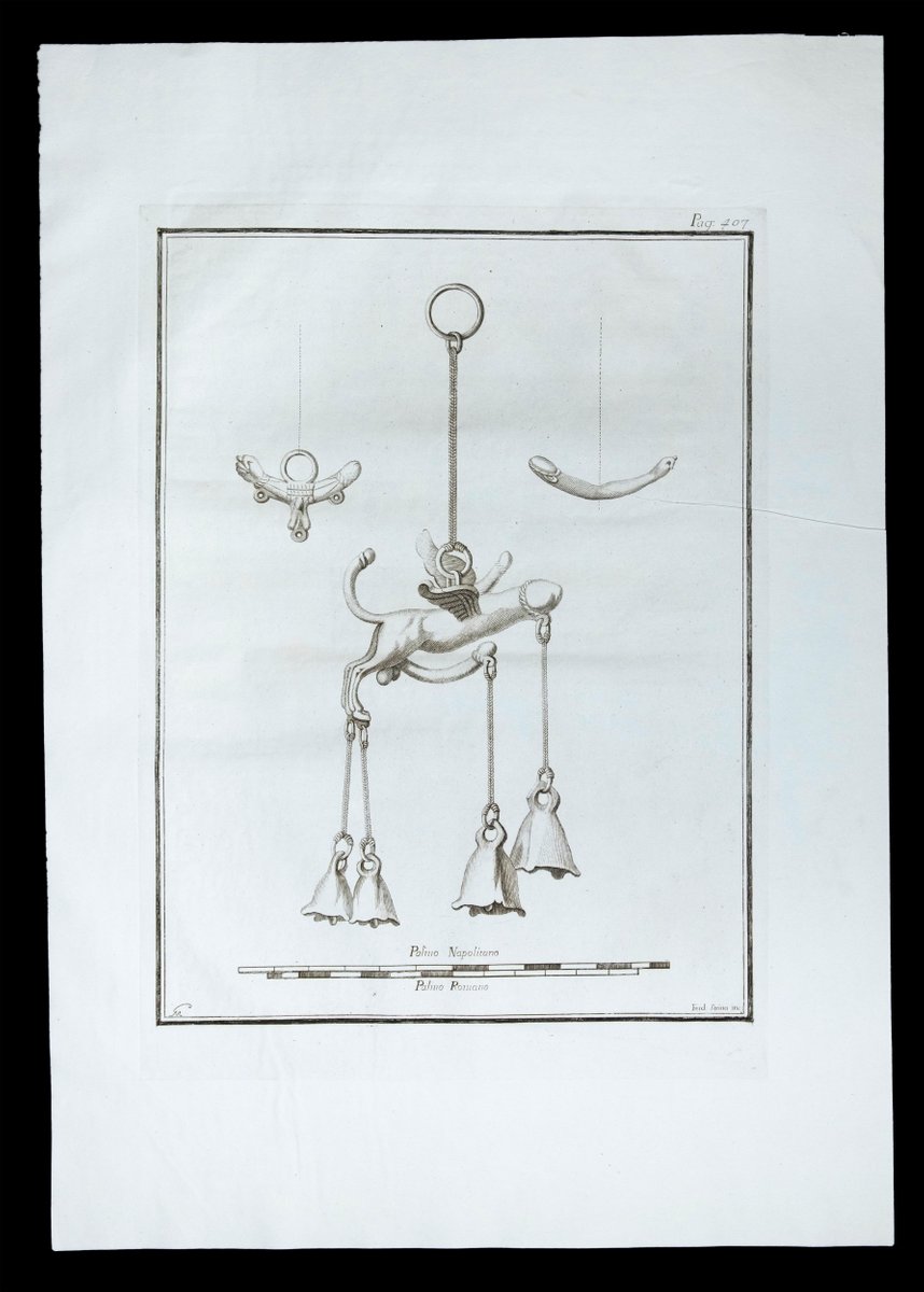 Phallus fascinum in ancient Roman religion, from the series "Antiquities of Herculaneum", is an original etching on paper realized in the 18th century. Signed on the plate, on the lower right: Ferd, Strina inc. Good conditions with slight folding. The etching belongs to the print suite “Antiquities of Herculaneum Exposed” (original title: “Le Antichità di Ercolano Esposte”), an eight-volume volume of engravings of the finds from the excavation of the ruins of Herculaneum in the Kingdom of Naples (now Campania, Italy). It was published between 1757 and 1792 by the Regia Stamperia, and copies were delivered to selected recipients across Europe. Despite the title, the Antiquity of Herculaneum shows objects from all the excavations undertaken by the Bourbons in the Gulf of Naples. These include Pompeii, Stabia and two sites of Herculaneum: Resina and Portici. The Bourbon King Carlo appointed fifteen scholars creating a new “Herculaneum Academy” to study the artifacts and publish the results of the archaeological excavations of the sites. The engravings are of high quality and the accompanying text shows a large scholarship. They were realized by 25 prominent artists involved by the King to prepare drawings and engravings on the finds, among which we can find Giovanni Elia Morghen, Carlo Nolli, Luigi Vanvitelli and Giovanni Battista Casanova. The “Antiquities” was designed more to amaze readers with the quality of the objects in the collection of the King of Naples than to be used in research., following and increasing the interest of 18th century society for the classical culture and Art in particular. Through the exaltation of the classical concept of proportions and harmony, the book was of inspiration to the neoclassical movement in Europe, giving artists and decorators access to a huge shop of Hellenistic motifs. Ref.: National Gallery (Washington), Mark J. Millard Architectural, IV (2000), no. 1; L. Garcia y Garcia, Nova bibliotheca pompeiana (2 v., 1998); Royal Institute of British Architects, British Architectural Library ... Early printed books, 1 (1994), no. 112. U. Pannuti, 'Incisori e disegnatori della Stamperia Reale di Napoli nel secolo XVIII: la pubblicazione delle Antichità di Ercolano', in Xenia antiqua, 9 (2000), p. 151-178; V. Trombetta, 'L'edizione de Le Antichità di Ercolano esposte' in Rendiconti dell'Accademia di Archeologia, lettere e belle arti di Napoli , 59 (1984), p.151-172.