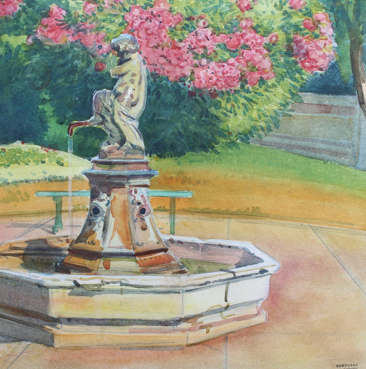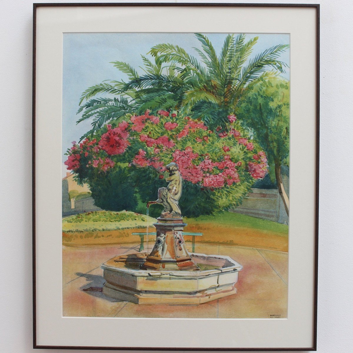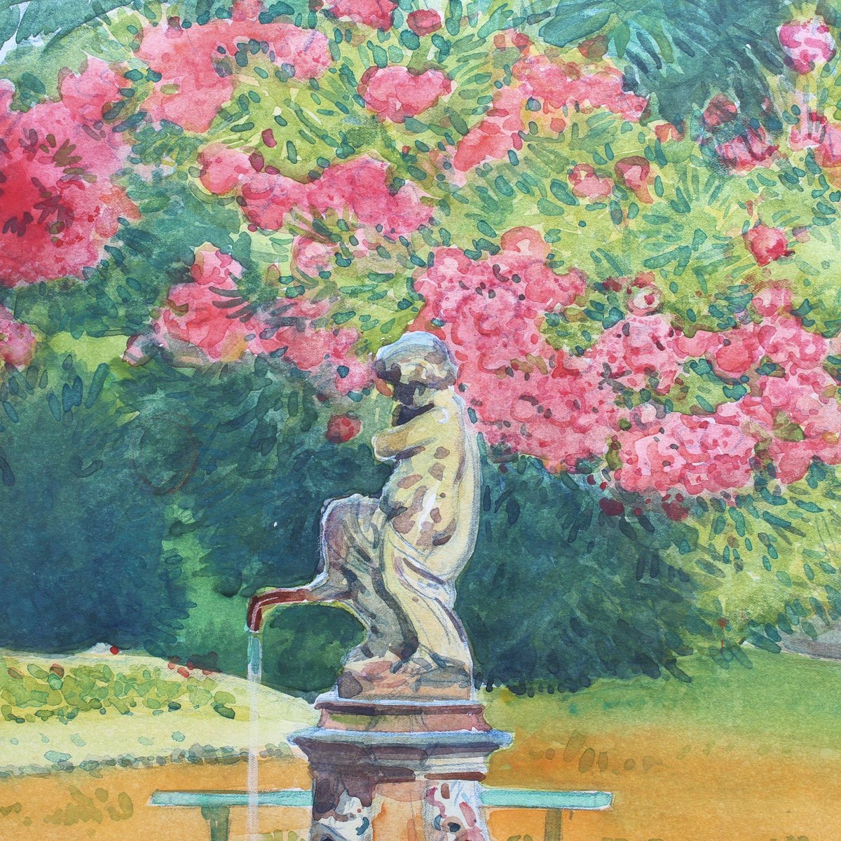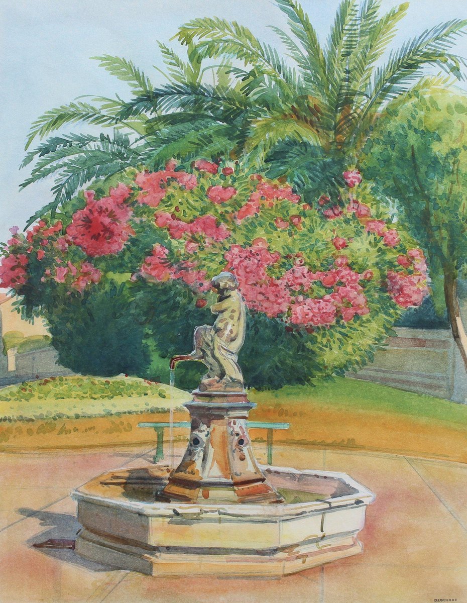Pink Laurels in the Park, Côtes d'Azur', watercolour on art paper, by Tony Minartz (circa 1930s). The French Riviera is known for its beautiful parks, particularly in Nice, Menton, Eze, Antibes and St. Raphael. Although a thorough online search was made, this gallery was unable to pinpoint the fountain and associate it with a particular park in the Côtes d'Azur. After the artist's Parisian phase, he moved to the South of France to capture the light, nature and sea for which this area is renowned. Like the other watercolour held by this gallery by the same artist, t he viewer is invited in to sit, relax and take in the fresh air of this colourful park. The artist's keen eye for detail combined with his use of masterful brushstrokes created this atmospheric artwork that transports the viewer to a better place. That is always a good thing. The painting has been professionally cleaned and preserved, then framed and glazed leaving it in good overall condition. It is stamped in the lower right hand corner. Provenance is a sale of the artist's atelier (Daguerre, May 2010). Upon request a video of the piece may be provided. About the Artist : Antoine Guillaume (Tony) Minartz (1870-1944) was a self-taught painter. He created a significant body of work, particularly of skilfully rendered sketches and watercolours, which may be divided into two main series: Parisian life and society, and landscapes of the Côte-d’Azur. On the Côte-d’Azur, his sketches trace an itinerary between St-Tropez and Cannes, by way of Nice and Monaco, and extending even to Venice. He depicted ports crowded with yachts and other boats, the beaches and their pleasant bustle. The Parisian subjects mostly date from pre-WWI, while the post-WWI subjects tend to be of fashionable life on the Côte d’Azur. He was most known for his interpretations of Parisian life, of the Belle Époque through to the excesses of the 1930s. He illustrated the vicissitudes of society life, and was a faithful chronicler of its parties, the casino, cabaret, circus shows and their backstage goings-on, the music-hall, the Opéra and its ballets. He showed in collective exhibitions from 1896 to 1914, most notably at the Salon de la Société Nationale des Beaux-Arts , of which he became an associate member in 1901. Dimensions with Frame : H 60 cm / 23.6'' W 49.5 cm / 19.5'' Dimensions without Frame : H 49.5 cm / 19.5'' W 39 cm / 15.4''