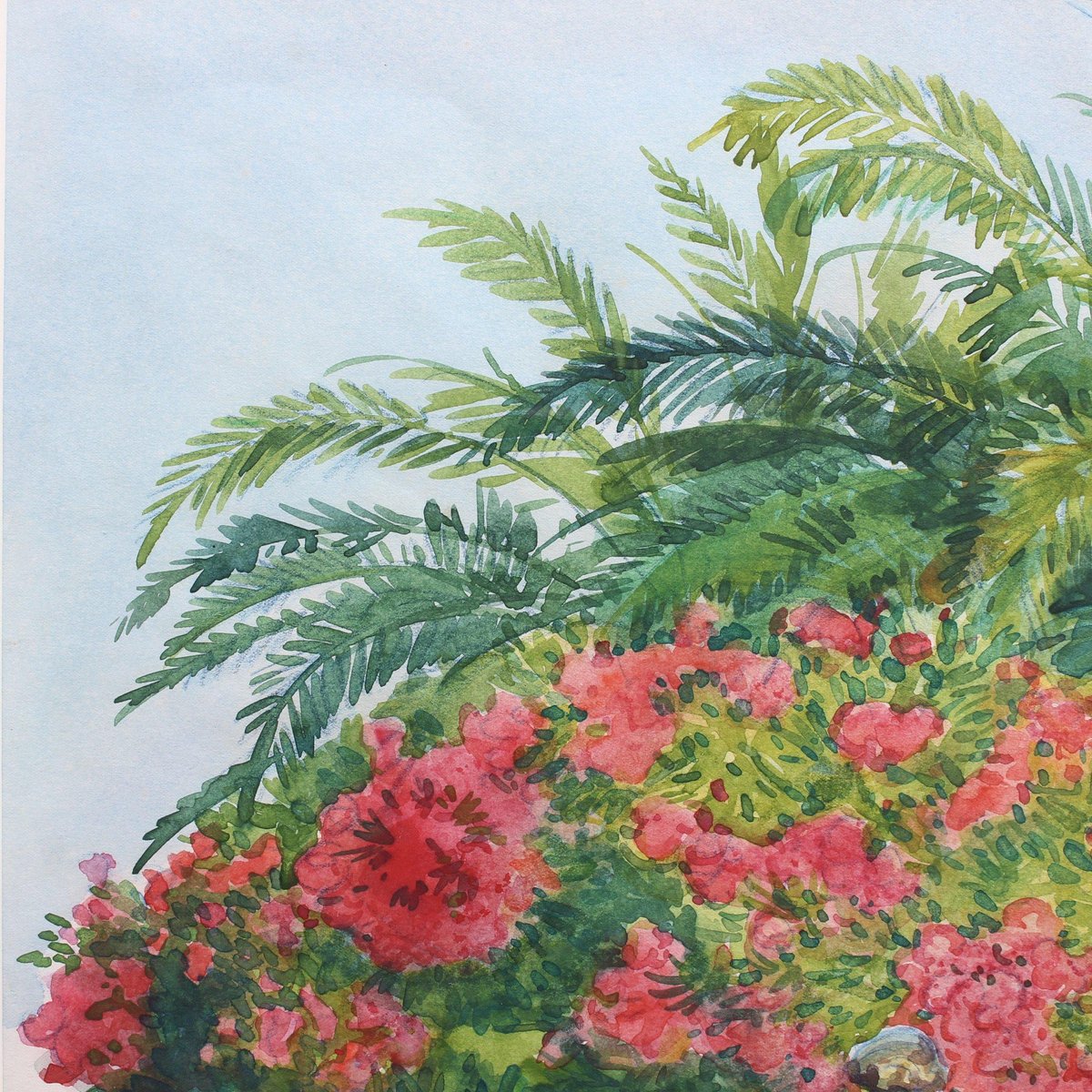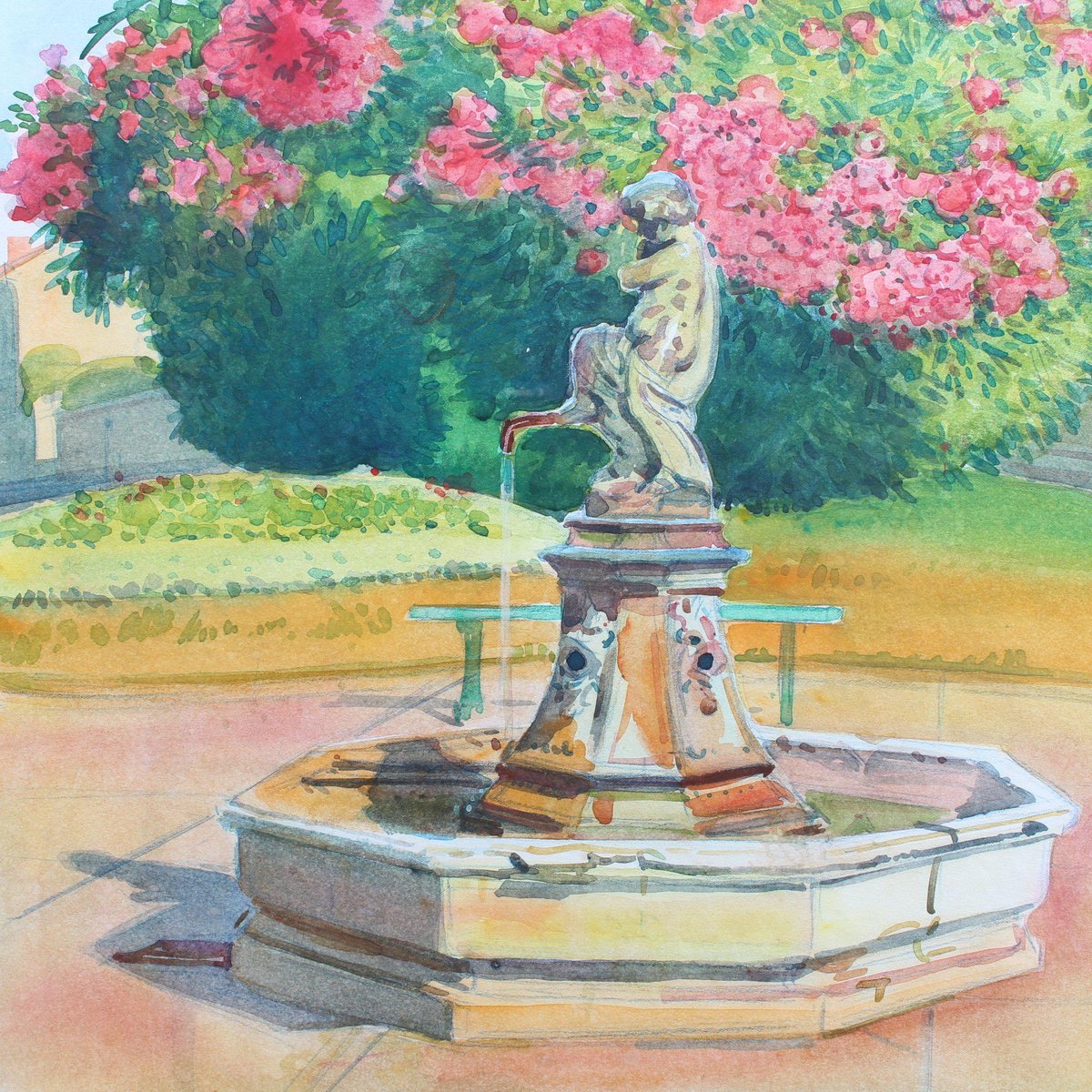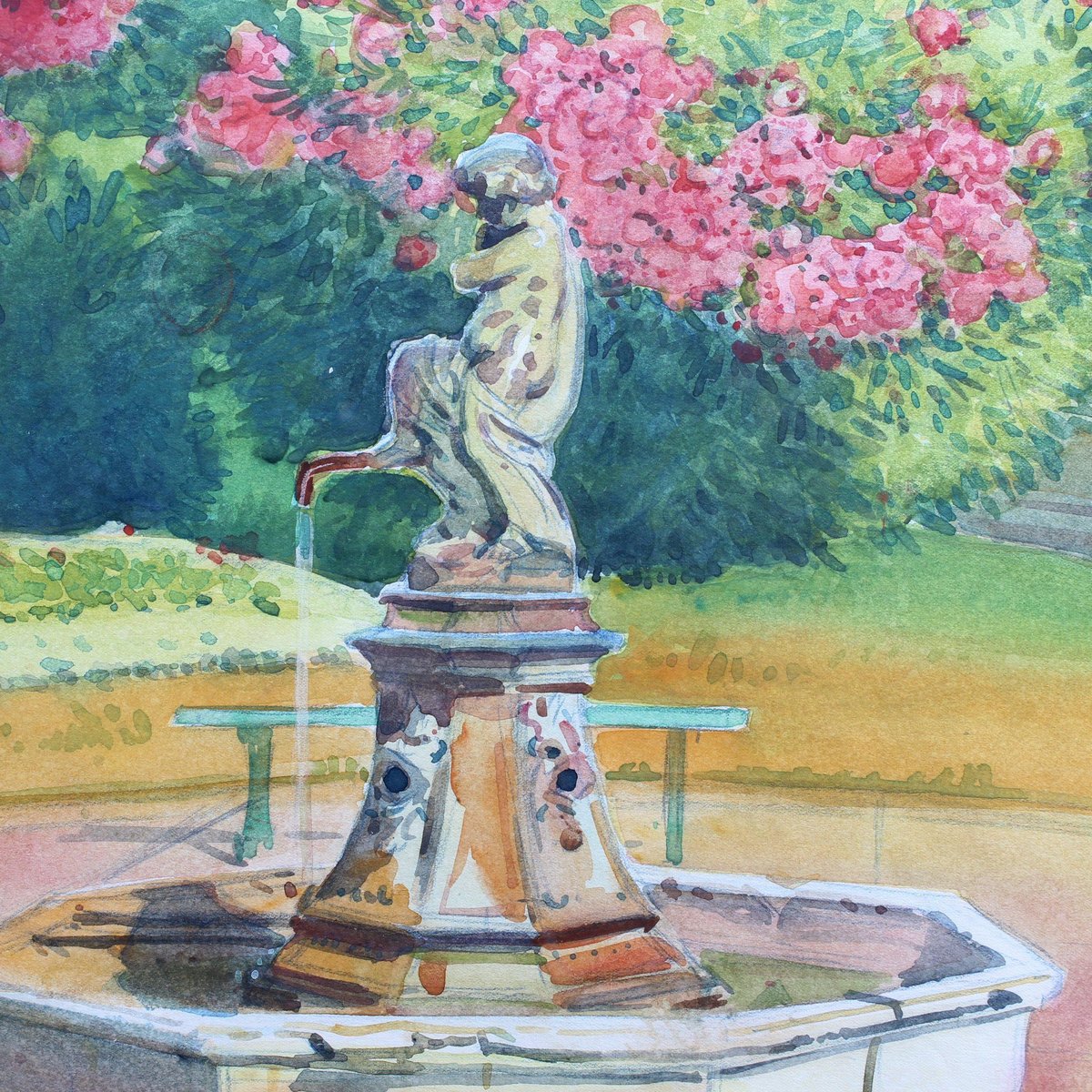 Pink Laurels in the Park, Côtes d'Azur', watercolour on art paper, by Tony Minartz (circa 1930s). The French Riviera is known for its beautiful parks, particularly in Nice, Menton, Eze, Antibes and St. Raphael. Although a thorough online search was made, this gallery was unable to pinpoint the fountain and associate it with a particular park in the Côtes d'Azur. After the artist's Parisian phase, he moved to the South of France to capture the light, nature and sea for which this area is renowned. Like the other watercolour held by this gallery by the same artist, t he viewer is invited in to sit, relax and take in the fresh air of this colourful park. The artist's keen eye for detail combined with his use of masterful brushstrokes created this atmospheric artwork that transports the viewer to a better place. That is always a good thing. The painting has been professionally cleaned and preserved, then framed and glazed leaving it in good overall condition. It is stamped in the lower right hand corner. Provenance is a sale of the artist's atelier (Daguerre, May 2010). Upon request a video of the piece may be provided. About the Artist : Antoine Guillaume (Tony) Minartz (1870-1944) was a self-taught painter. He created a significant body of work, particularly of skilfully rendered sketches and watercolours, which may be divided into two main series: Parisian life and society, and landscapes of the Côte-d’Azur. On the Côte-d’Azur, his sketches trace an itinerary between St-Tropez and Cannes, by way of Nice and Monaco, and extending even to Venice. He depicted ports crowded with yachts and other boats, the beaches and their pleasant bustle. The Parisian subjects mostly date from pre-WWI, while the post-WWI subjects tend to be of fashionable life on the Côte d’Azur. He was most known for his interpretations of Parisian life, of the Belle Époque through to the excesses of the 1930s. He illustrated the vicissitudes of society life, and was a faithful chronicler of its parties, the casino, cabaret, circus shows and their backstage goings-on, the music-hall, the Opéra and its ballets. He showed in collective exhibitions from 1896 to 1914, most notably at the Salon de la Société Nationale des Beaux-Arts , of which he became an associate member in 1901. Dimensions with Frame : H 60 cm / 23.6'' W 49.5 cm / 19.5'' Dimensions without Frame : H 49.5 cm / 19.5'' W 39 cm / 15.4''
