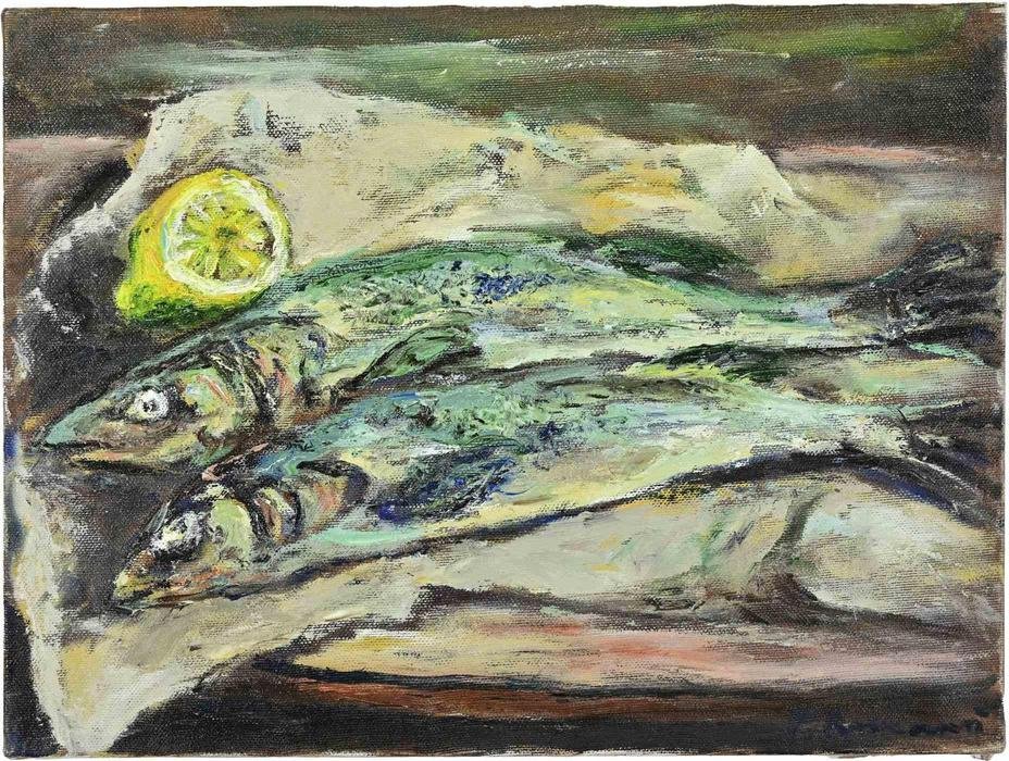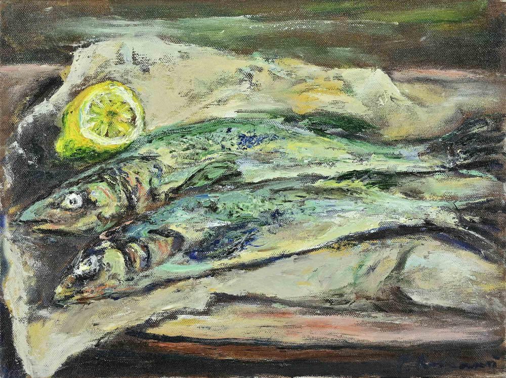 Pino Romanò, Still Life with Fishes and Lemon, Oil Painting, 1990s