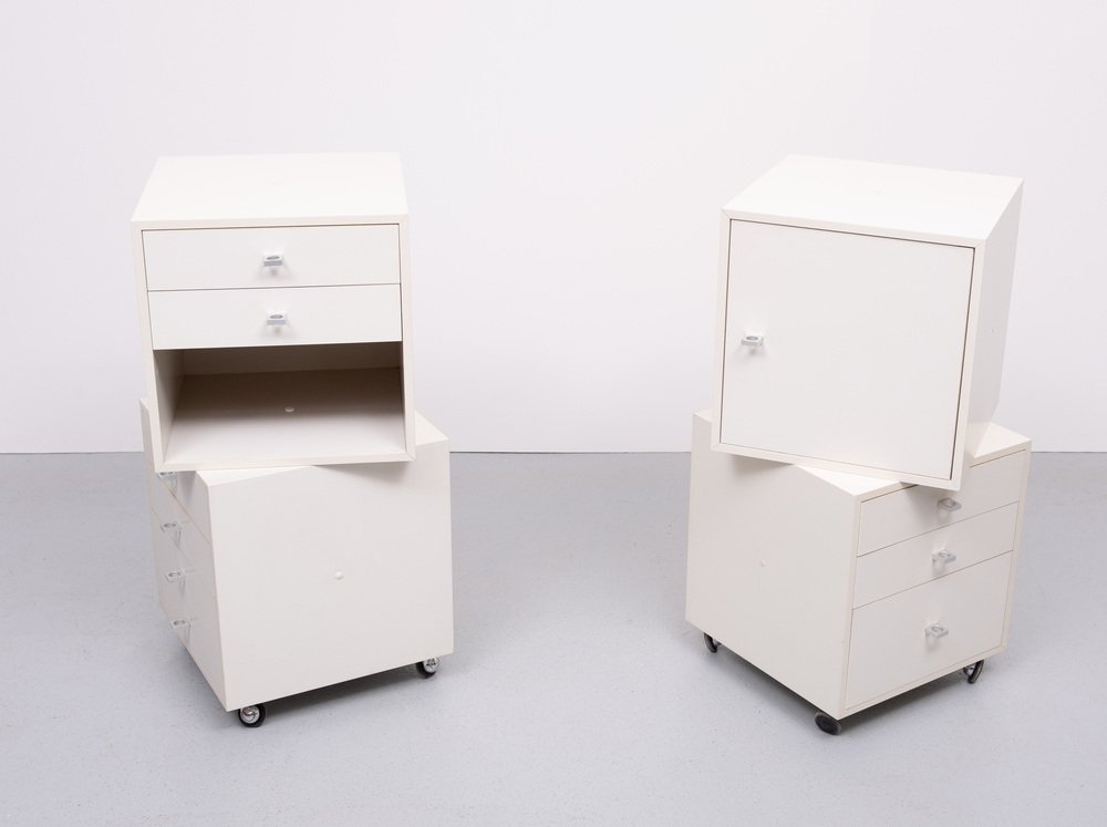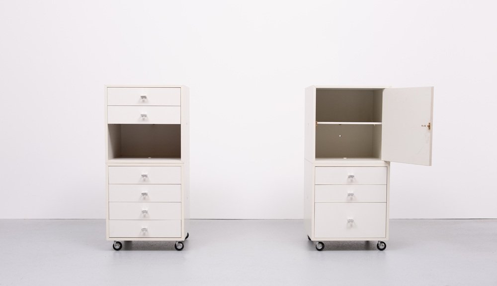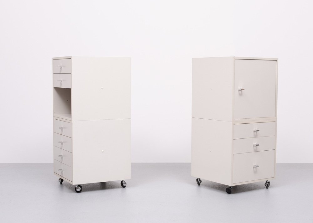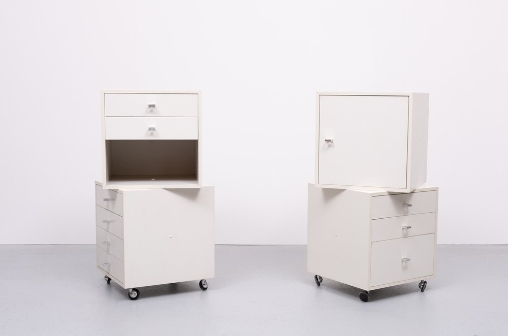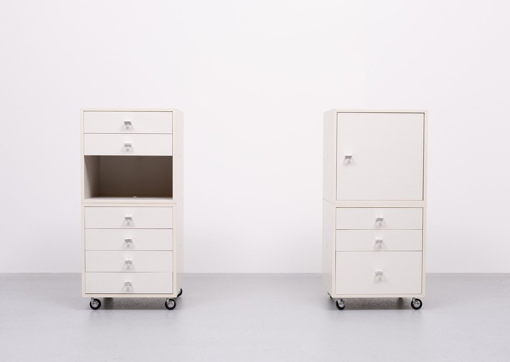 In 1848, Cees Braakman (1917-1995), D. L.’s son, took the helm as designer and director and furthered the company’s modernist aims, advocating for low-cost, modular designs inspired by the likes of Charles & Ray Eames and Alvar Aalto—the latter of which created the first series of Pastoe geometric cabinets at the end of the 1940s. During the 1950s, the company focused on developing flexible cabinet systems that could be assembled by the consumer, which led to the highly customizable, highly successful Made-to-Measure storage system (1955). In 1957, Made-to-Measure furniture was awarded a silver medal at the 11th Trienniale in Milan and crowned with the Le Signe d’Or in Belgium.