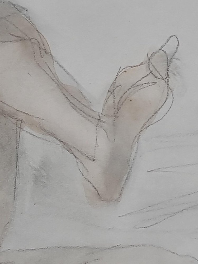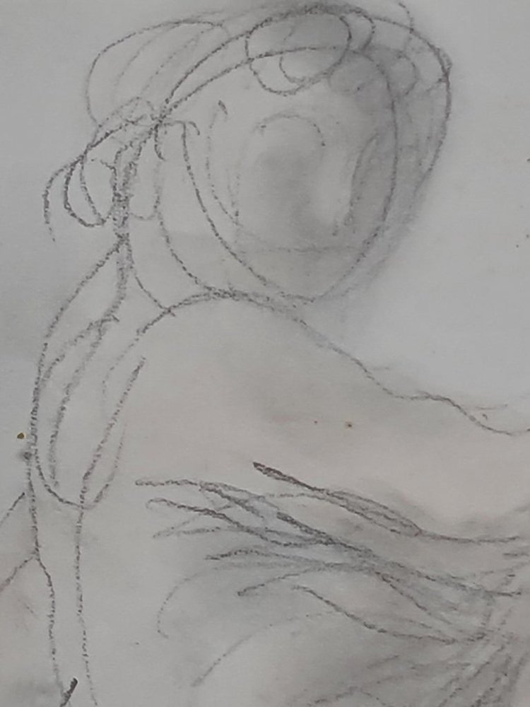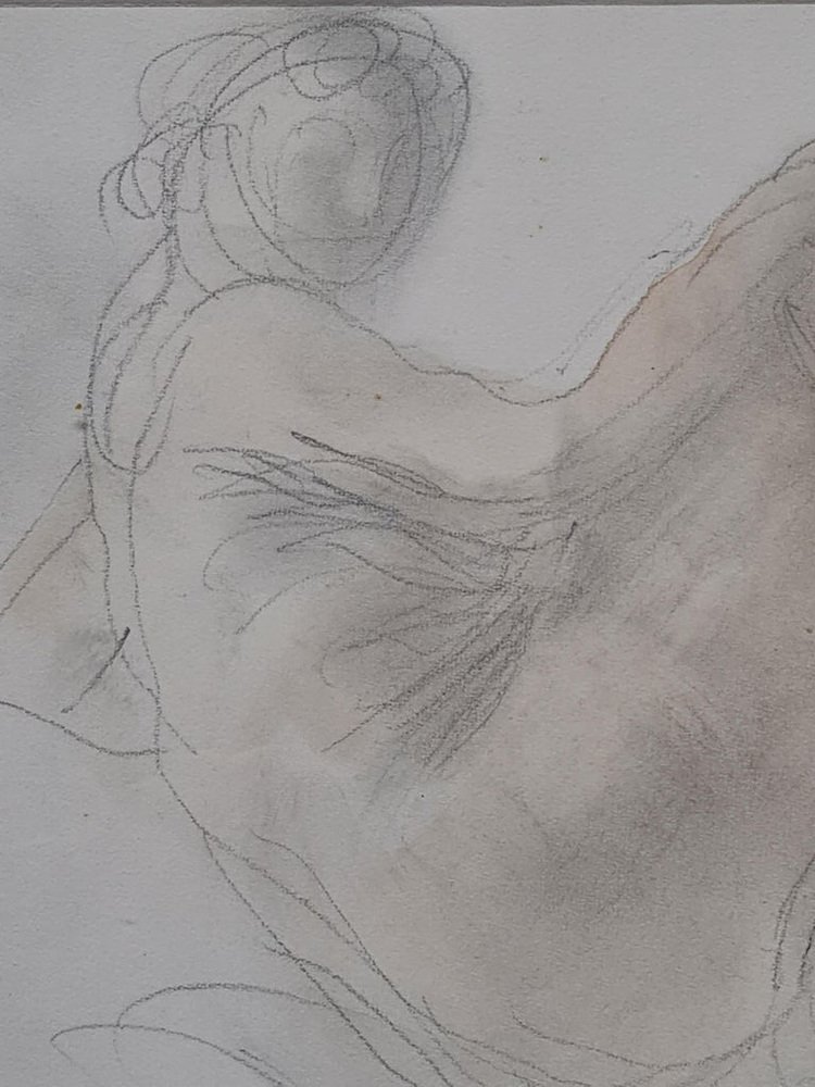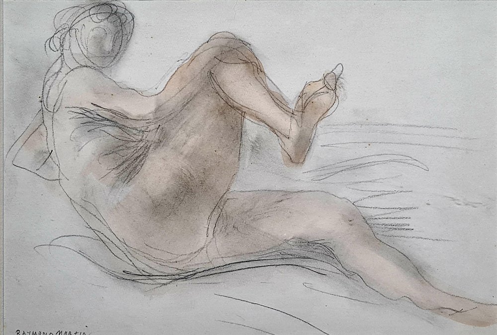 Drawing of a naked woman, French mid century pencil and watercolour on paper study by famous French sculptor Raymond Martin. The drawing is signed bottom left and is presented in a silvered frame with cut card mount under glass.