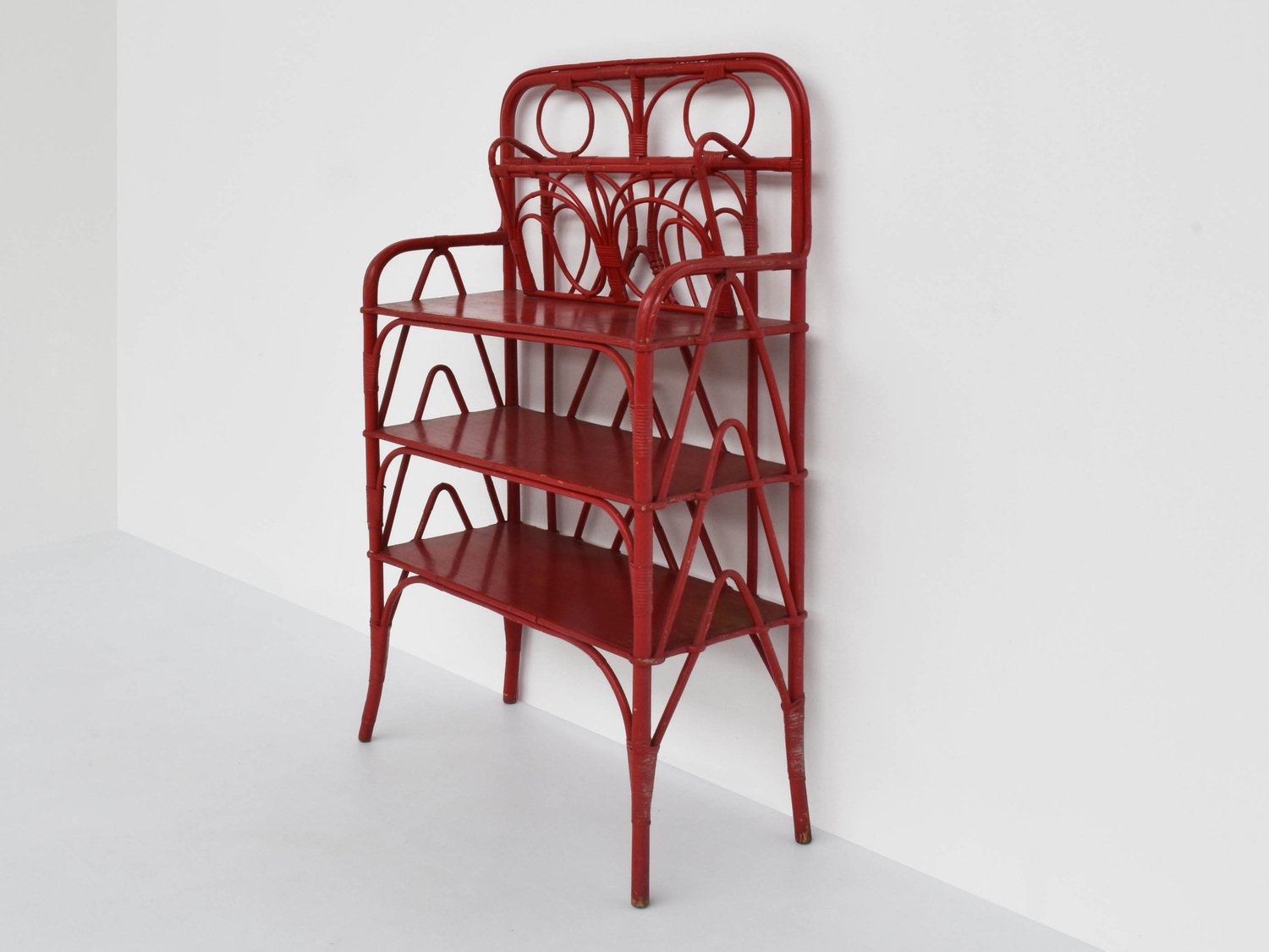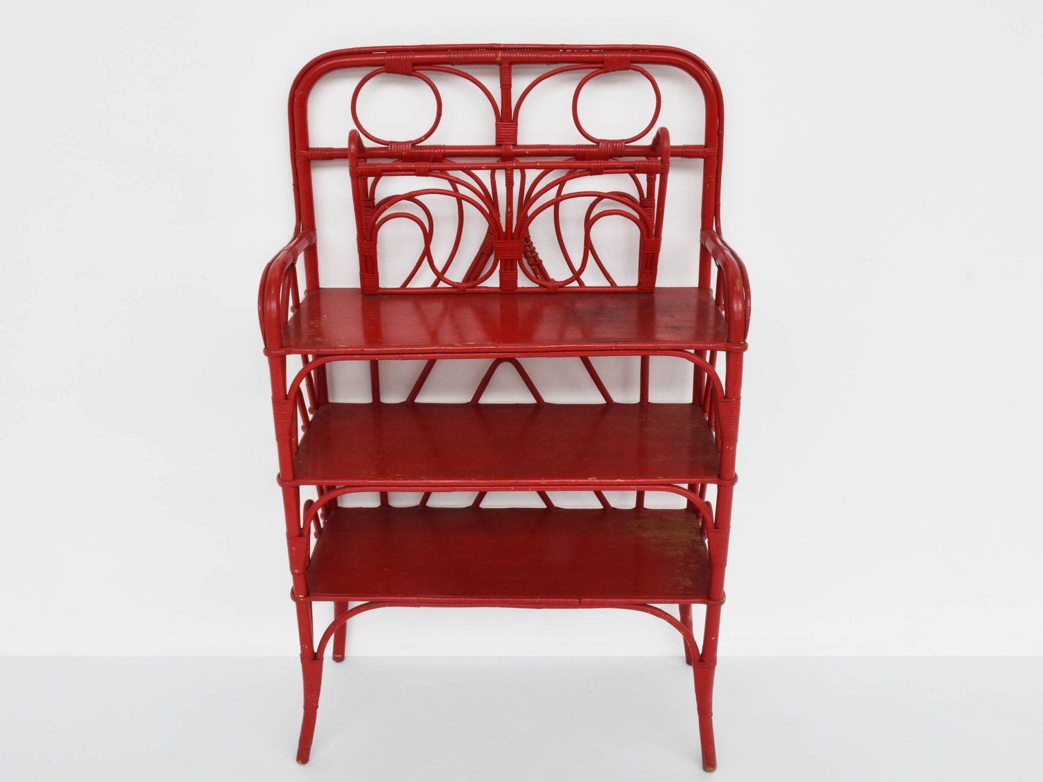 Red Painted Rattan Bookcase with Butterfly Magazine Holder by Renzo Morgiardino, 1930s