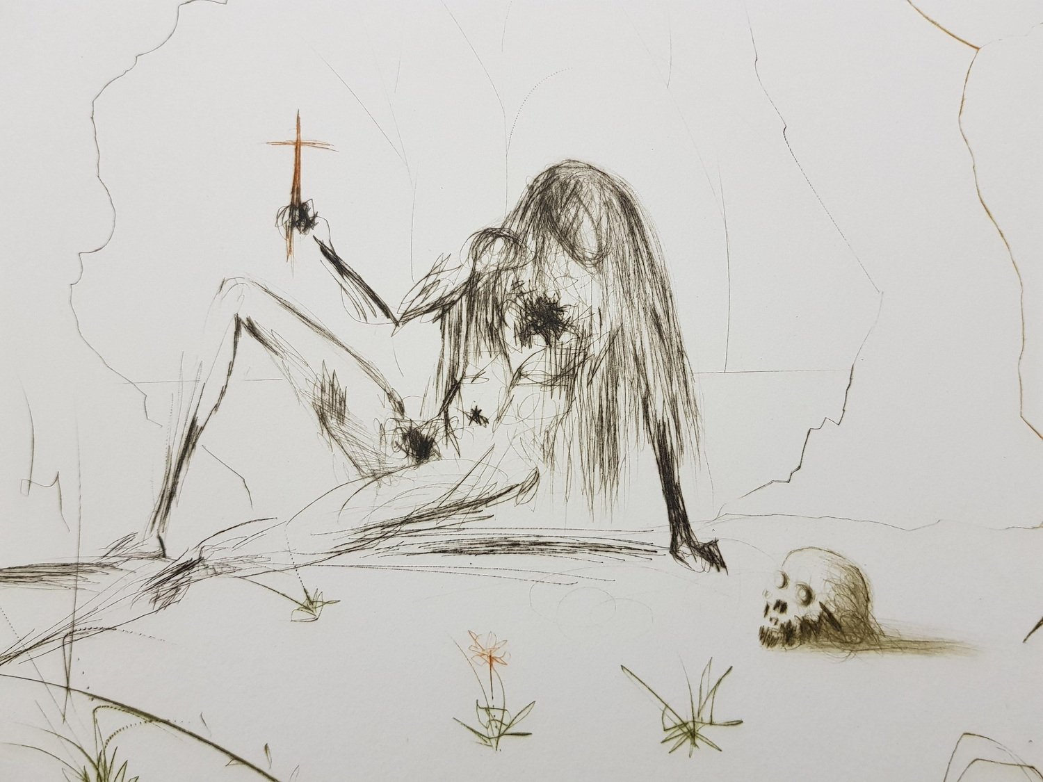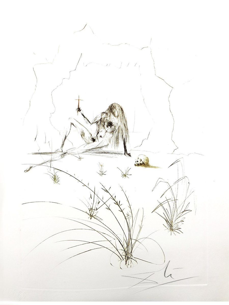 Salvador Dali - Brother Ogrin, The Hermit - Original Etching Dimensions: 45 x 33 cm Edition: 125 1970 Signed in pencil. On Arches Vellum References : Field 70-10 (p. 60-61) Salvador Dali Salvador Dali was born as the son of a prestigious notary in the small town of Figueras in Northern Spain. His talent as an artist showed at an early age and Salvador Felipe Jacinto Dali received his first drawing lessons when he was ten years old. His art teachers were a then well known Spanish impressionist painter, Ramon Pichot and later an art professor at the Municipal Drawing School. In 1923 his father bought his son his first printing press. Dali began to study art at the Royal Academy of Art in Madrid. He was expelled twice and never took the final examinations. His opinion was that he was more qualified than those who should have examined him. In 1928 Dali went to Paris where he met the Spanish painters Pablo Picasso and Joan Miro. He established himself as the principal figure of a group of surrealist artists grouped around Andre Breton, who was something like the theoretical ''schoolmaster'' of surrealism. Years later Breton turned away from Dali accusing him of support of fascism, excessive self-presentation and financial greediness. By 1929 Dali had found his personal style that should make him famous the world of the unconscious that is recalled during our dreams. The surrealist theory is based on the theories of the psychologist Dr. Sigmund Freud. Recurring images of burning giraffes and melting watches became the artist's surrealist trademarks. His great craftsmanship allowed him to execute his paintings in a nearly photo-realistic style. No wonder that the artist was a great admirer of the Italian Renaissance painter Raphael. Salvador Dali and Gala. Meeting Gala was the most important event in the artist's life and decisive for his future career. She was a Russian immigrant and ten years older than Dali. When he met her, she was married to Paul Eluard. Gala decided to stay with Dali. She became his companion, his muse, his sexual partner, his model in numerous art works and his business manager. For him she was everything. Most of all Gala was a stabilizing factor in his life. And she managed his success in the 1930s with exhibitions in Europe and the United States. Gala was legally divorced from her husband in 1932. In 1934 Dali and Gala were married in a civil ceremony in Paris and in 1958 in church after Gala's former husband had died in 1952. However from around 1965 on, the couple was seen less frequently together. But Gala continued to manage Dali's business affairs. 1933 Salvador Dali had his first one-man show in New York. One year later he visited the U.S. for the first time supported by a loan of US$500 from Pablo Picasso. To evade World War II, Dali chose the U.S.A. as his permanent residence in 1940. He had a series of spectacular exhibitions, among others a great retrospective at the Museum of Modern Art in New York. Besides creating a number of great paintings, Dali caused the attention of the media by playing the role of a surrealist clown. He made a lot of money and was contemptuously nicknamed Avida Dollars (greedy for dollars) by Andre Breton. Dali became the darling of the American High Society. Celebrities like Jack Warner or Helena Rubinstein gave him commissions for portraits. His art works became a popular trademark and besides painting he pursued other activities - jewelry and clothing designs for Coco Chanel or film making with Alfred Hitchcock. The Classic Period After World War II In 1948 Dali and Gala returned to Europe, spending most of their time either in their residence in Lligat or Spain or in Paris or France or in New York. Dali developed a lively interest in science, religion and history. He integrated things into his art that he had picked up from popular science magazines. Another source of inspiration were the great classical masters of painting like Raphael, Velasquez or the French painter Ingres. The artist commented his shift in style with the words: ''To be a surrealist forever is like spending your life painting nothing but eyes and noses.'' In 1958 the artist began his series of large sized history paintings. He painted one monumental painting every year during the summer months in Lligat. The most famous one, The Discovery of America by Christopher Columbus, can be seen at the Dali Museum in St. Petersburg in Florida. It is breath-taking. The artist's late art works combine more than ever his perfect and meticulous painting technique with his fantastic and limitless imaginations. Salvador Dali is the only known artist who had two museums dedicated exclusively to his works at lifetime. Dali Museum in St. Petersburg, Florida The Dali Museum in St. Petersburg in Florida or U.S.A. was founded in 1971 by the Dali collector A. Reynolds Morse and his wife Eleanor. The collection was first exhibited in a building adjacent to their home in Cleveland/Ohio. In 1982, the museum was moved to St. Petersburg in Florida. It hosts 95 oil paintings including six of Dali's eighteen large-sized historical paintings. Dali Museum-Theater in Figueres, Spain. The Dali Museum-Theater in Figueres, Spain was the former Municipal Theater of Figueres. In 1918, when Salvador Dali was only fourteen years old, it had shown his first public exhibition. Since 1970 the artist had dedicated his energy to transform the former Municipal Theater into a museum and art gallery. In 1974 the Theatro Museo Dali was officially opened. 1980 Dali was forced to retire due to palsy, a motor disorder, that caused a permanent trembling and weakness of his hands. He was not able to hold a brush any more. The fact that he could not follow his vocation and passion of painting and the news of Gala's death in 1982 left him with deep depressions. After Gala's death he moved to Pubol, a castle, he had bought and decorated for Gala. In 1984, when he was lying in bed, a fire broke out and he suffered s